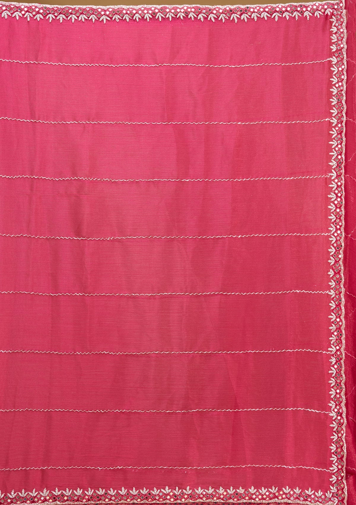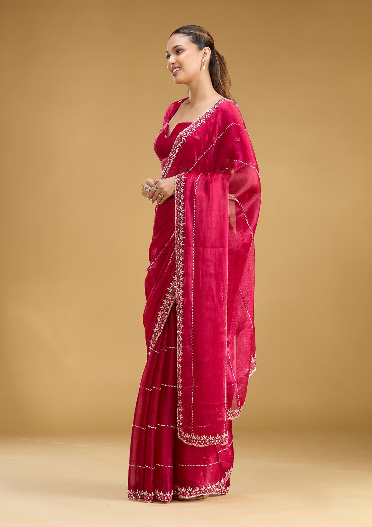 Rani Pink Saree in Tissue fabric. The Saree is elevated with Cutdana embroidery. It comes with an Unstitched blouse. Comes with the Koskii promise of premium quality.
