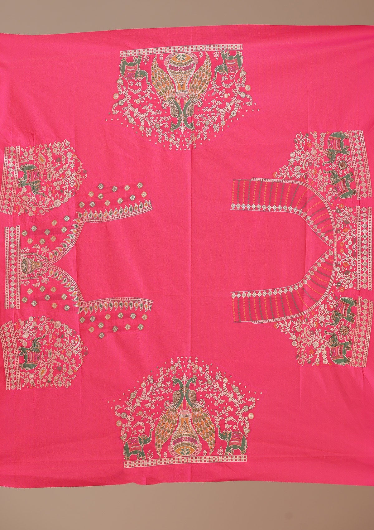 Rani Pink Semi-Stitched Lehenga in Banarasi fabric. The Lehenga is embellished with Stonework embroidery. Accompanied with an Semi-Stitched blouse and dupatta. Comes with the Koskii promise of premium quality.