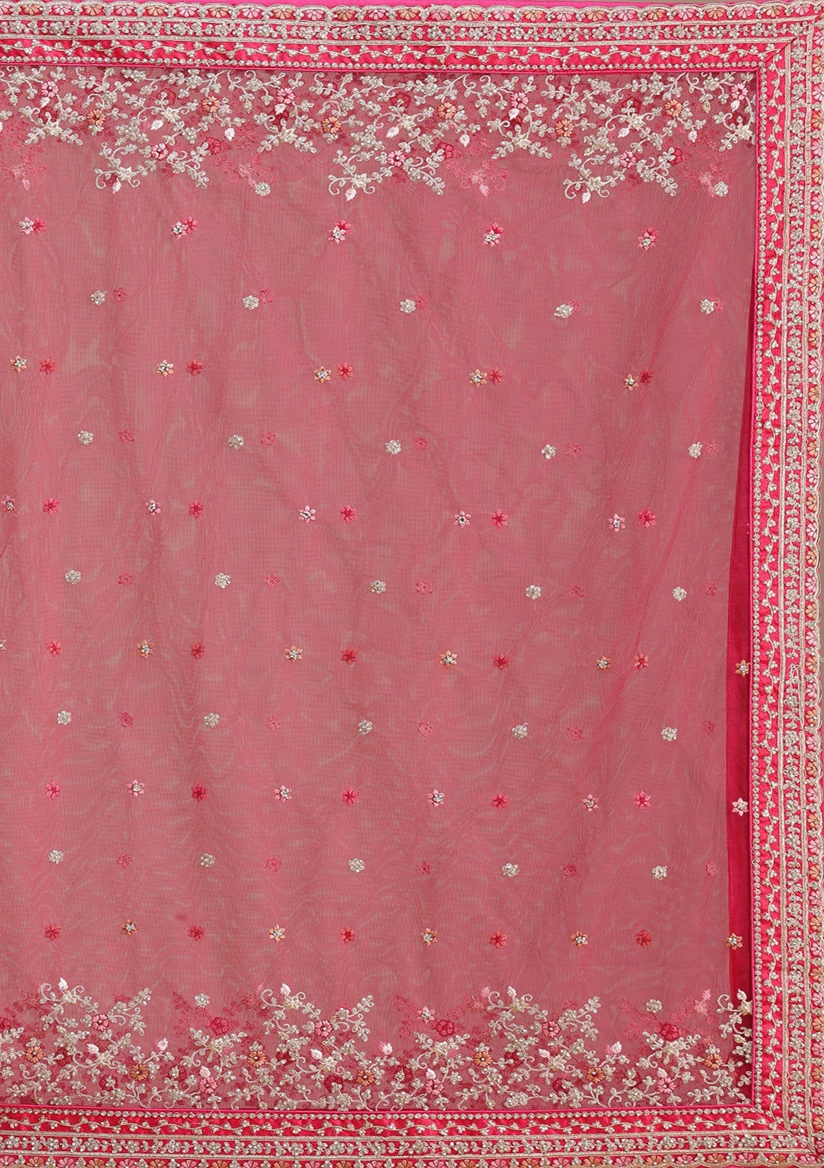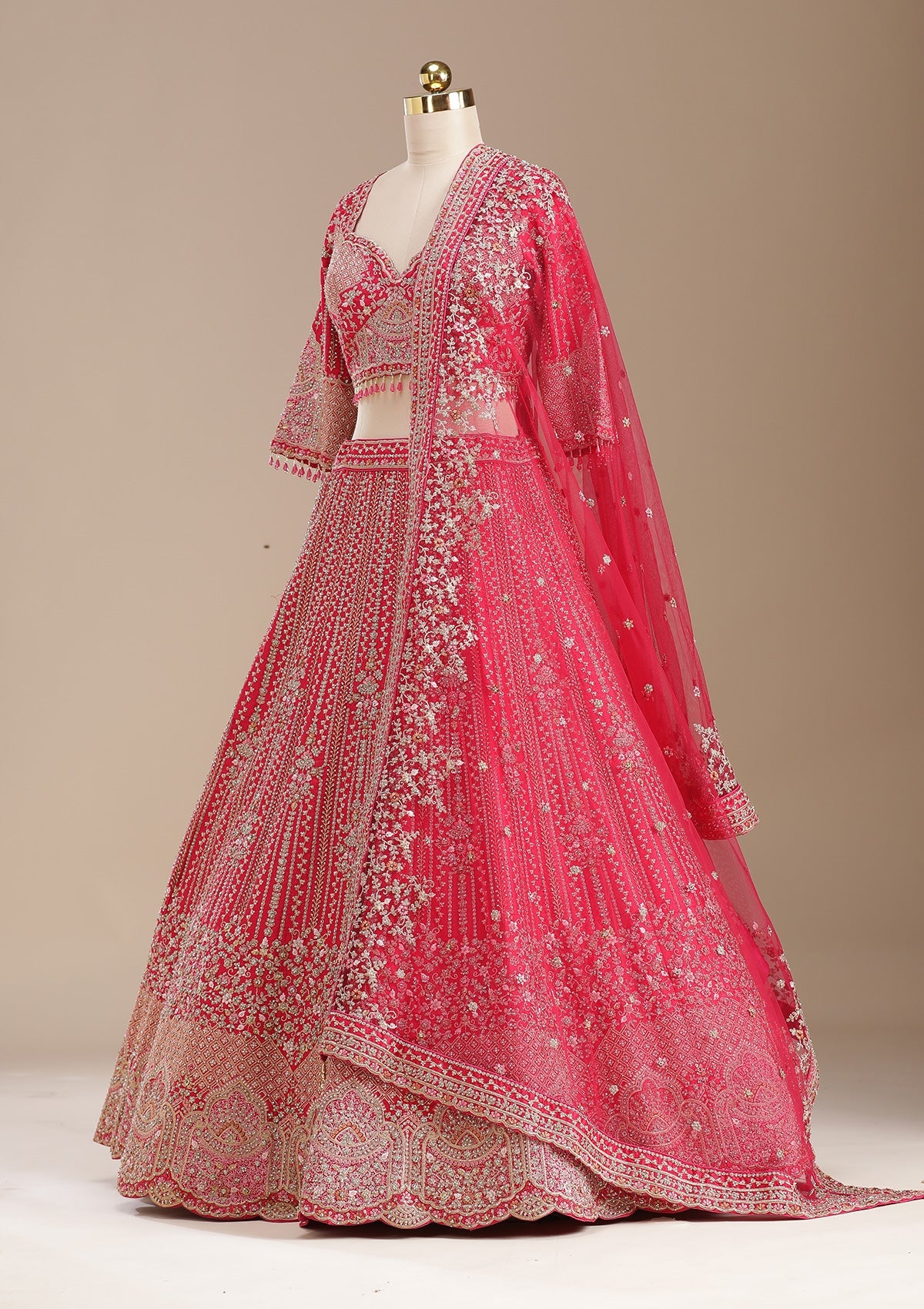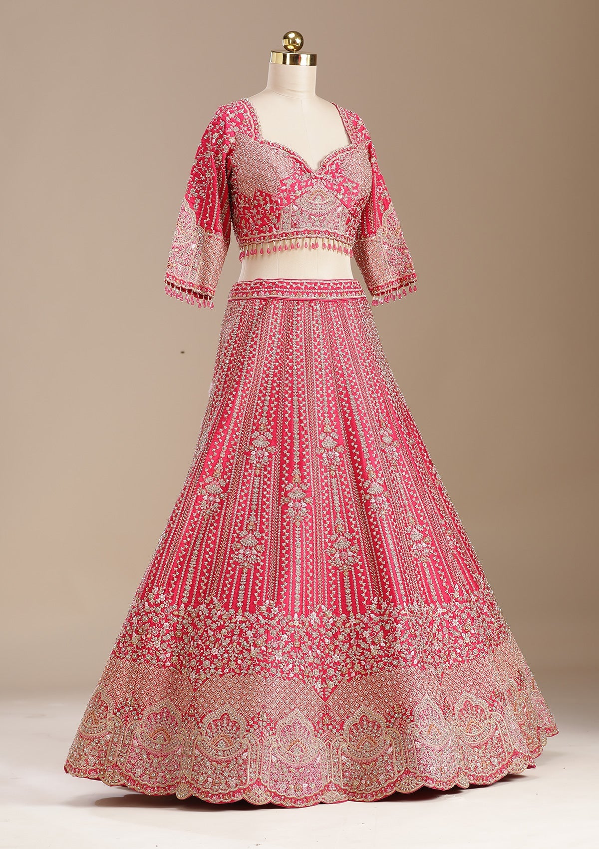 Rani Pink Readymade Lehenga in Raw Silk fabric. The Lehenga is embellished with Stonework (Gold) embroidery. Accompanied with an Readymade blouse and dupatta. Comes with the Koskii promise of premium quality.