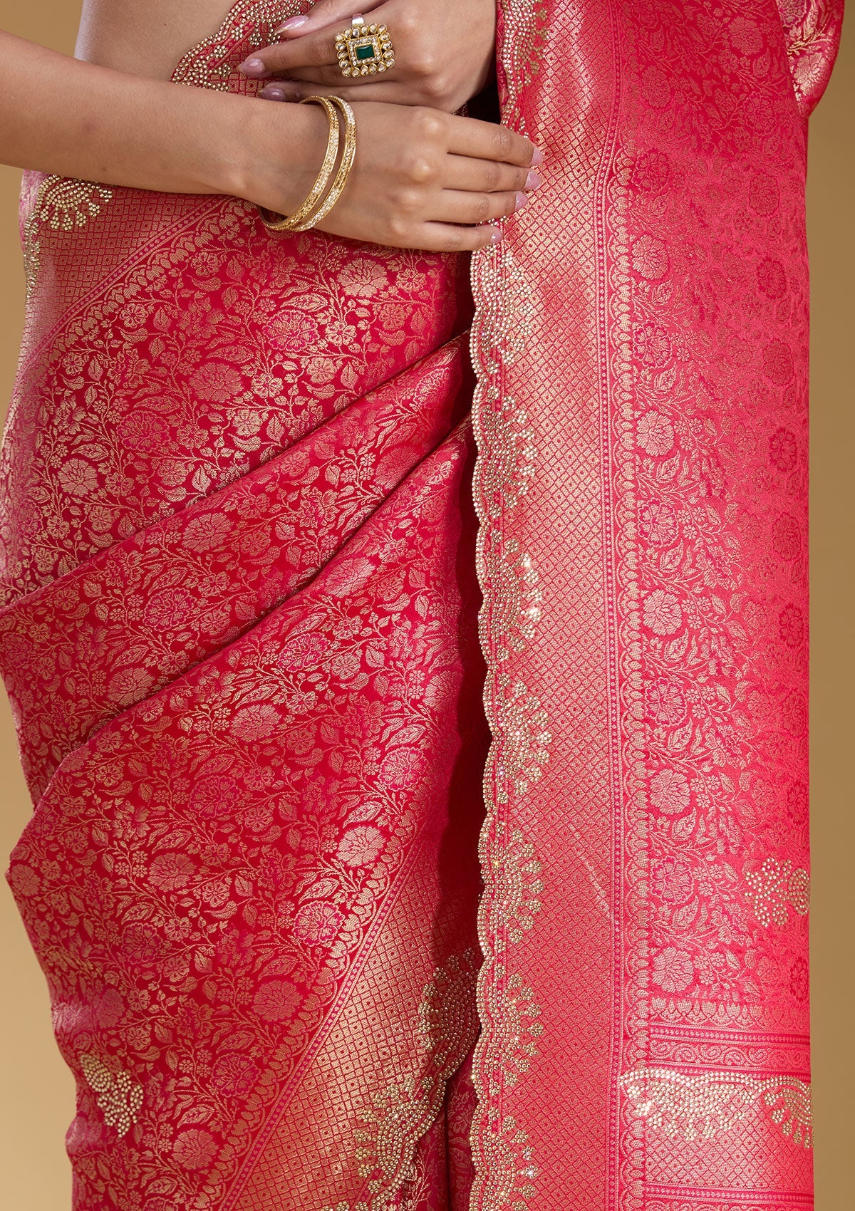 Rani Pink Silk_Saree in Art Silk fabric. The Silk_Saree is elevated with Stonework (Silver) embroidery. It comes with an Unstitched blouse. Comes with the Koskii promise of premium quality.