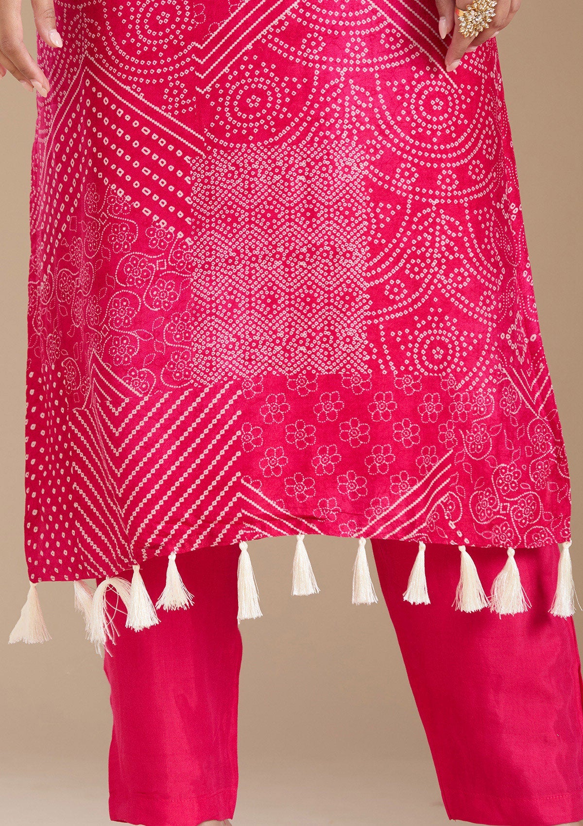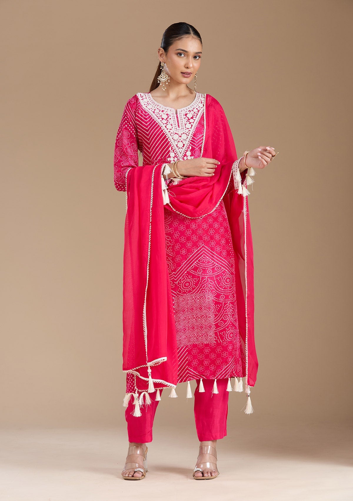 Rani Pink Salwar Suit in Crepe fabric. The Salwar Suit is embellished with Threadwork embroidery. Accompanied with a bottom and dupatta. Comes with the Koskii promise of premium quality.