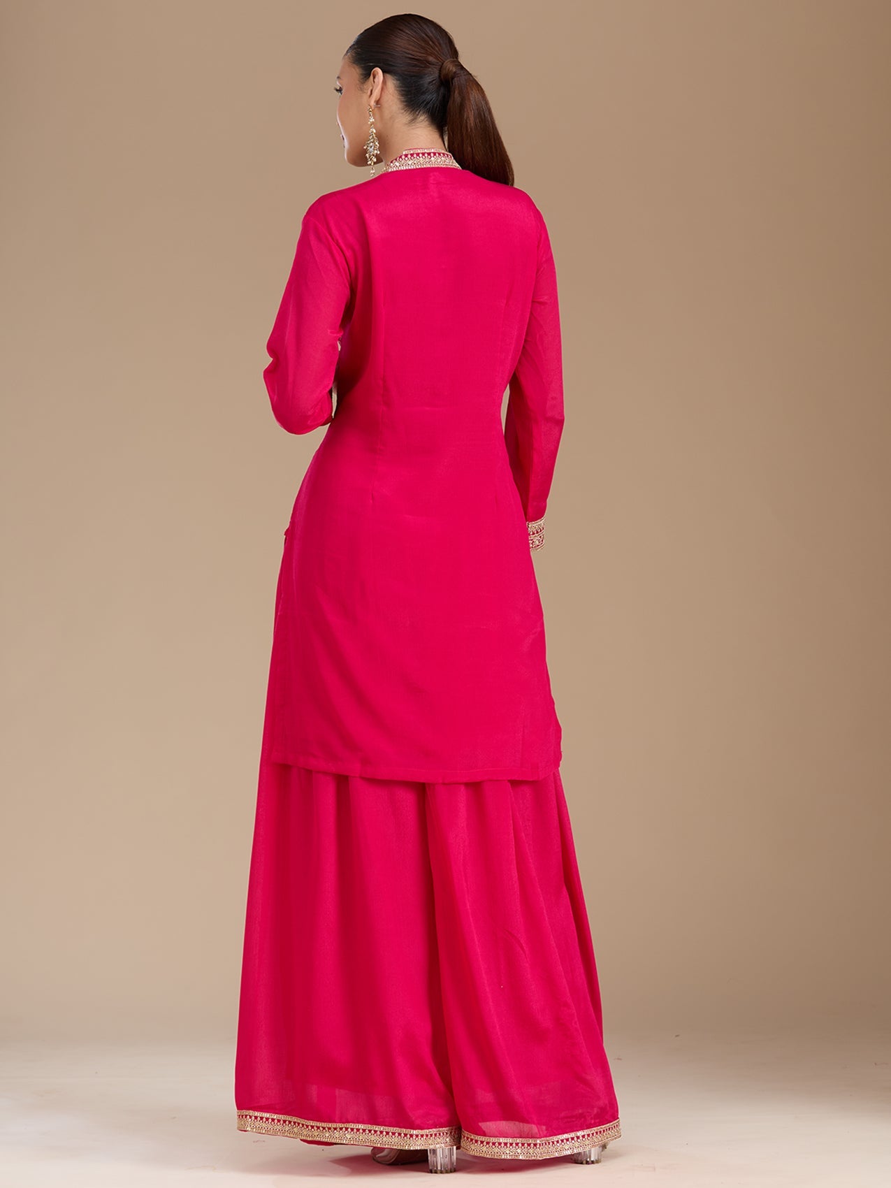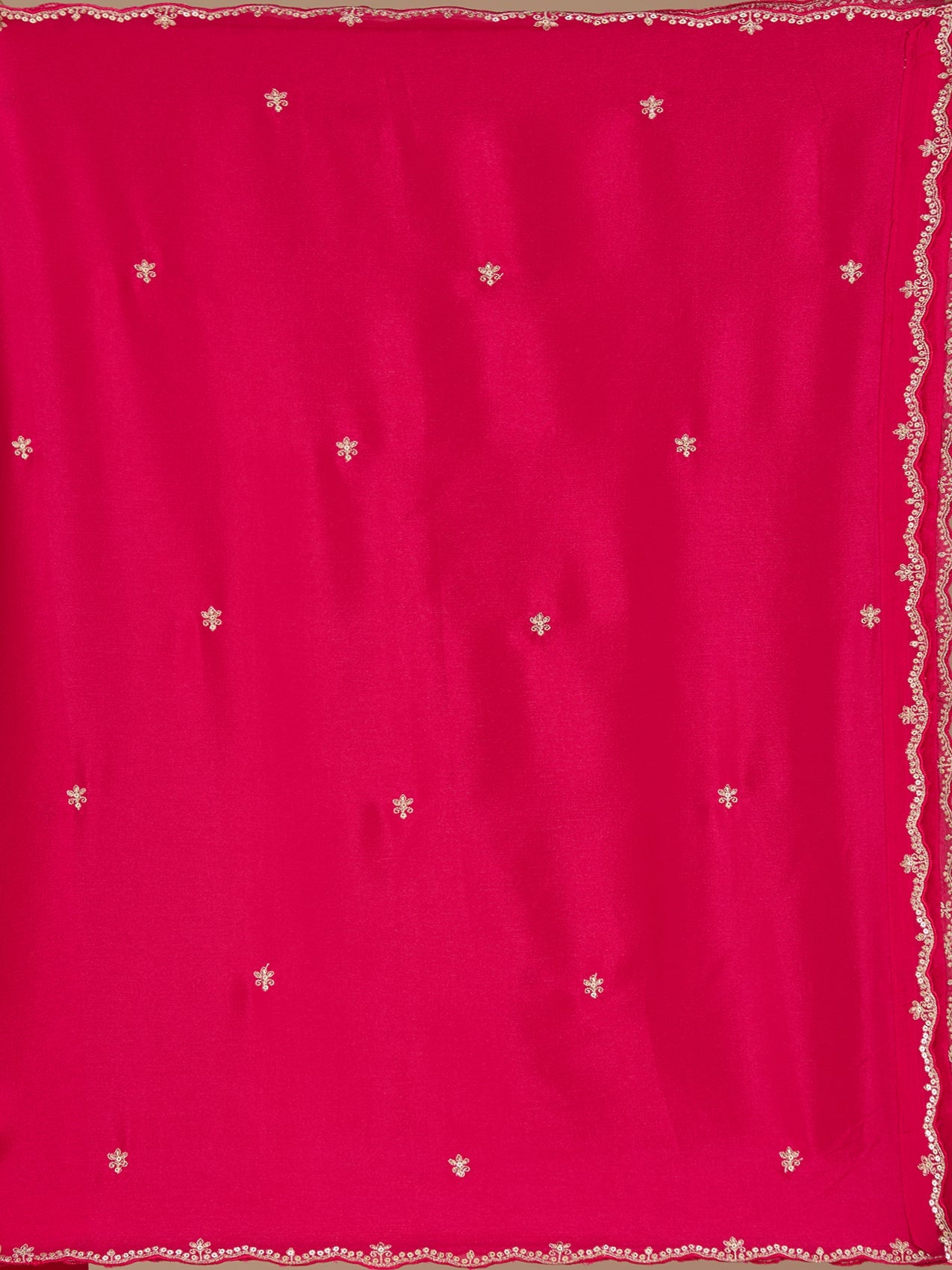 Rani Pink Salwar Suit in Soft Raw Silk fabric. The Salwar Suit is embellished with Threadwork embroidery. Accompanied with a bottom and dupatta. Comes with the Koskii promise of premium quality.