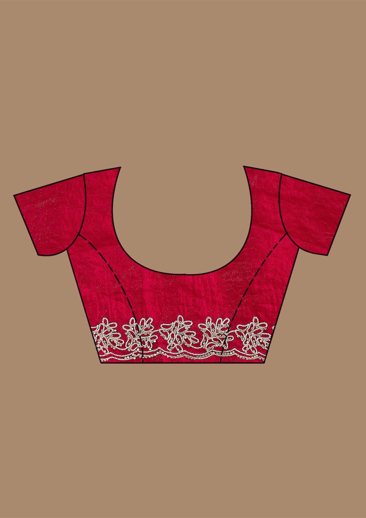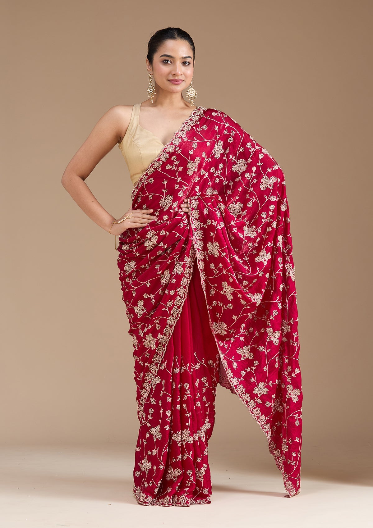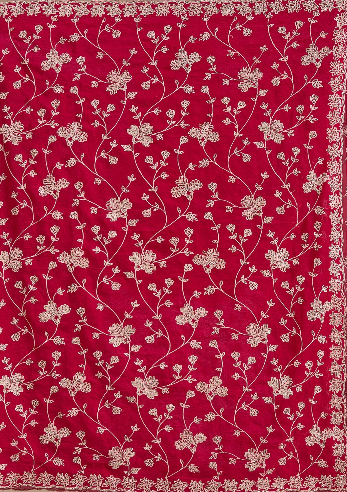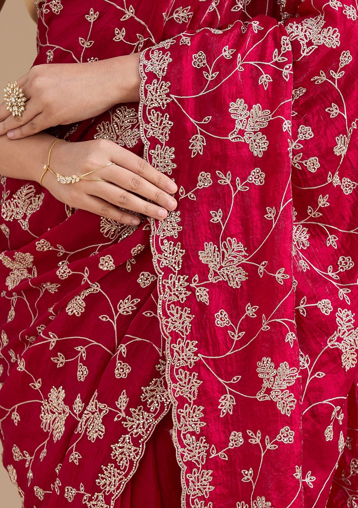 Rani Pink Saree in Tissue fabric. The Saree is elevated with Threadwork embroidery. It comes with an Unstitched blouse. Comes with the Koskii promise of premium quality.