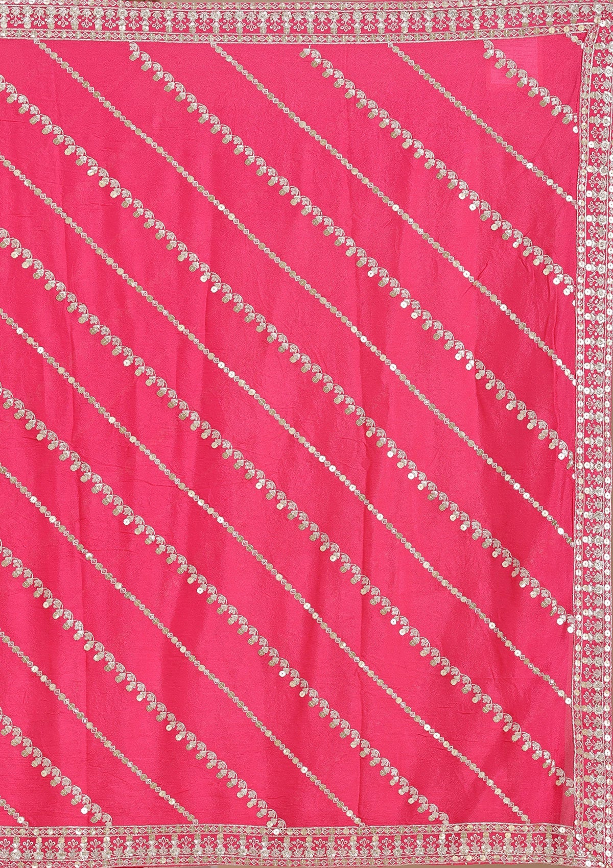 Rani Pink Readymade Lehenga in Georgette fabric. The Lehenga is embellished with Zardozi (Gold) embroidery. Accompanied with an Readymade blouse and dupatta. Comes with the Koskii promise of premium quality.