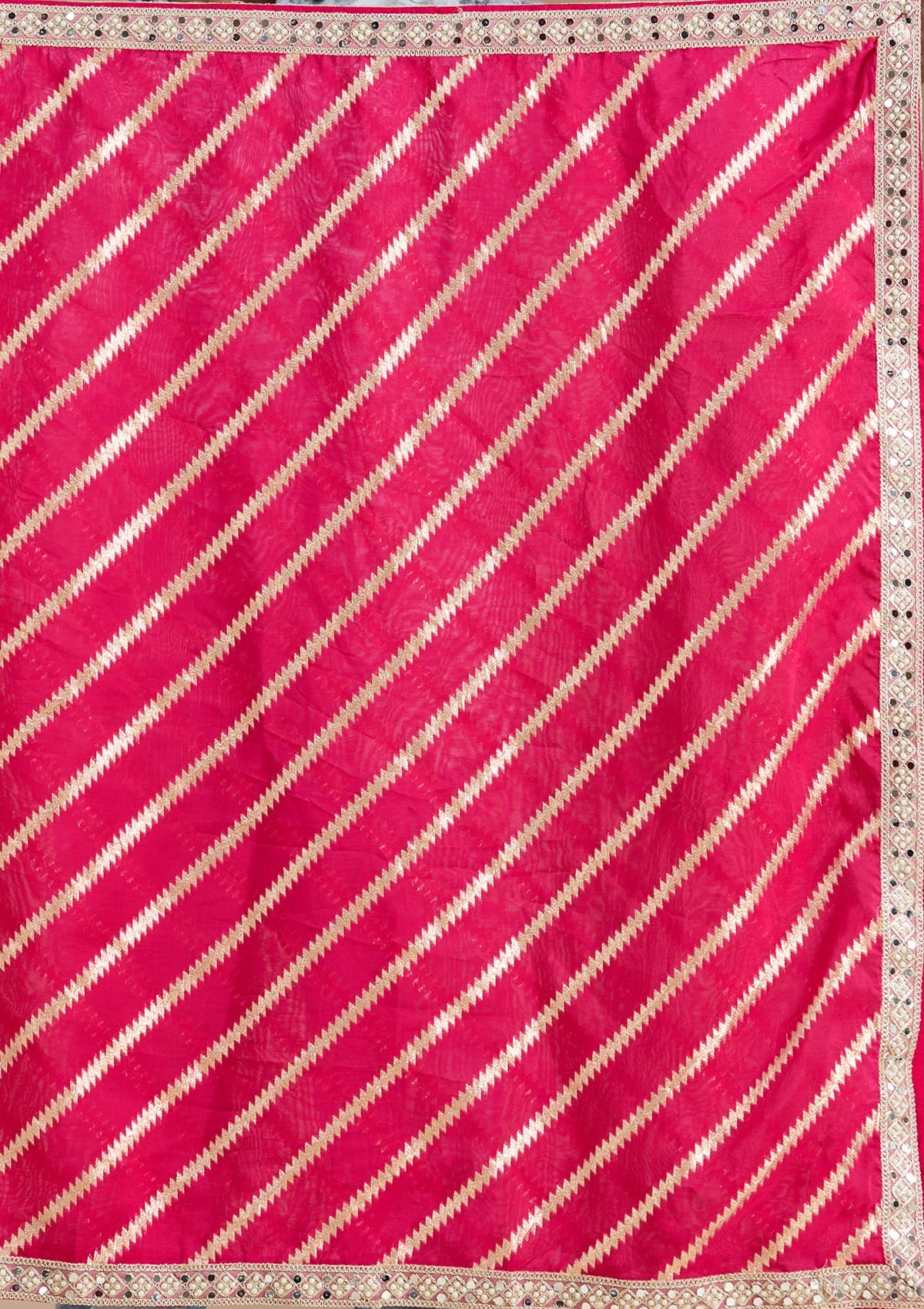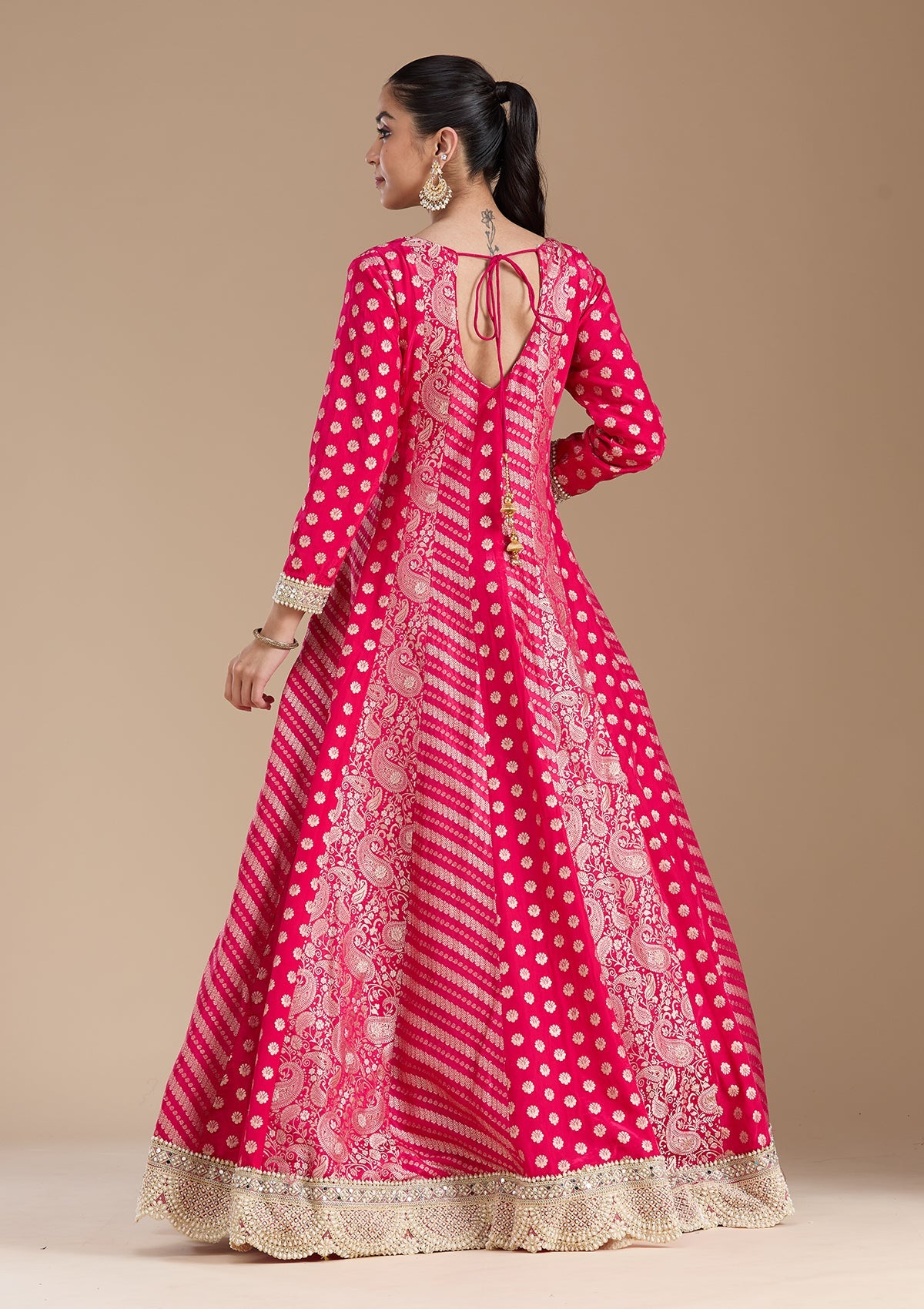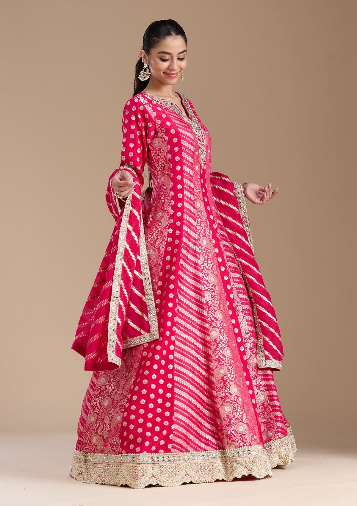 Rani Pink Salwar Suit in Brocade fabric. The Salwar Suit is embellished with Zariwork embroidery. Accompanied with a bottom and dupatta. Comes with the Koskii promise of premium quality.
