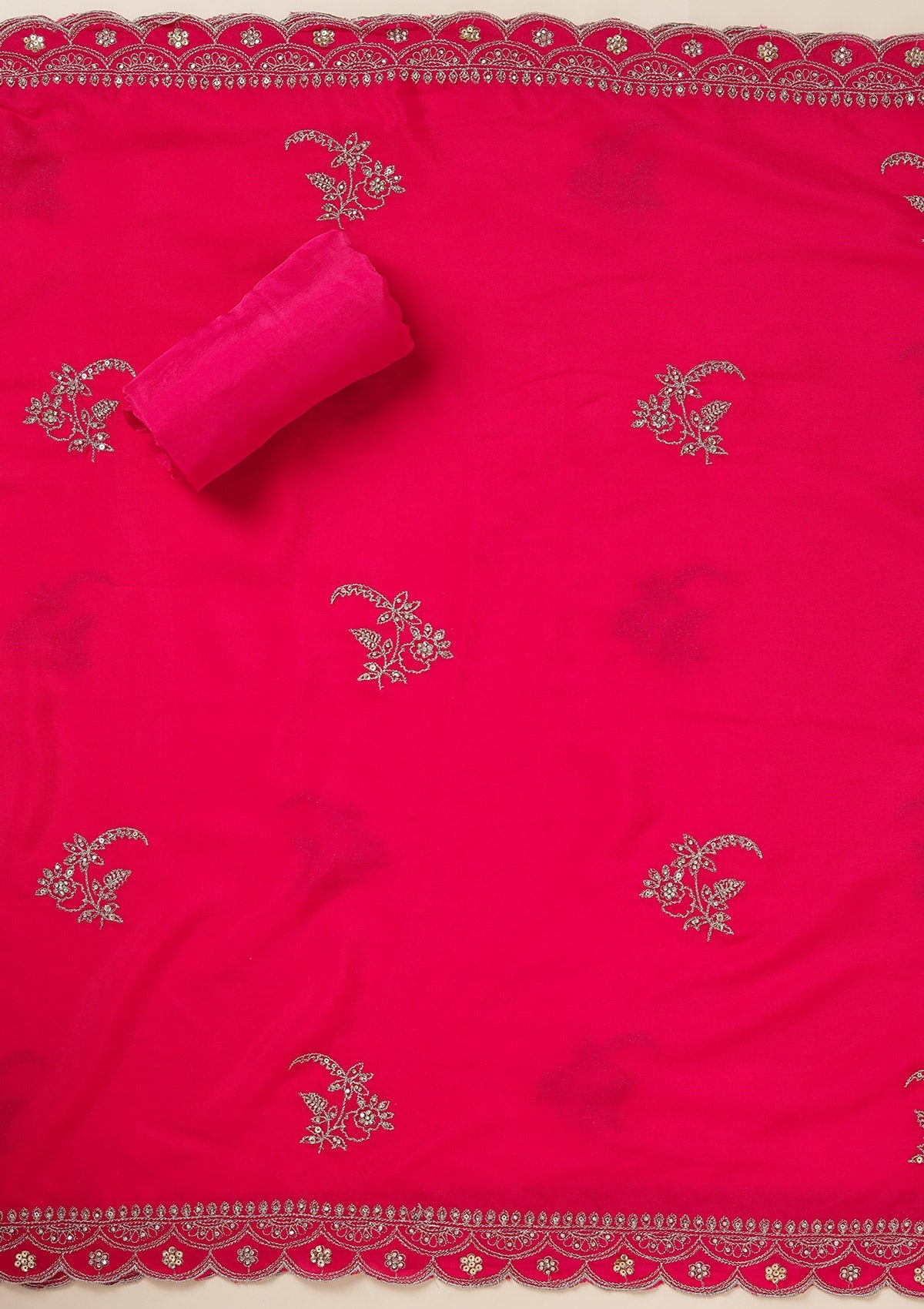 Rani Pink Salwar Suit in Georgette fabric. The Salwar Suit is embellished with Zariwork (Gold) embroidery. Accompanied with a bottom and dupatta. Comes with the Koskii promise of premium quality.