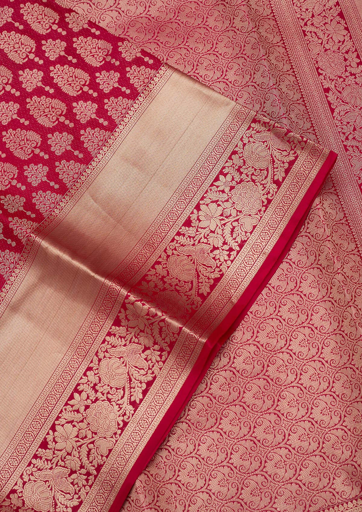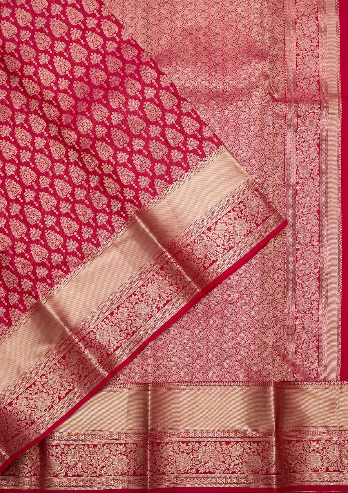 Rani Pink Silk_Saree in Pure Silk fabric. The Silk_Saree is elevated with Zariwork (Gold) embroidery. It comes with an Unstitched blouse. Comes with the Koskii promise of premium quality.