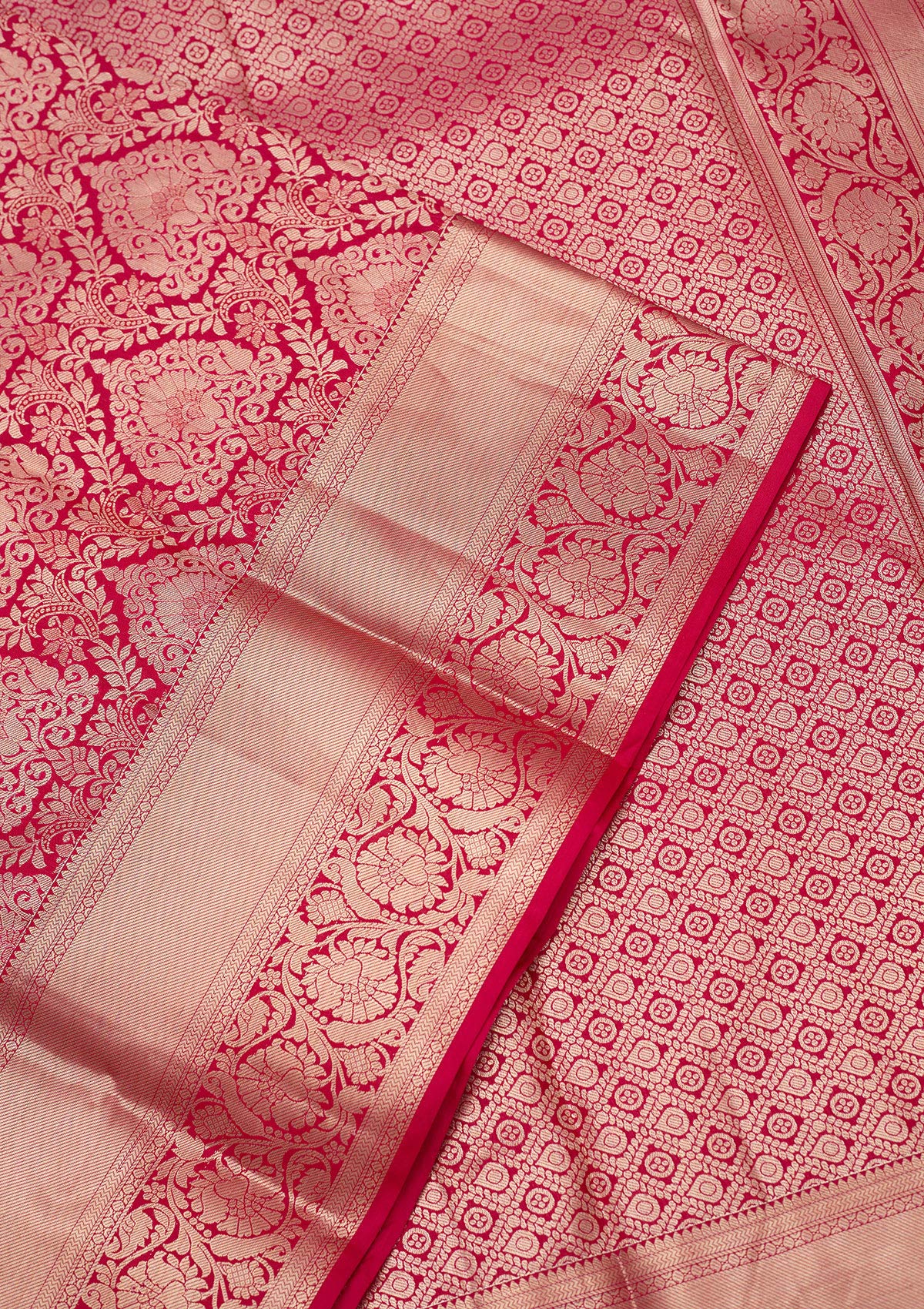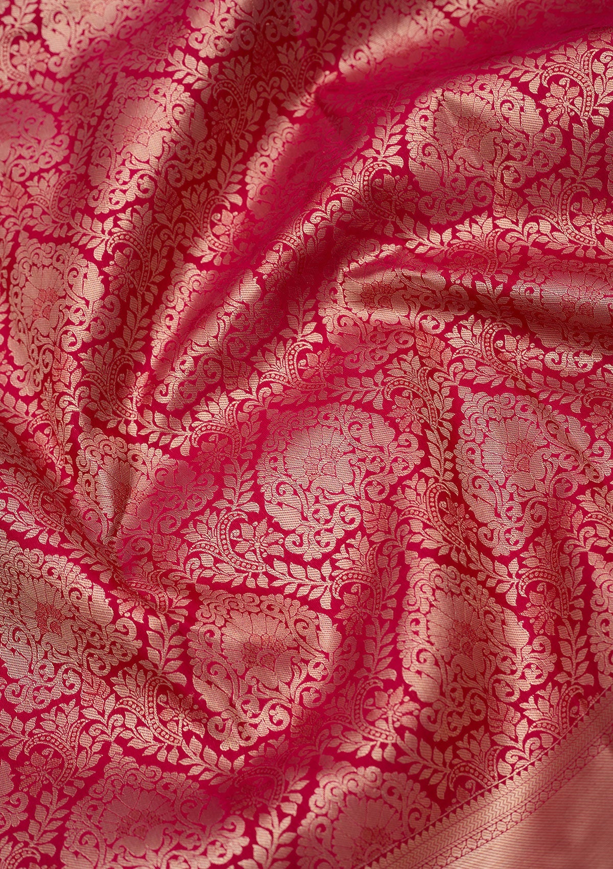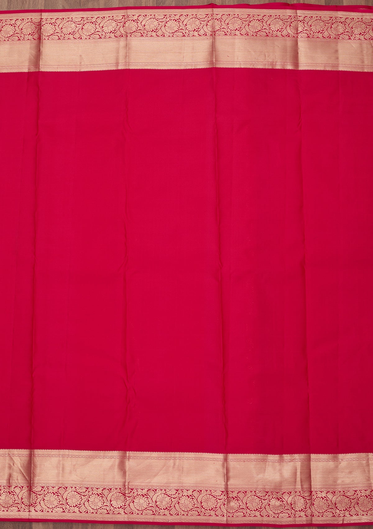 Rani Pink Silk_Saree in Pure Silk fabric. The Silk_Saree is elevated with Zariwork (Gold) embroidery. It comes with an Unstitched blouse. Comes with the Koskii promise of premium quality.