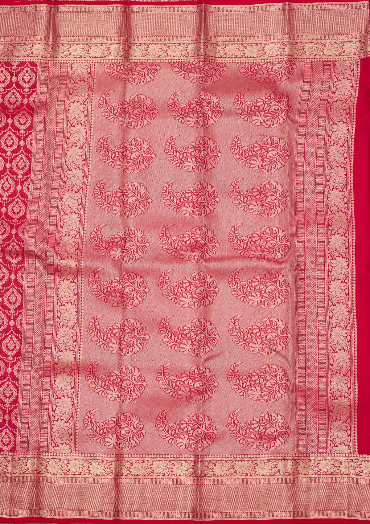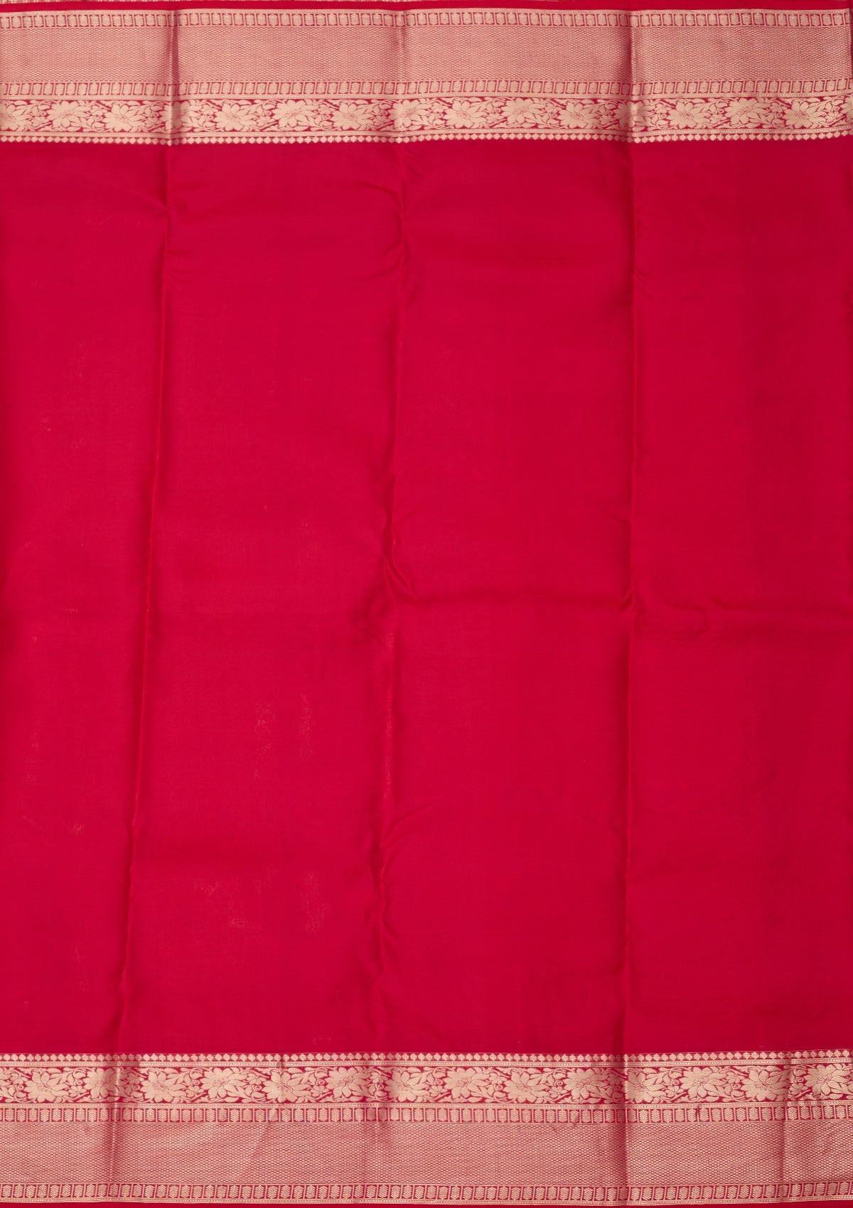 Rani Pink Silk_Saree in Pure Silk fabric. The Silk_Saree is elevated with Zariwork (Gold) embroidery. It comes with an Unstitched blouse. Comes with the Koskii promise of premium quality.