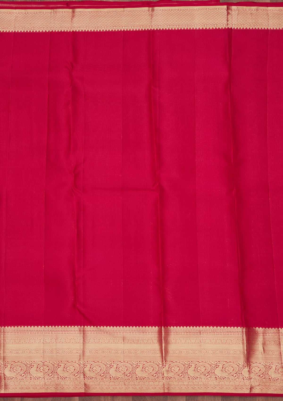 Rani Pink Silk_Saree in Pure Silk fabric. The Silk_Saree is elevated with Zariwork (Gold) embroidery. It comes with an Unstitched blouse. Comes with the Koskii promise of premium quality.