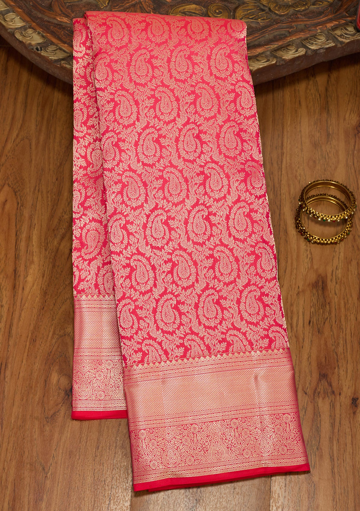 Rani Pink Silk_Saree in Silk fabric. The Silk_Saree is elevated with Zariwork (Gold) embroidery. It comes with an Unstitched blouse. Comes with the Koskii promise of premium quality.