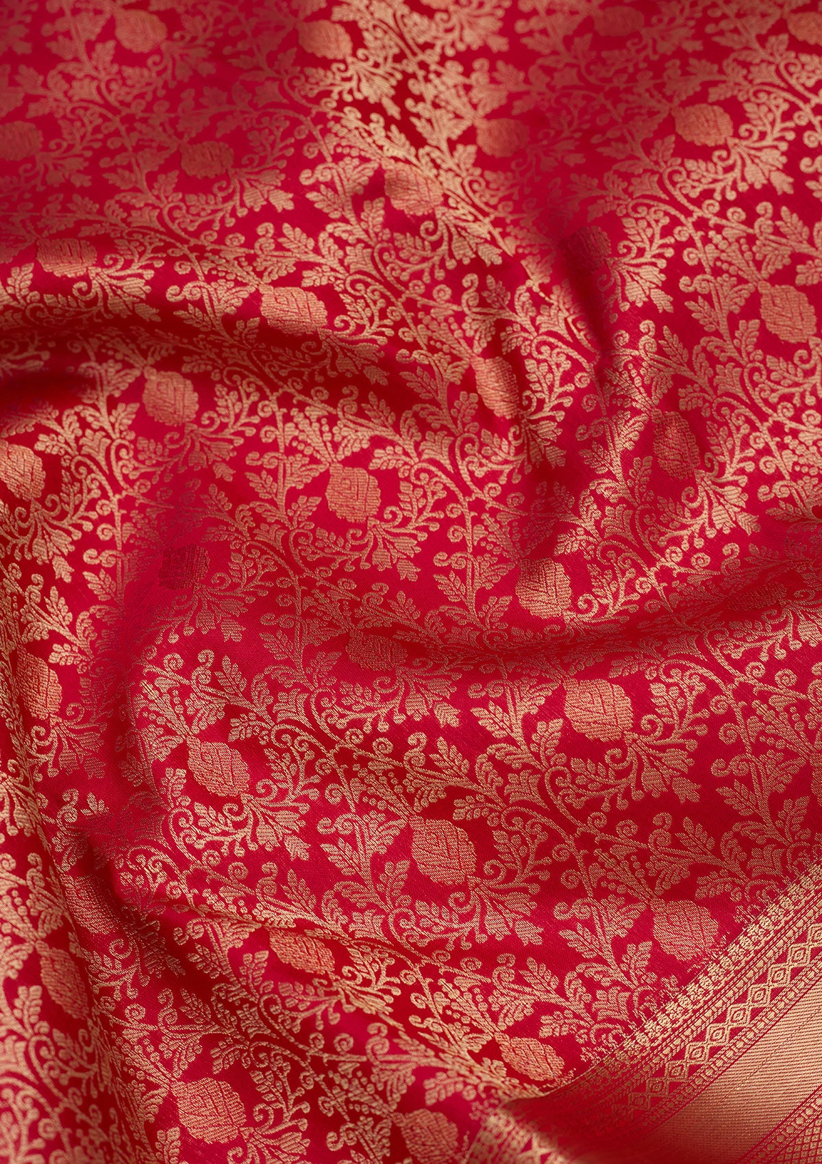 Rani Pink Silk_Saree in Silk fabric. The Silk_Saree is elevated with Zariwork (Gold) embroidery. It comes with an Unstitched blouse. Comes with the Koskii promise of premium quality.