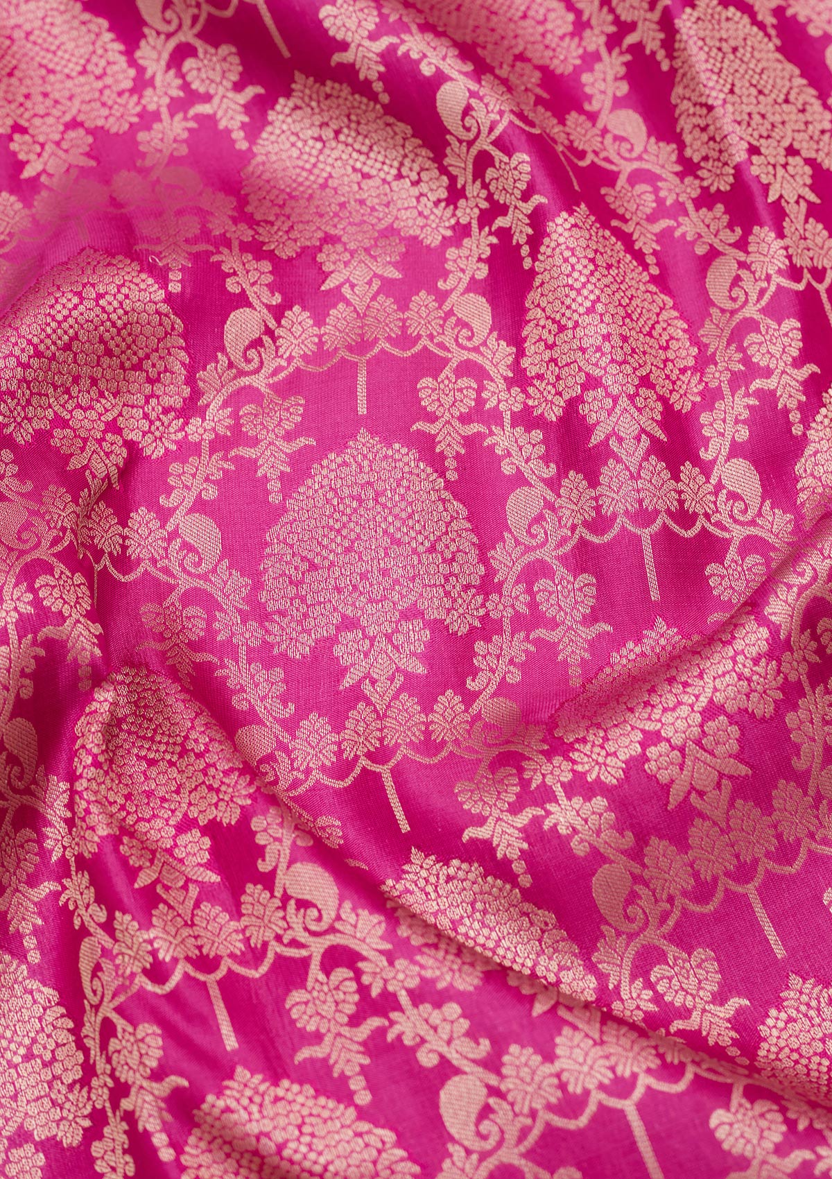 Rani Pink Silk Saree in Pure Silk fabric. The Silk Saree is elevated with Zariwork embroidery. It comes with an Unstitched blouse. Comes with the Koskii promise of premium quality.