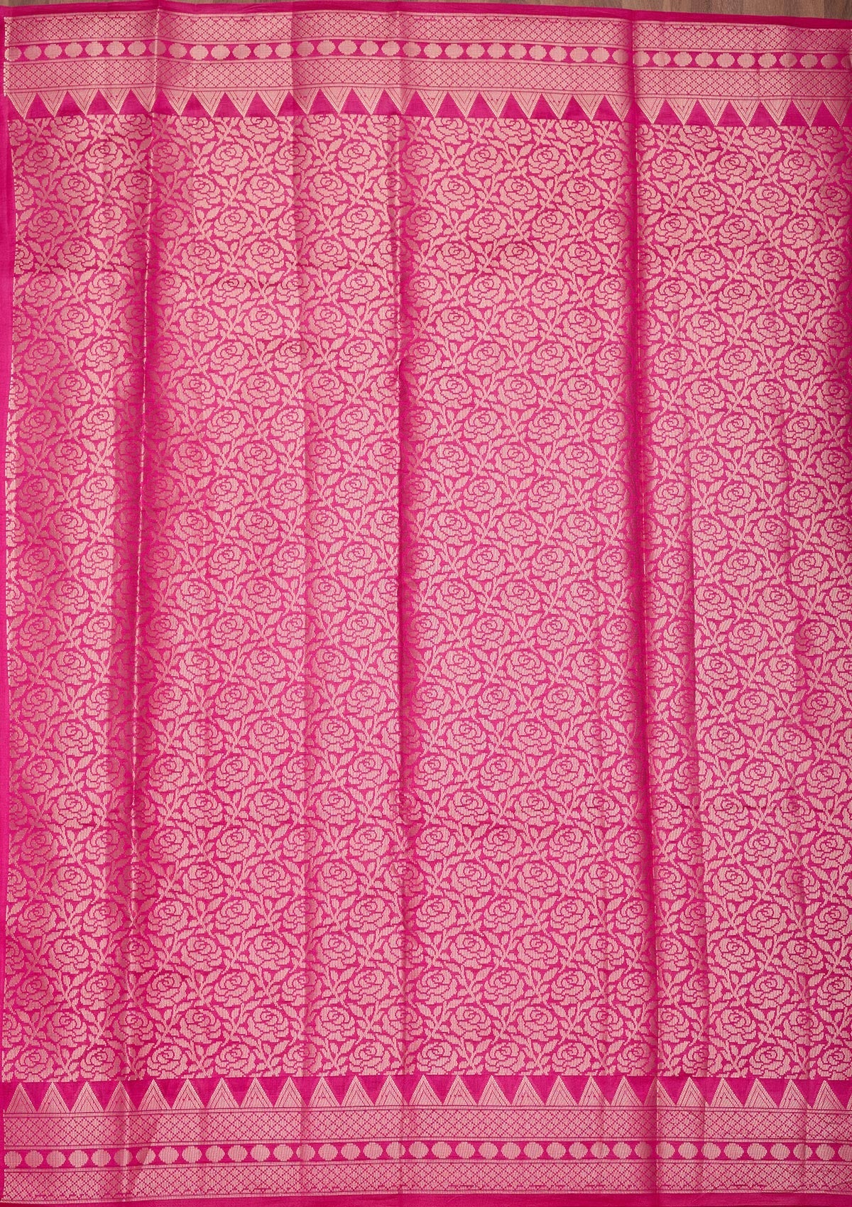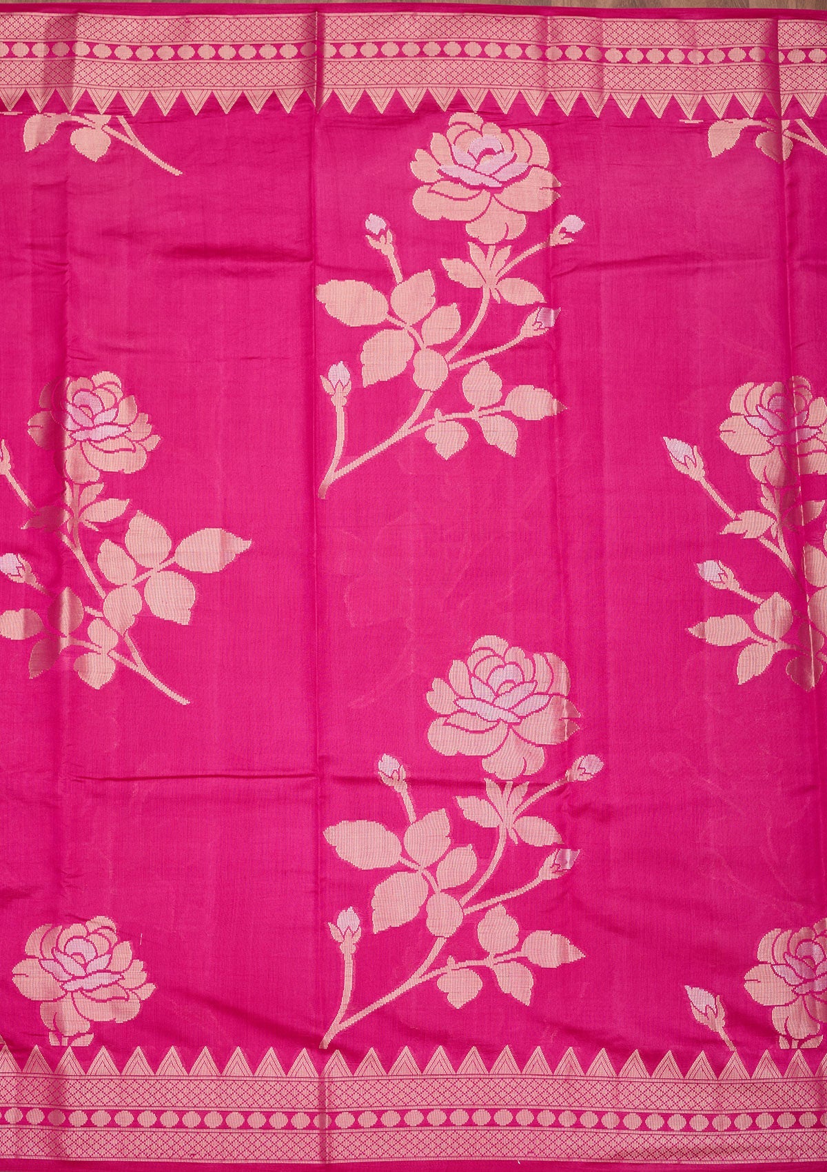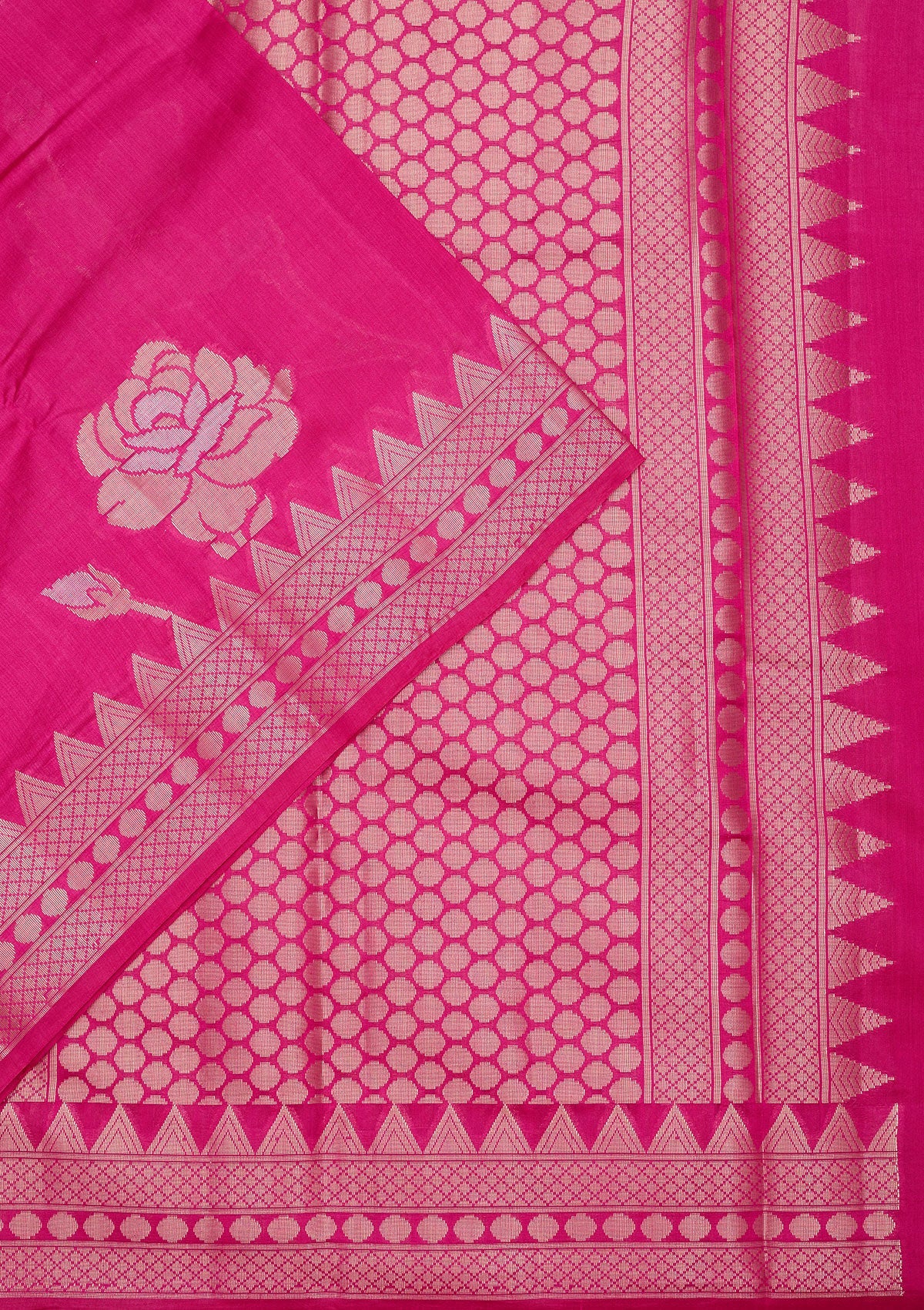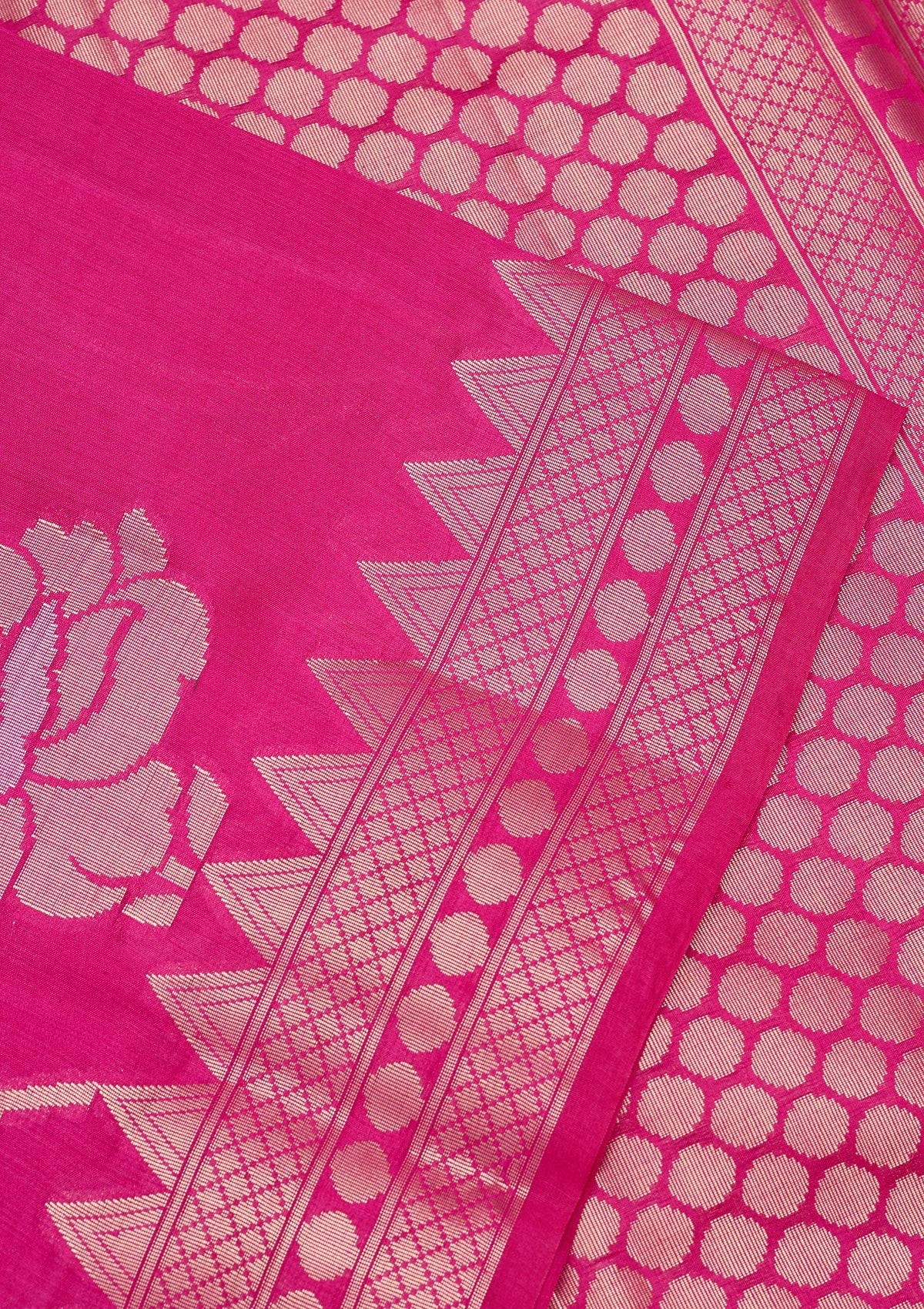 Rani Pink Silk_Saree in Pure Silk fabric. The Silk_Saree is elevated with Zariwork embroidery. It comes with an Unstitched blouse. Comes with the Koskii promise of premium quality.