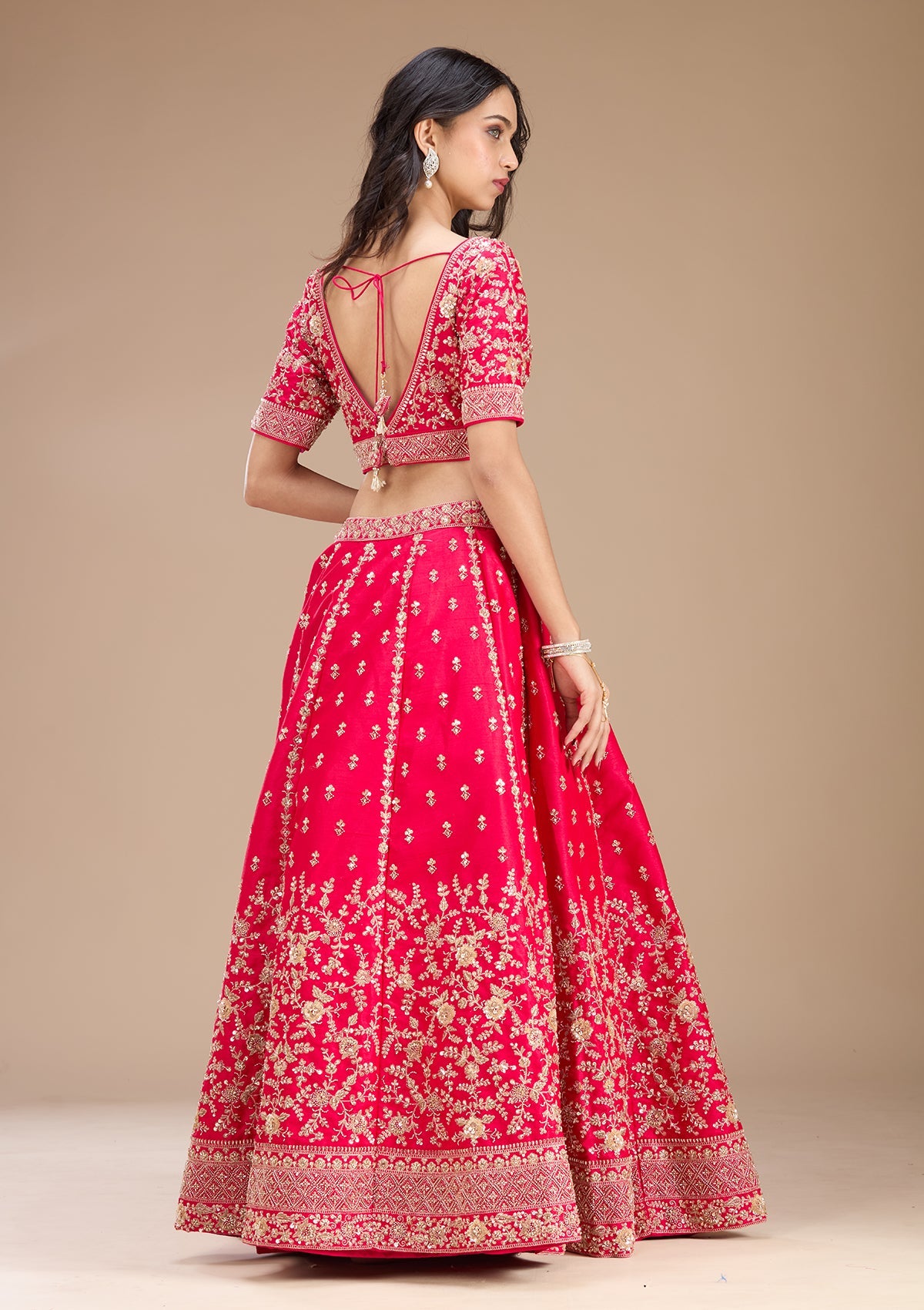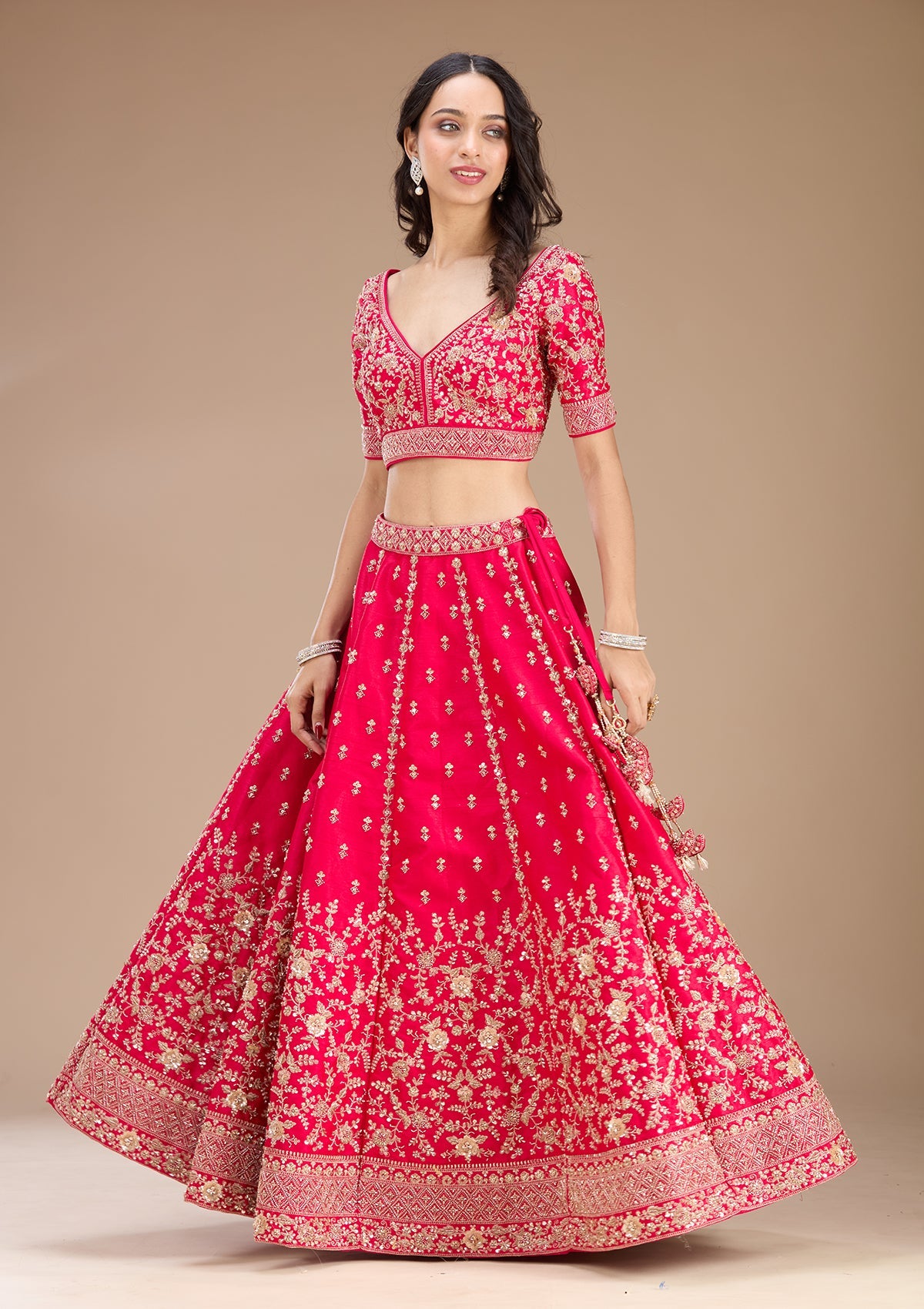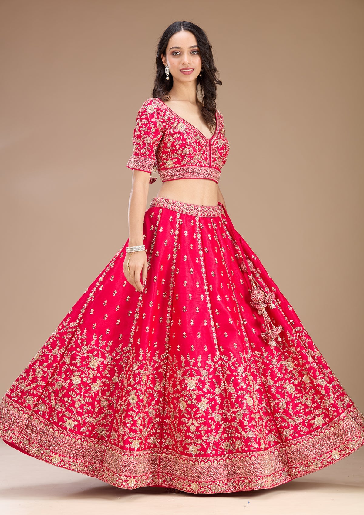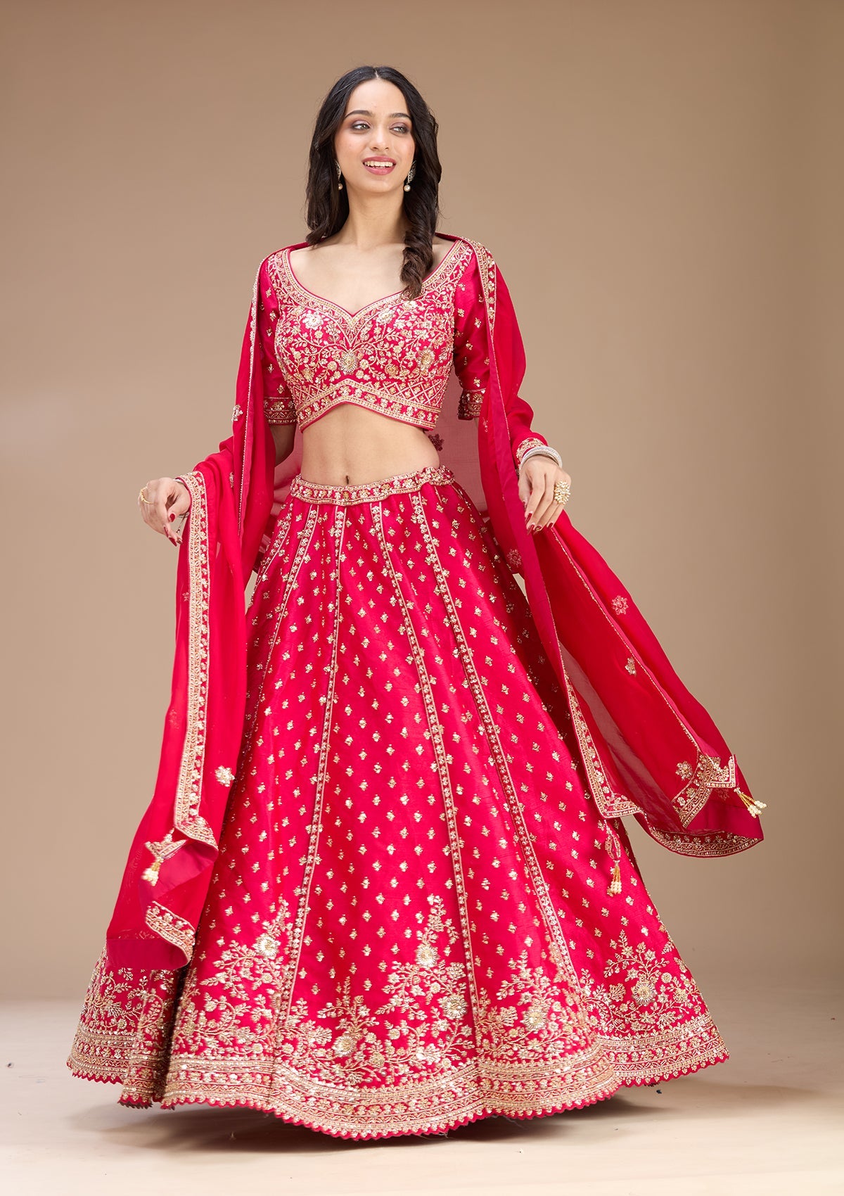 Rani Pink Readymade Lehenga in Raw Silk fabric. The Lehenga is embellished with Zariwork embroidery. Accompanied with an Readymade blouse and dupatta. Comes with the Koskii promise of premium quality.