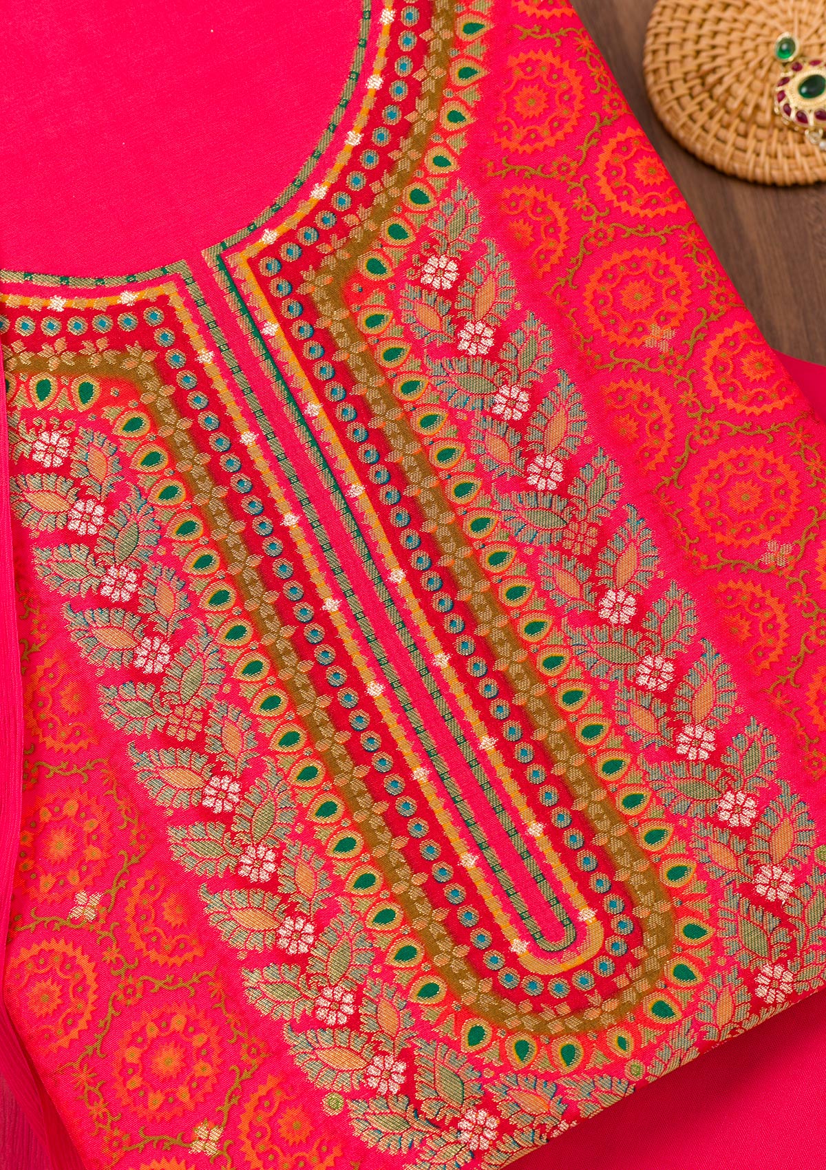 Rani Pink Salwar Suit in Banarasi fabric The Salwar Suit is embellished with Zariwork embroidery Accompanied with a bottom and dupatta Comes with the Koskii promise of premium quality.