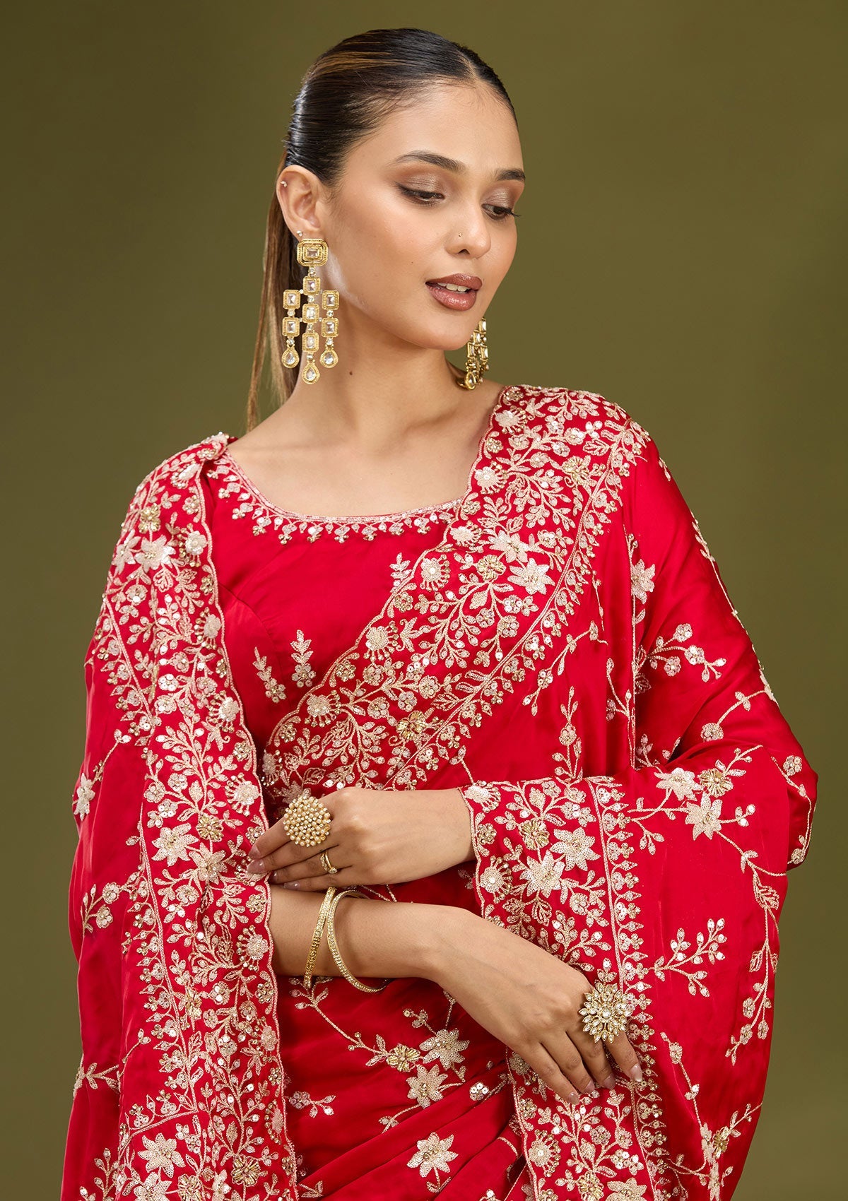 Red Saree in Satin fabric. The Saree is elevated with Aariwork embroidery. It comes with an Unstitched blouse. Comes with the Koskii promise of premium quality.