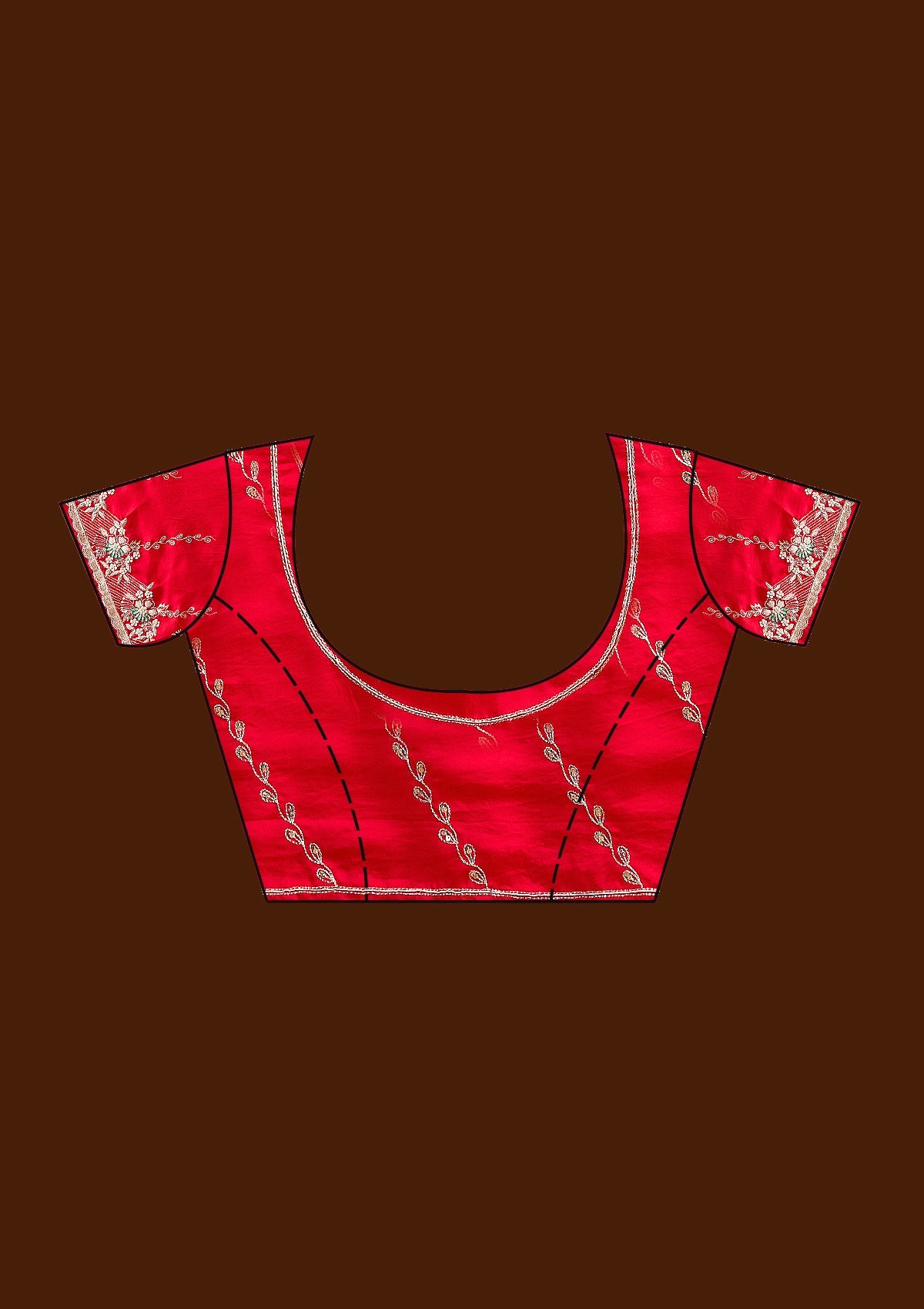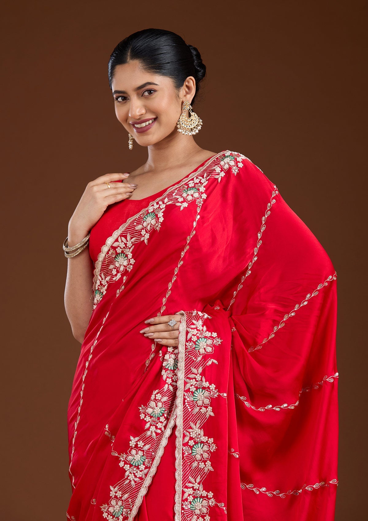 Red Saree in Satin fabric. The Saree is elevated with Aariwork embroidery. It comes with an Unstitched blouse. Comes with the Koskii promise of premium quality.