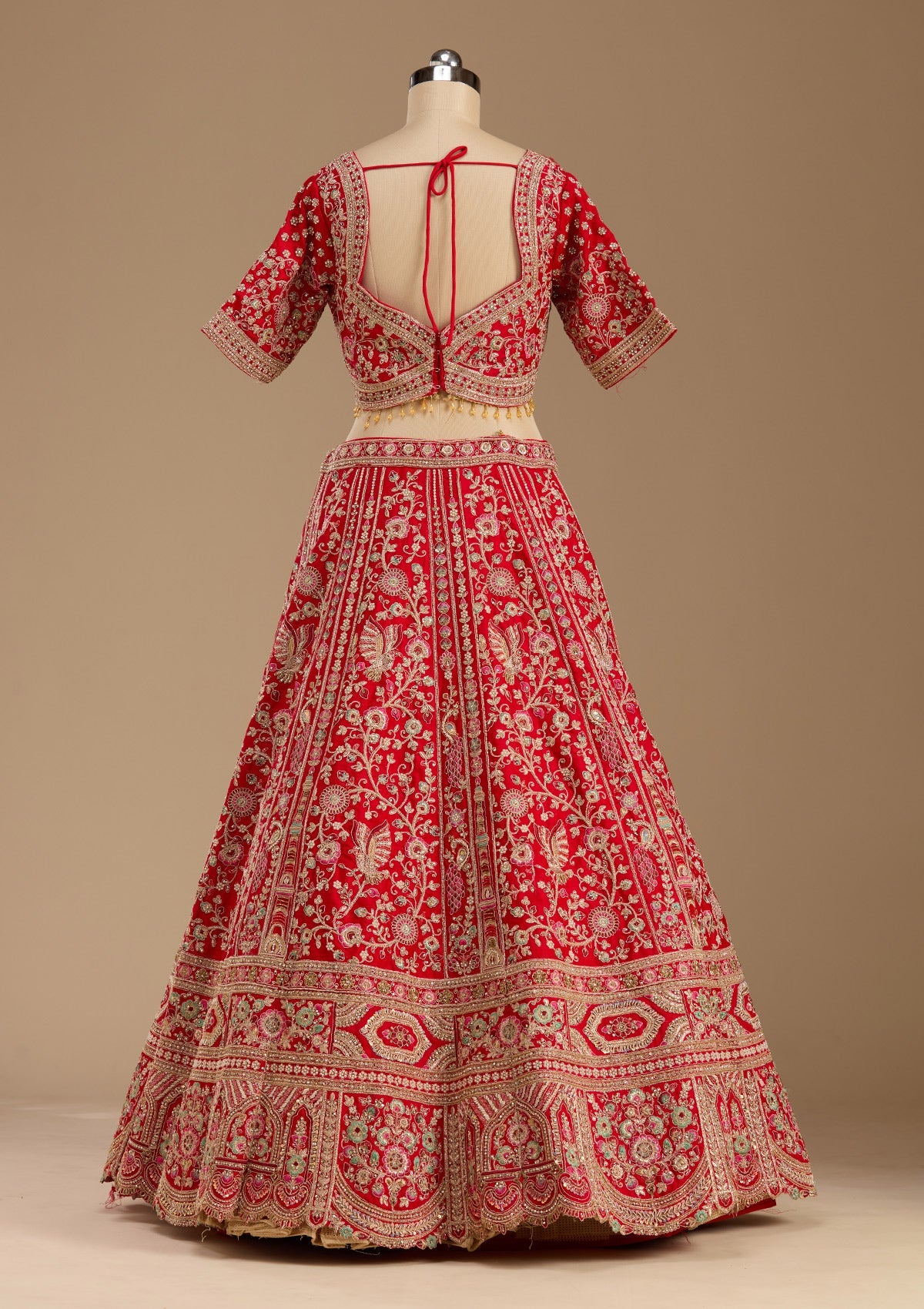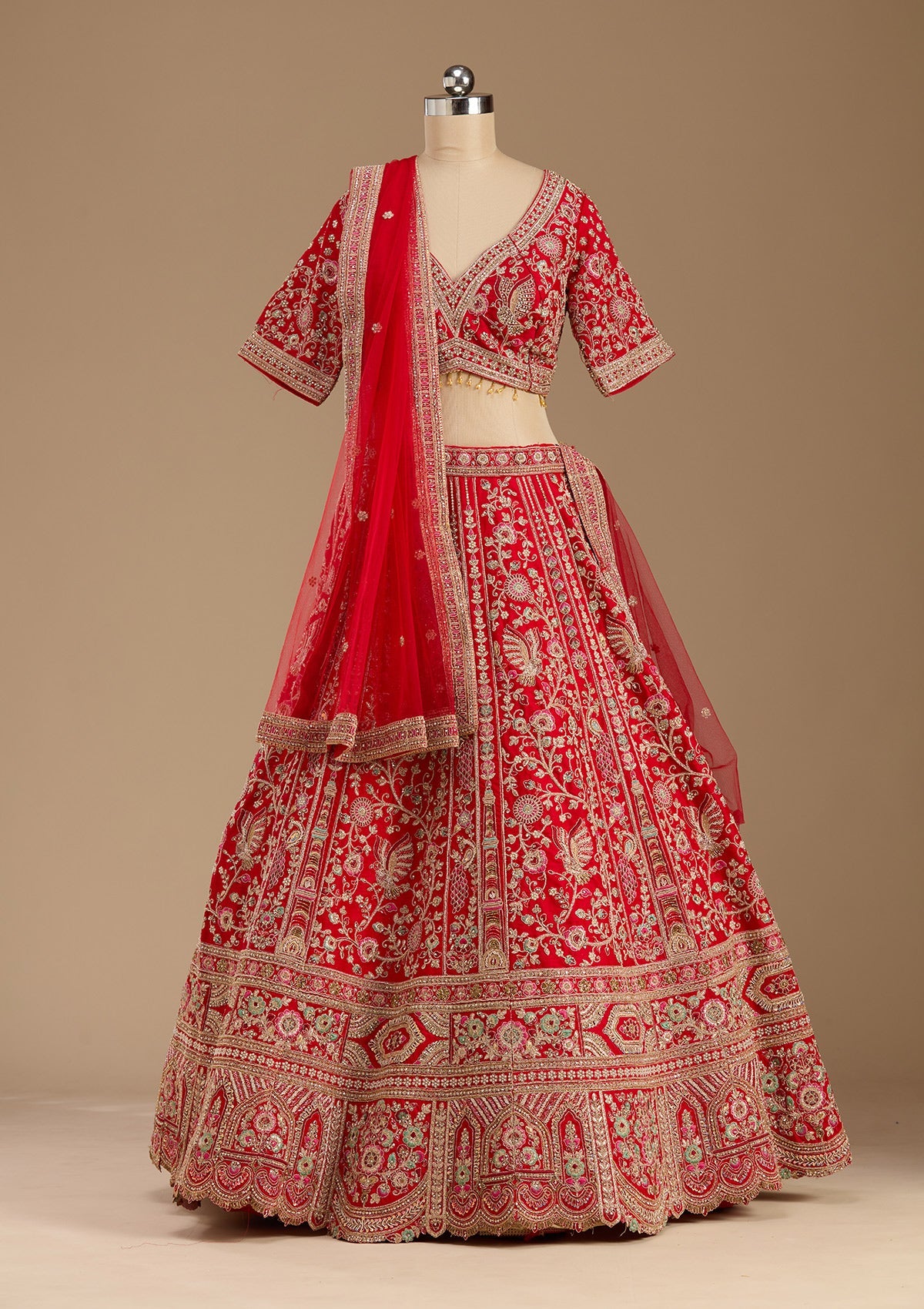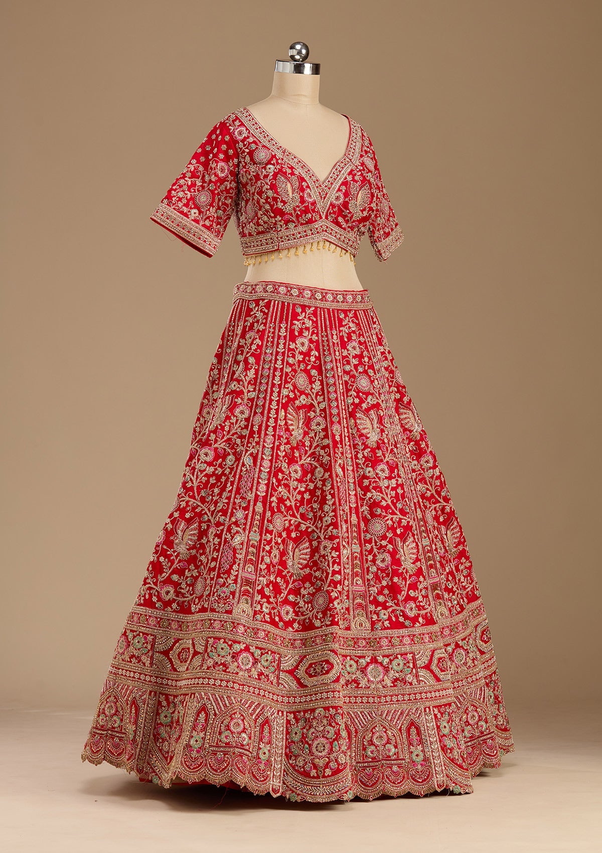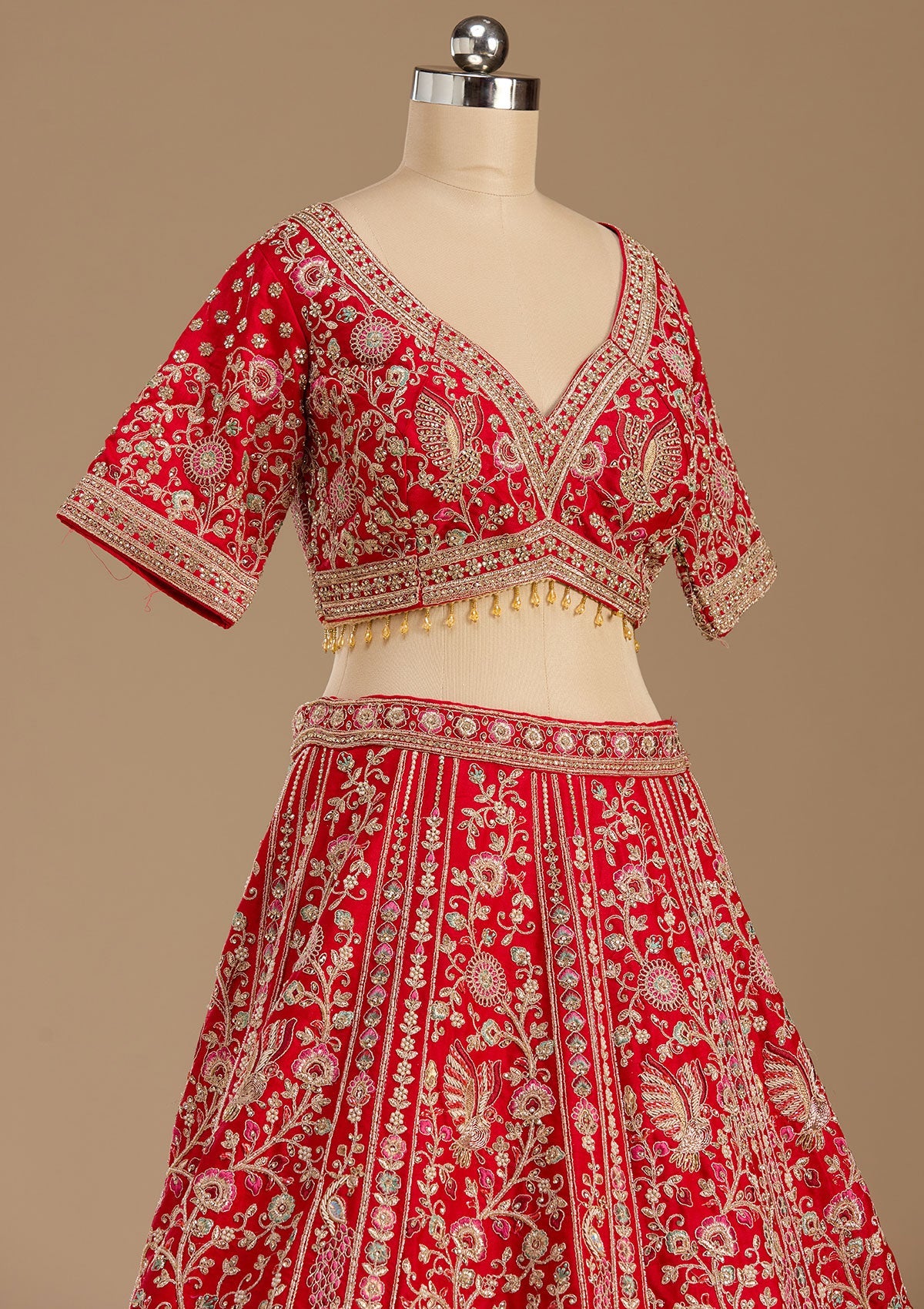 Red Readymade Lehenga in Raw Silk fabric The Lehenga is embellished with Cording embroidery Accompanied with an Readymade blouse and dupatta Comes with the Koskii promise of premium quality.