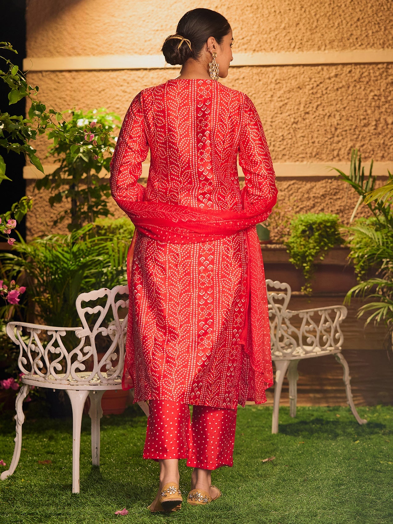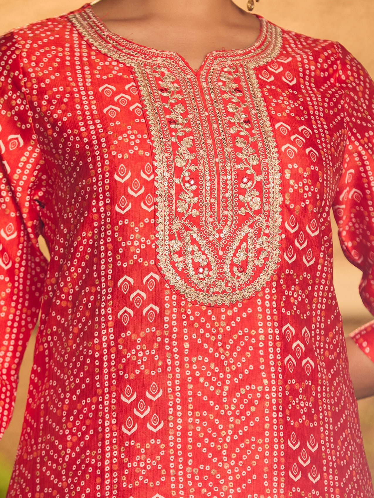 Red Salwar Suit in Raw Silk fabric. The Salwar Suit is embellished with Cording embroidery. Accompanied with a bottom and dupatta. Comes with the Koskii promise of premium quality.