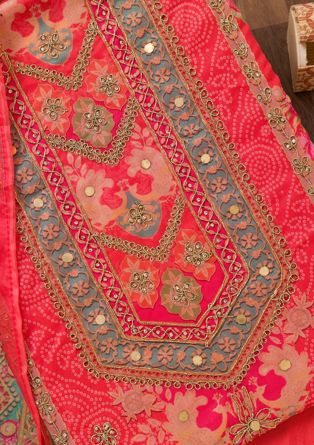 Red Salwar Suit in Chanderi fabric. The Salwar Suit is embellished with Printed embroidery. Accompanied with a bottom and dupatta. Comes with the Koskii promise of premium quality.