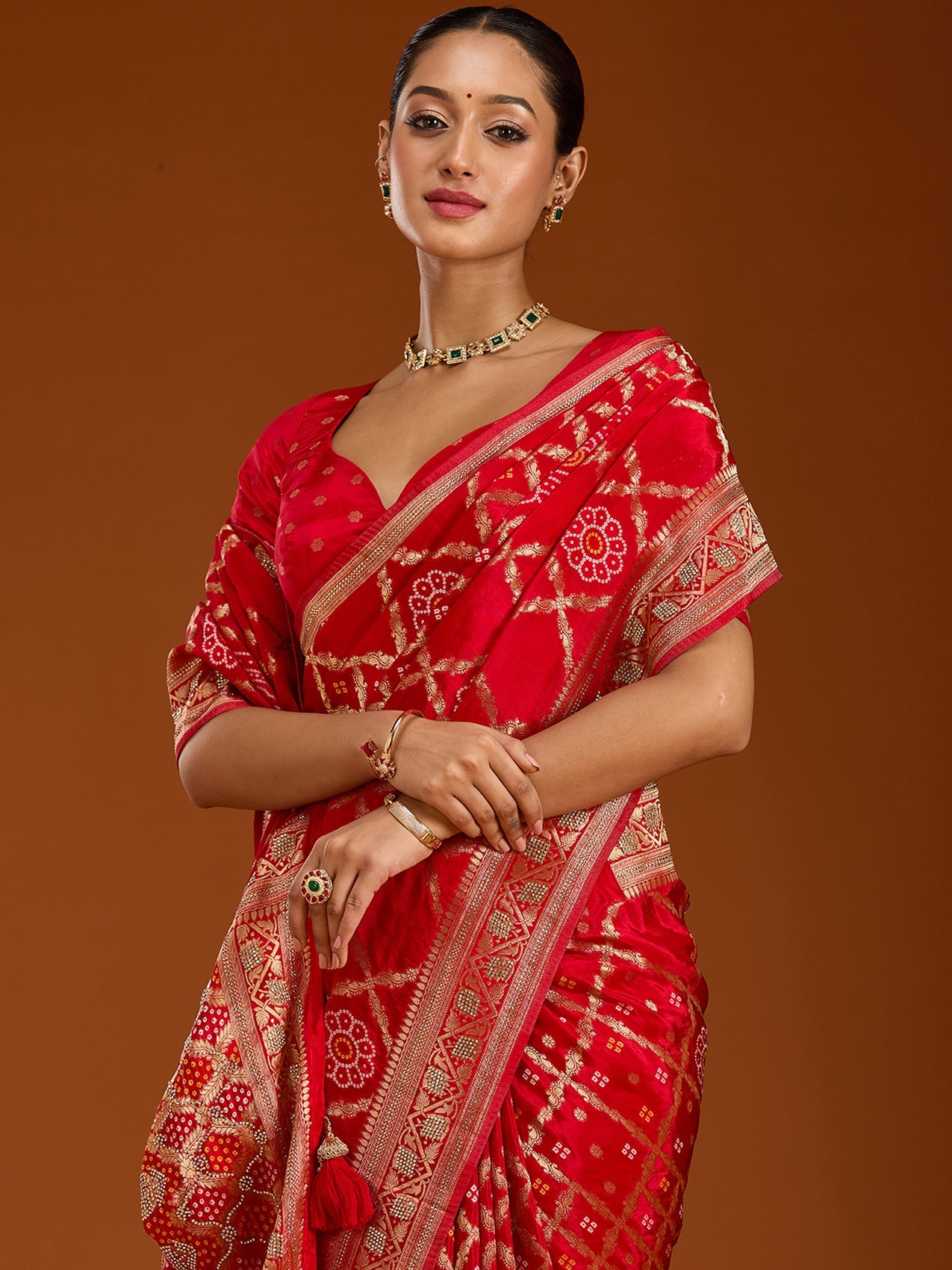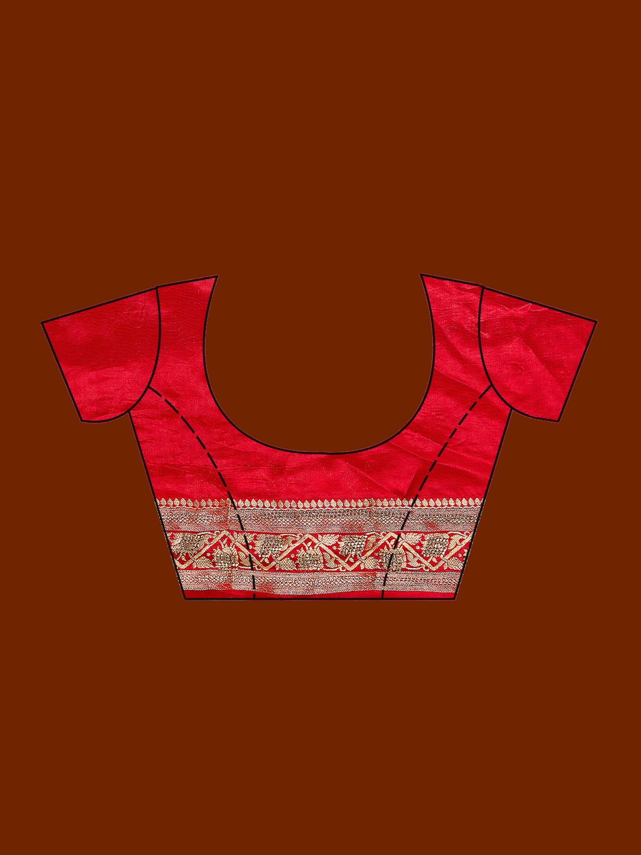 Red Silk Saree in Silk fabric. The Silk Saree is elevated with Stonework embroidery. It comes with an Unstitched blouse. Comes with the Koskii promise of premium quality.