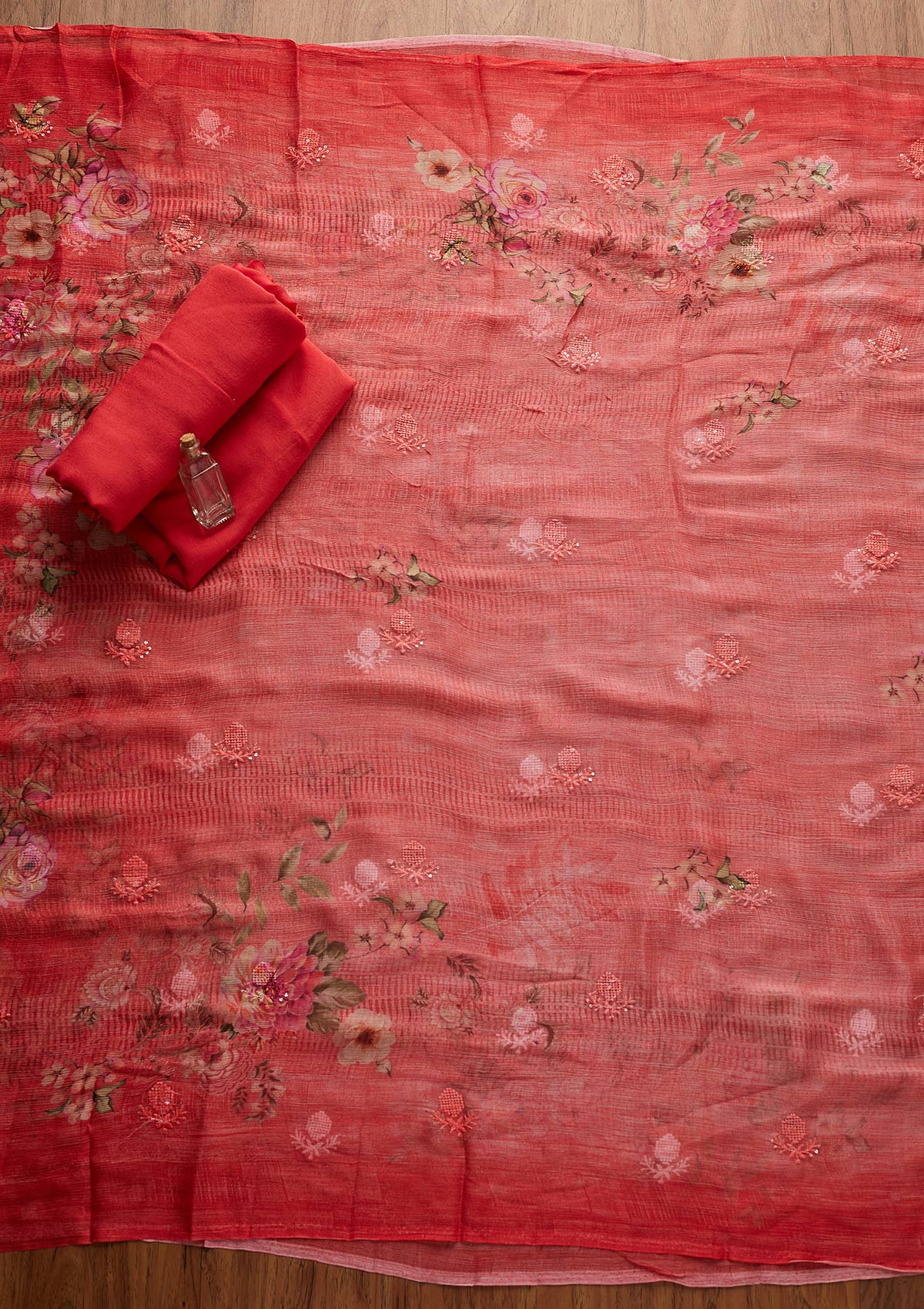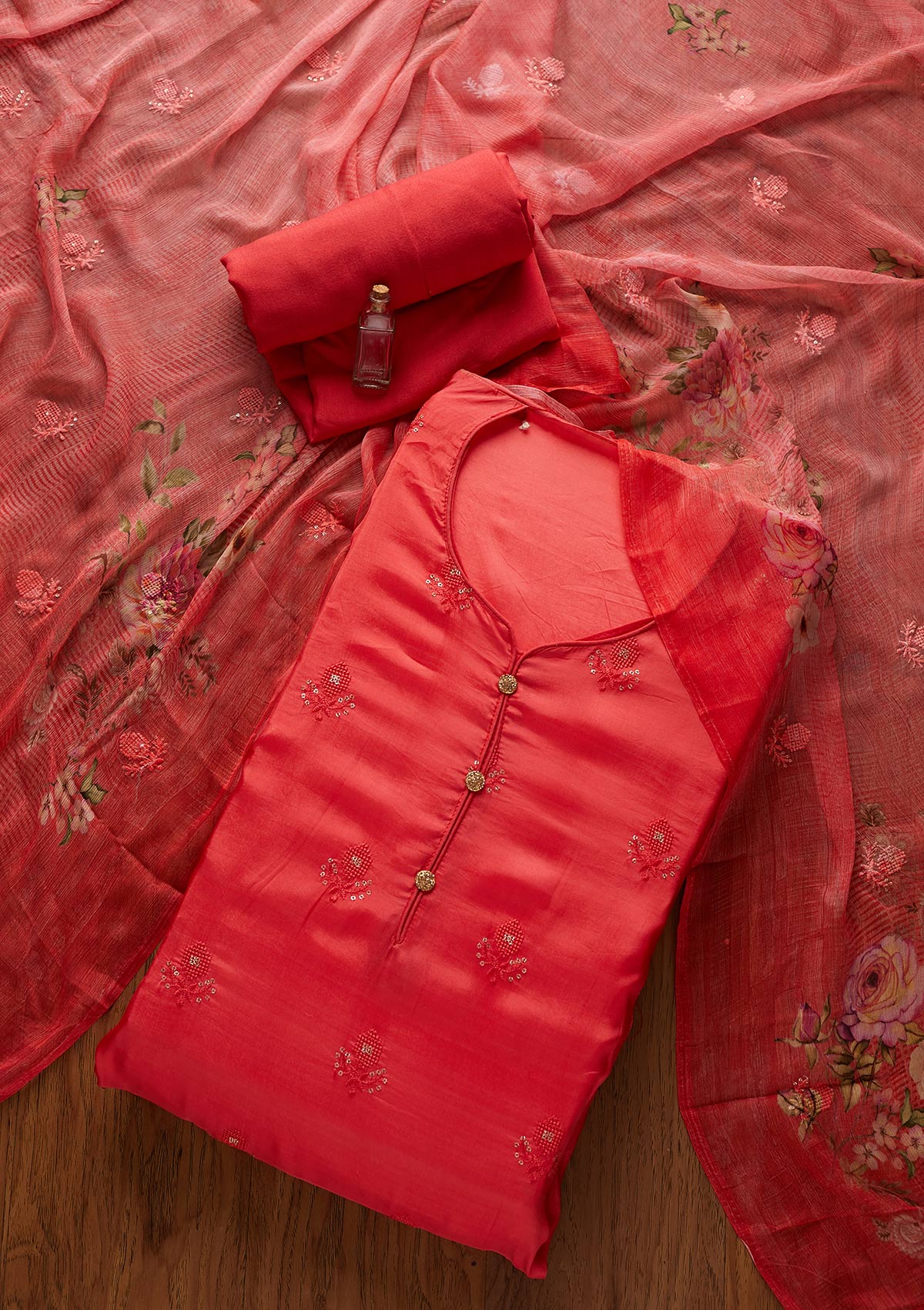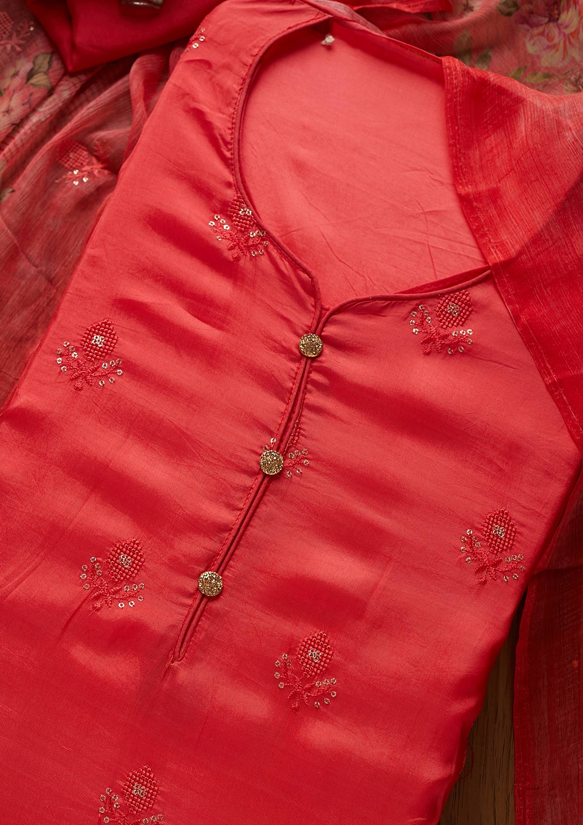 Red Salwar Suit In Satin Fabric. The Salwar Suit Is Embellished With Swarovski stone work. Accompanied with an unstitched bottom and dupatta. Comes With The Koskii Promise Of Premium Quality.