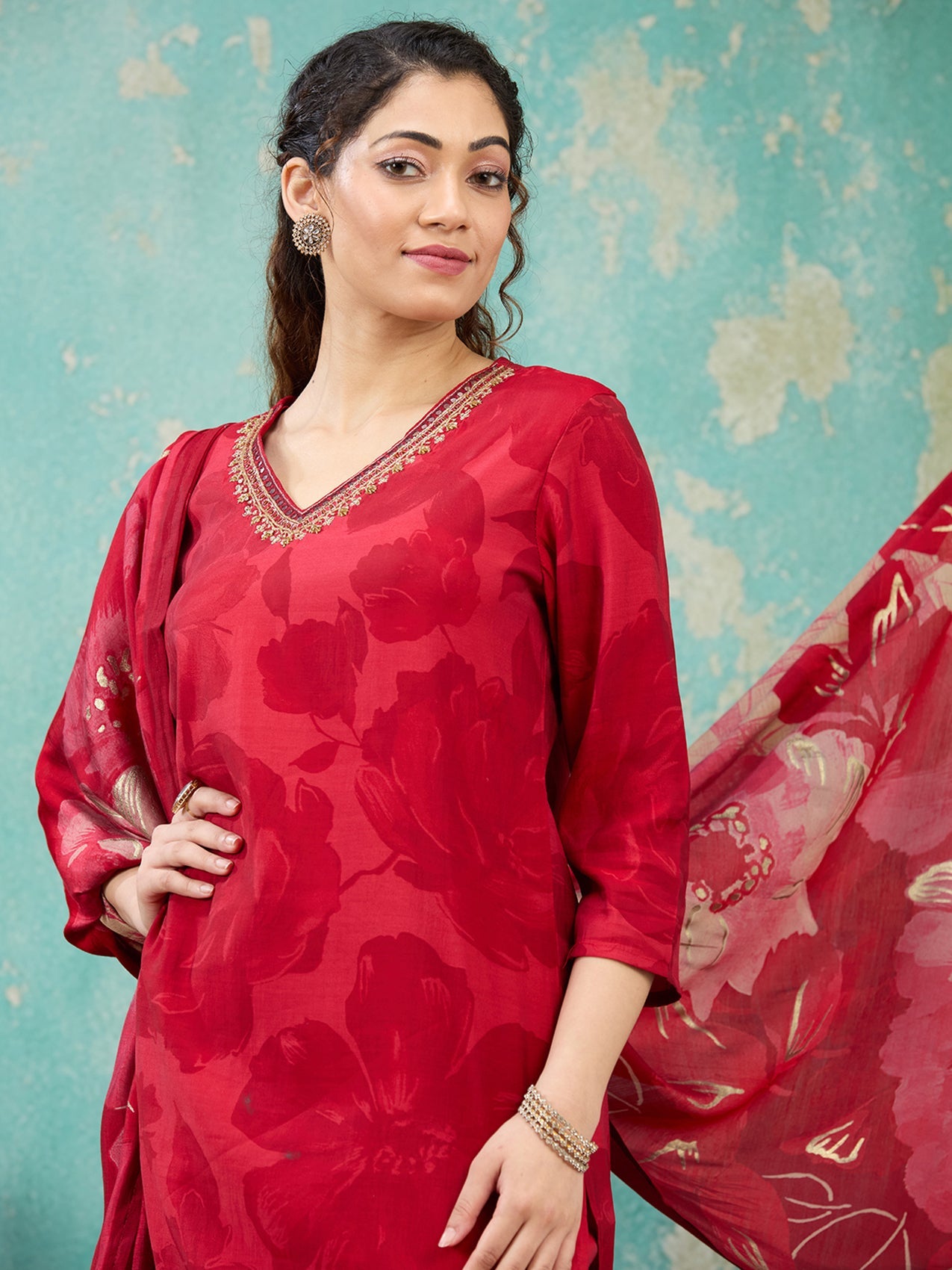 Red Salwar Suit in Satin fabric. The Salwar Suit is embellished with Threadwork embroidery. Accompanied with a bottom and dupatta. Comes with the Koskii promise of premium quality.