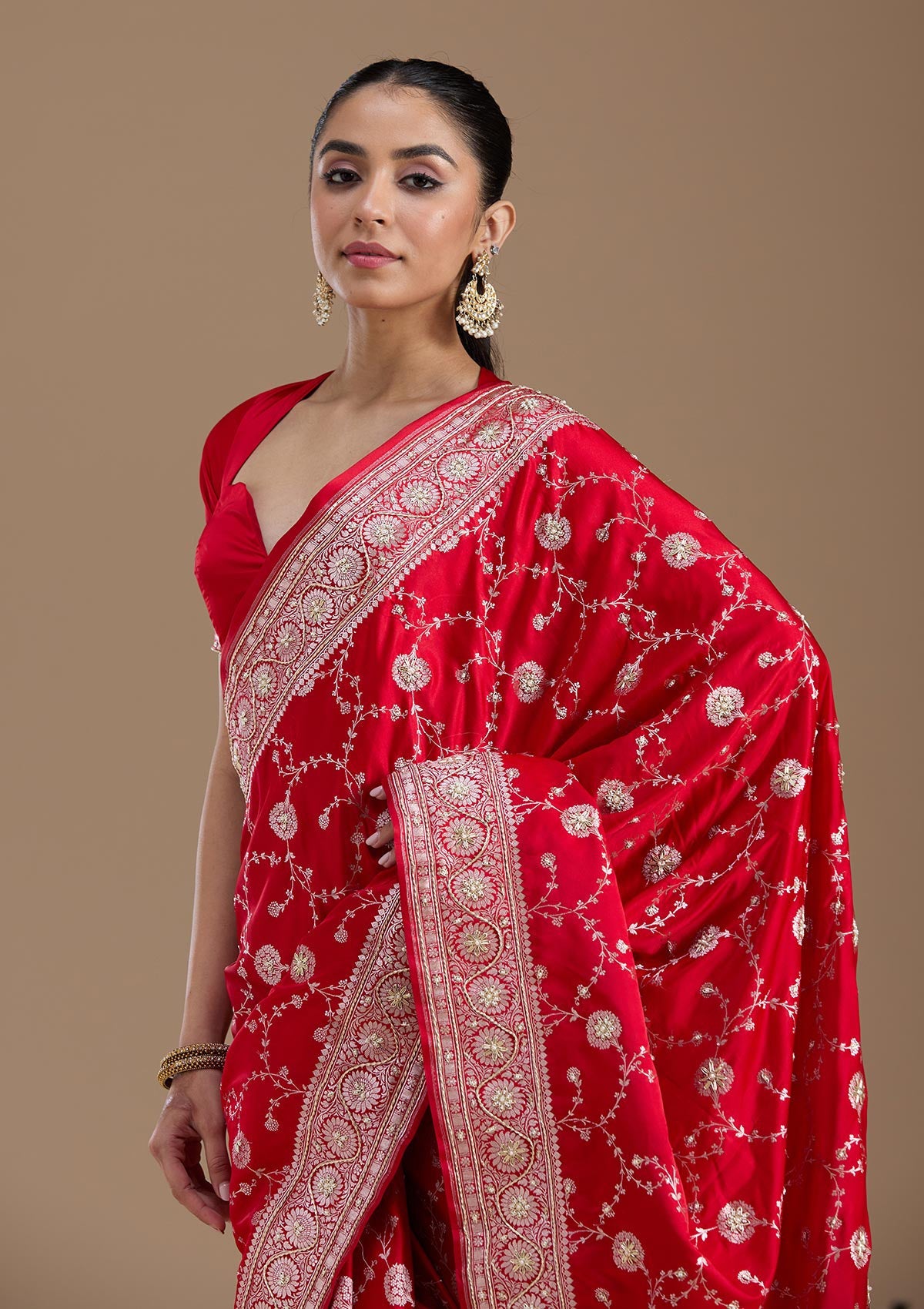 Red Silk_Saree in Art Silk fabric. The Silk_Saree is elevated with Zardozi (Silver) embroidery. It comes with an Unstitched blouse. Comes with the Koskii promise of premium quality.