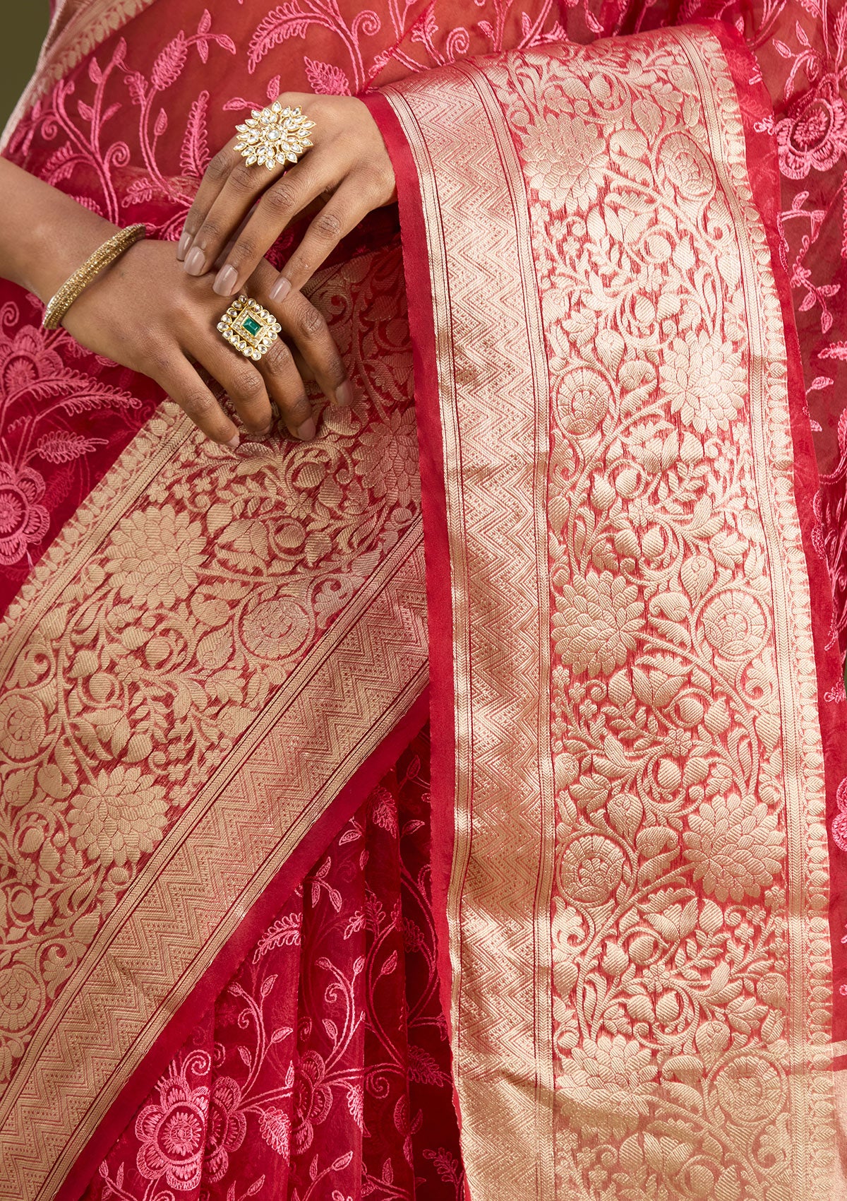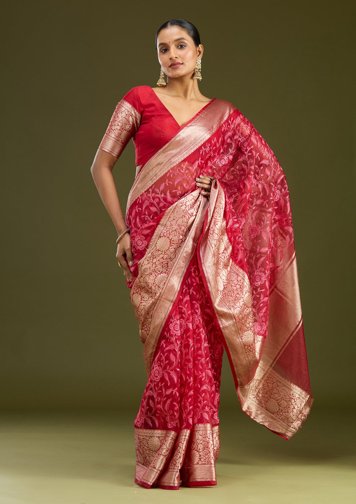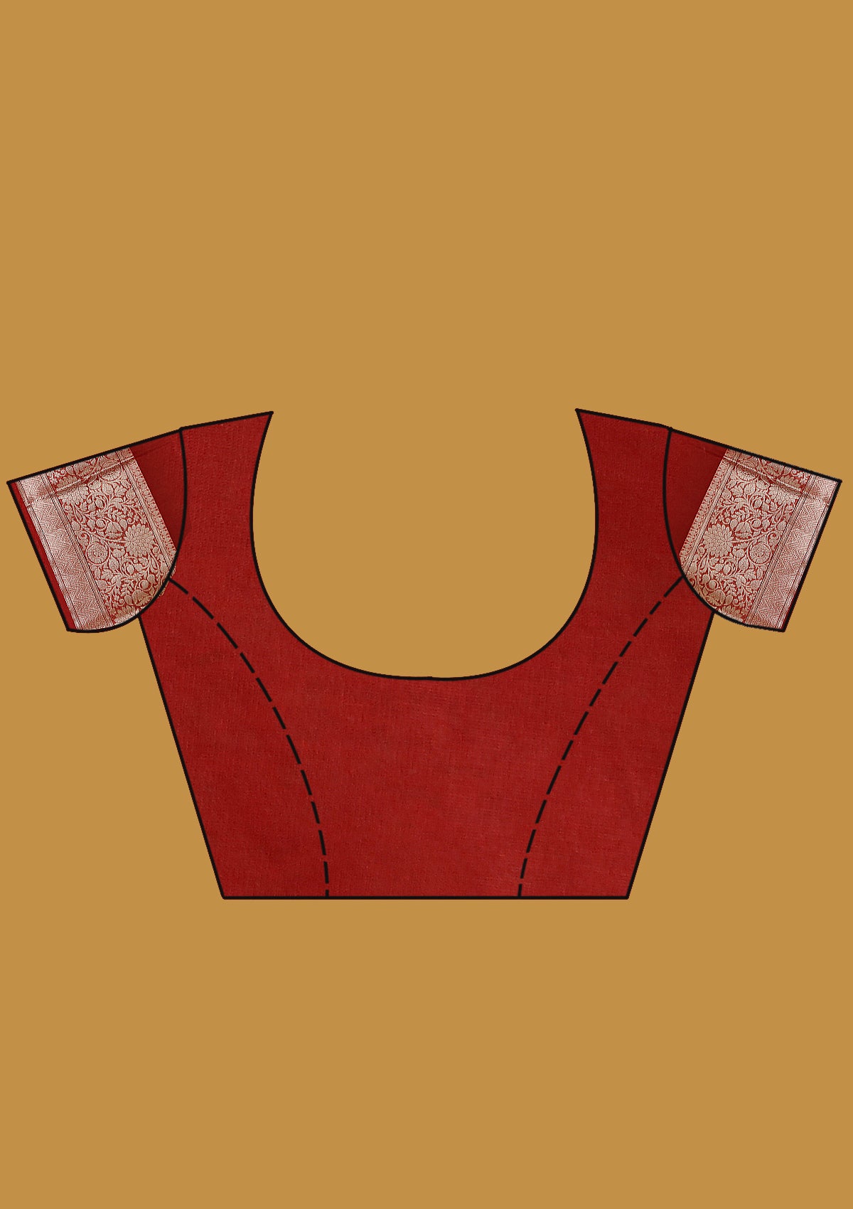 Red Silk_Saree in Cotton fabric. The Silk_Saree is elevated with Zariwork embroidery. It comes with an Unstitched blouse. Comes with the Koskii promise of premium quality.