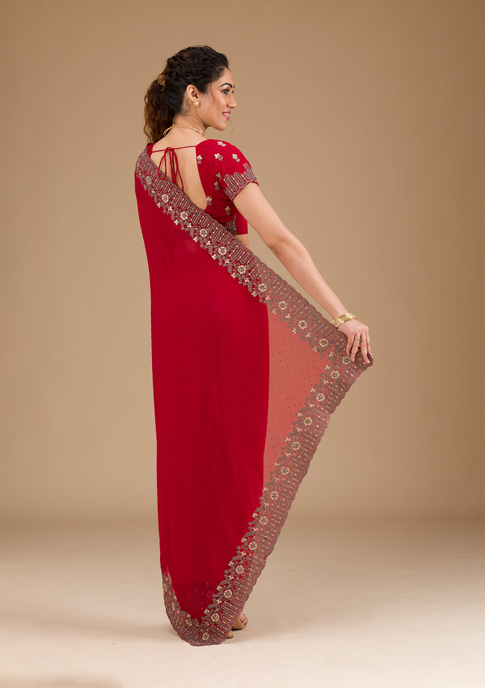 Red Saree in Georgette fabric. The Saree is elevated with Zariwork embroidery. It comes with an Unstitched blouse. Comes with the Koskii promise of premium quality.