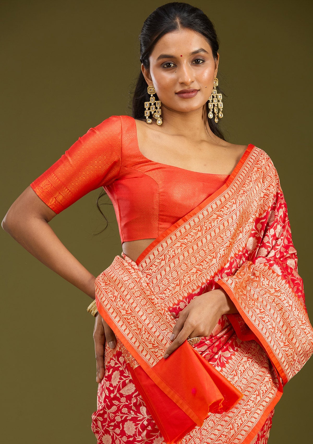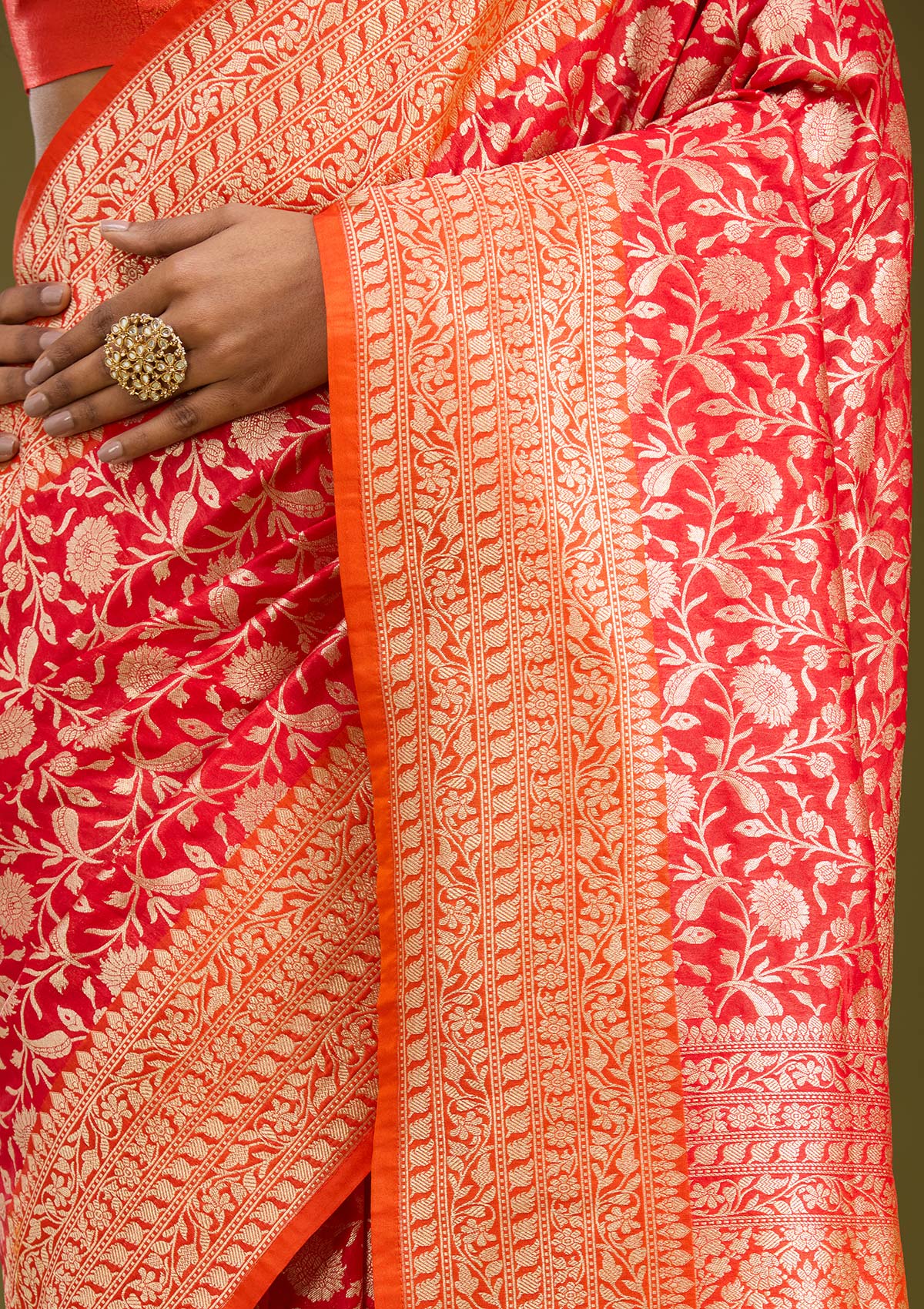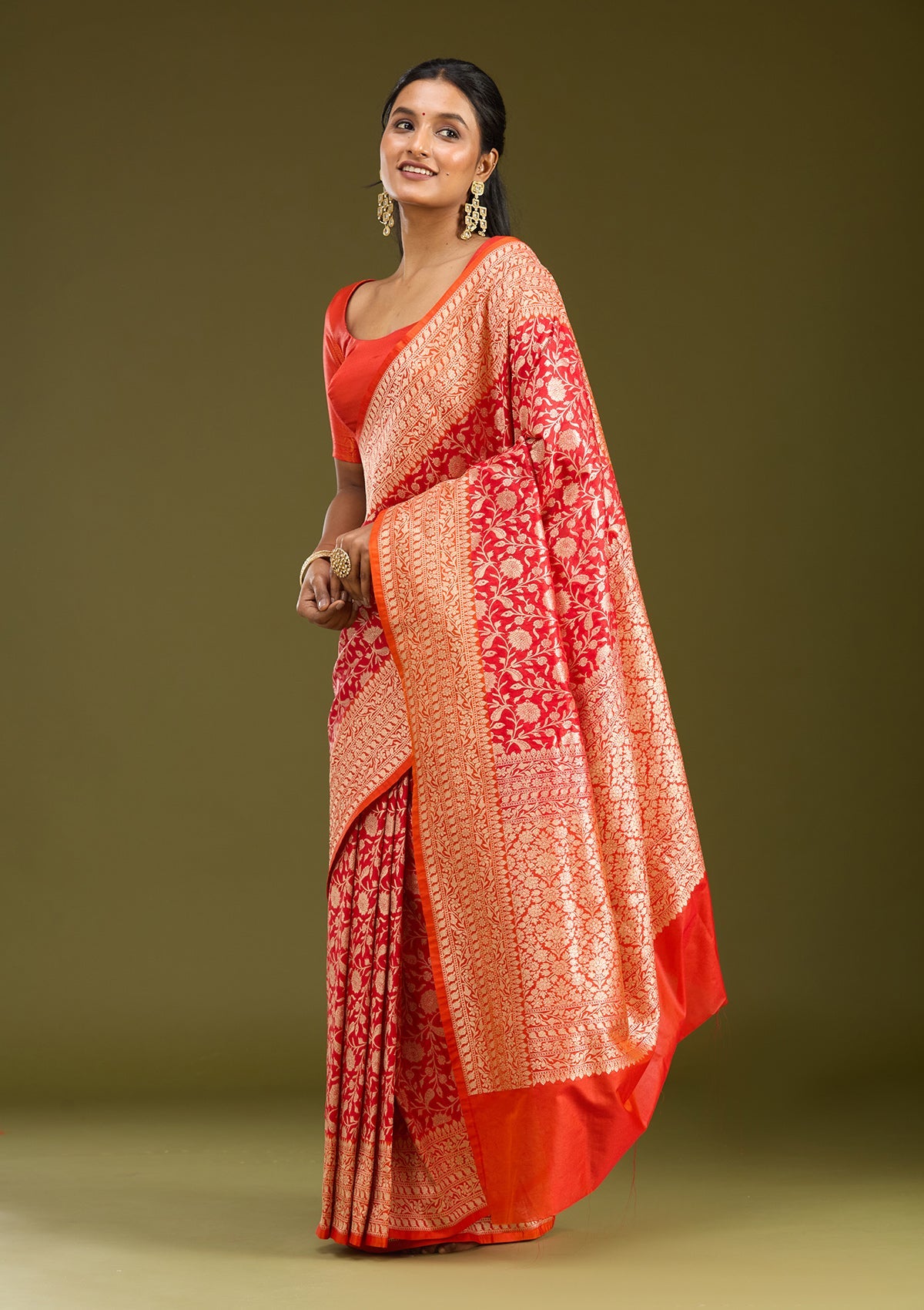 Red Silk_Saree in Art Silk fabric. The Silk_Saree is elevated with Zariwork (Gold) embroidery. It comes with an Unstitched blouse. Comes with the Koskii promise of premium quality.