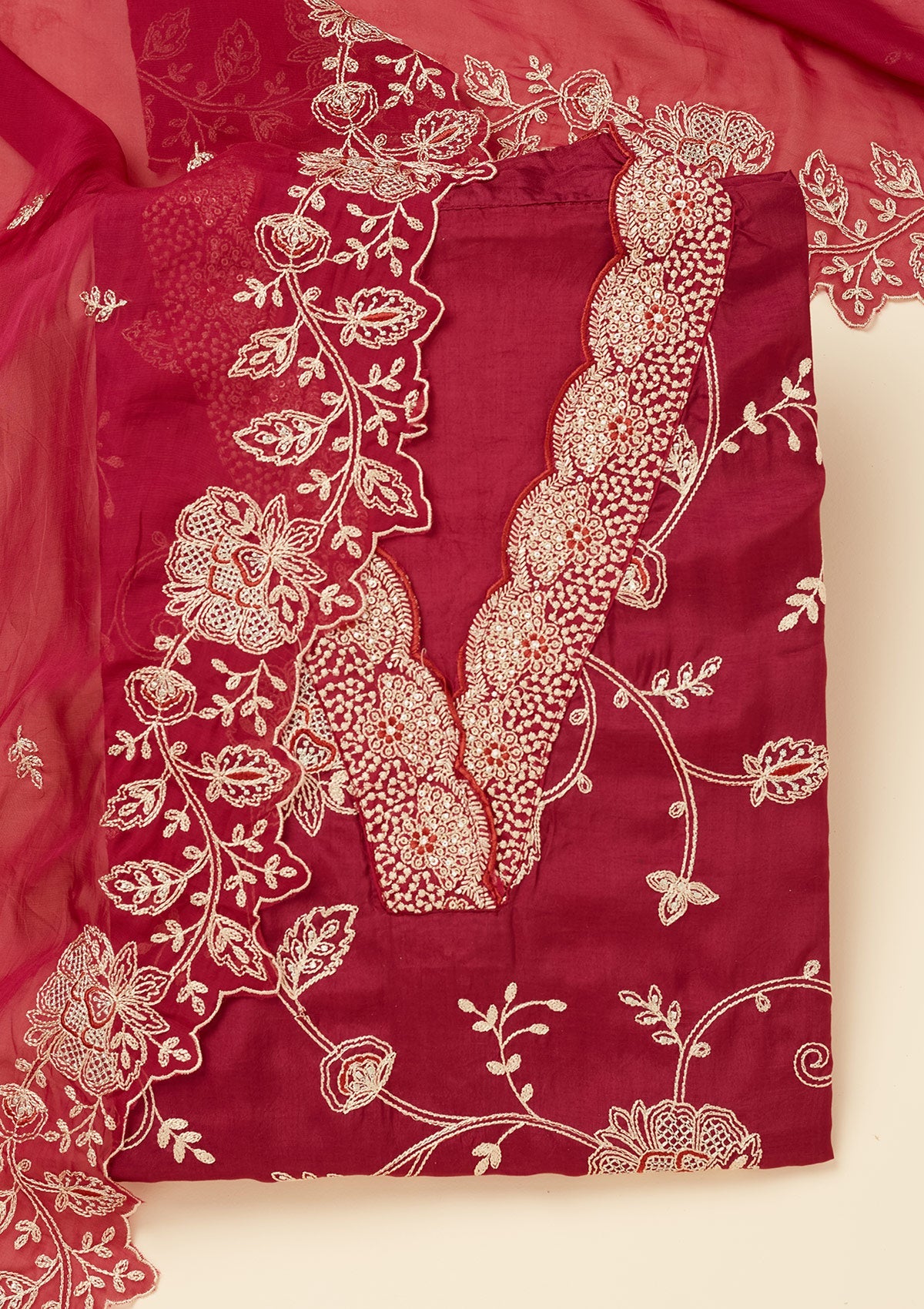 Red Zariwork (Gold) Chinon Unstitched Salwar Suit