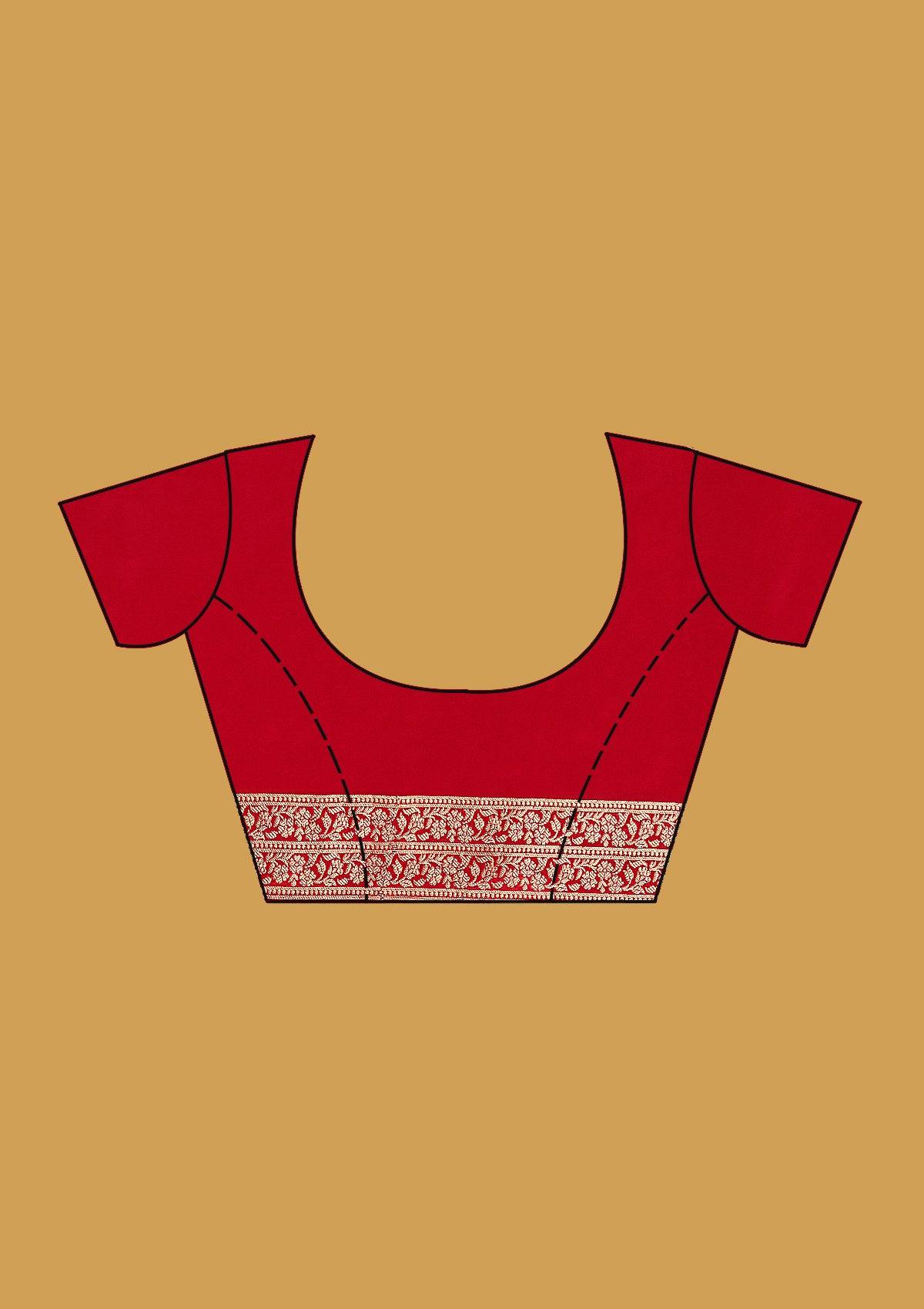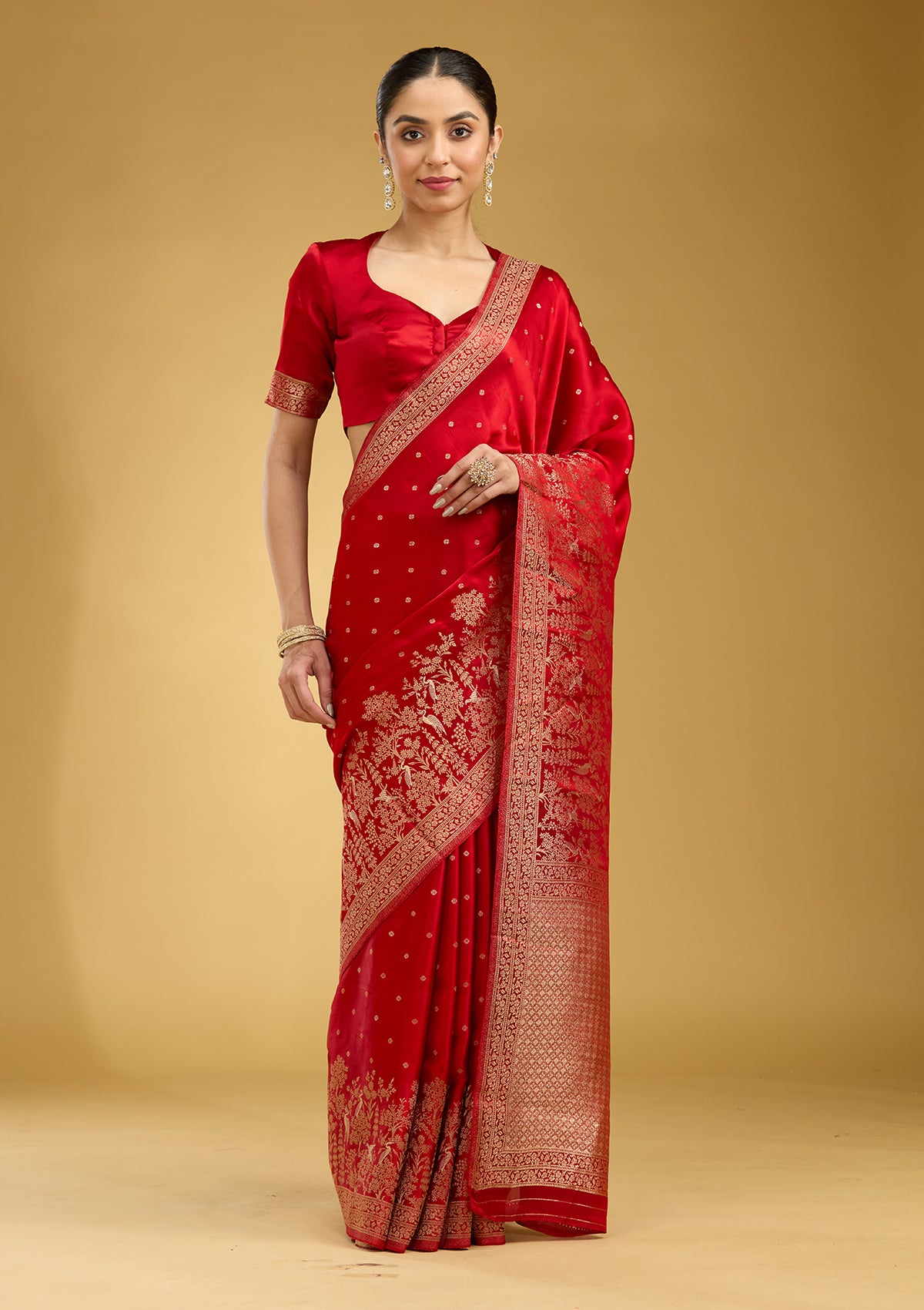 Red Silk_Saree in Semi Crepe fabric. The Silk_Saree is elevated with Zariwork (Gold) embroidery. It comes with an Unstitched blouse. Comes with the Koskii promise of premium quality.