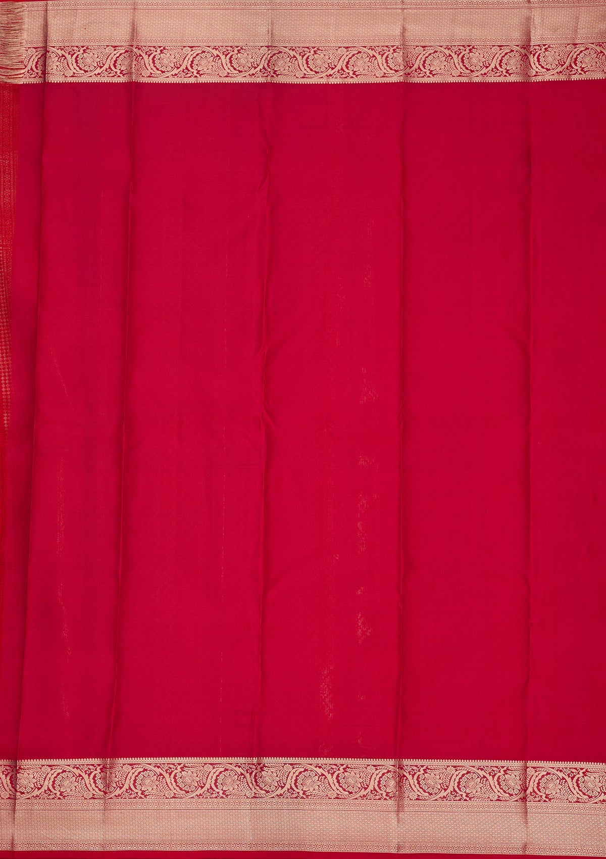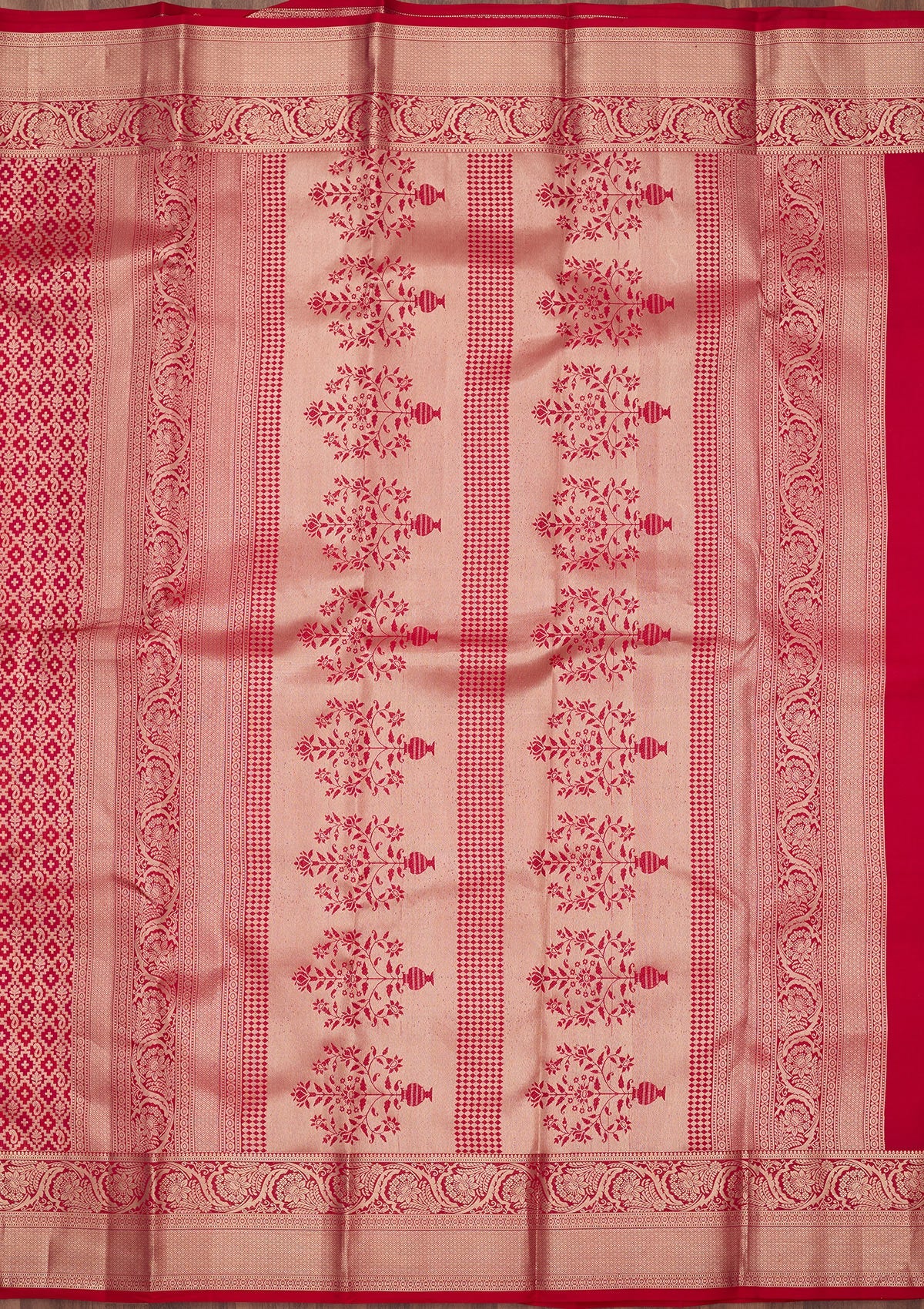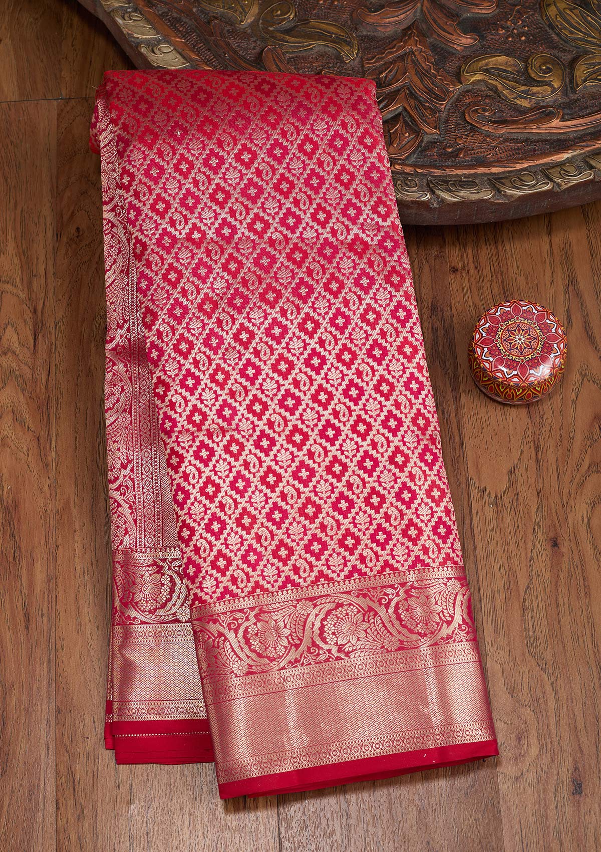 Red Silk_Saree in Silk fabric. The Silk_Saree is elevated with Zariwork (Gold) embroidery. It comes with an Unstitched blouse. Comes with the Koskii promise of premium quality.
