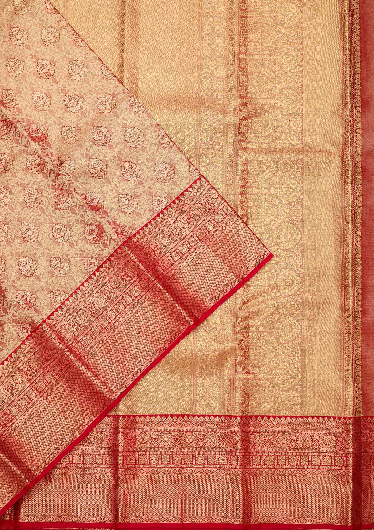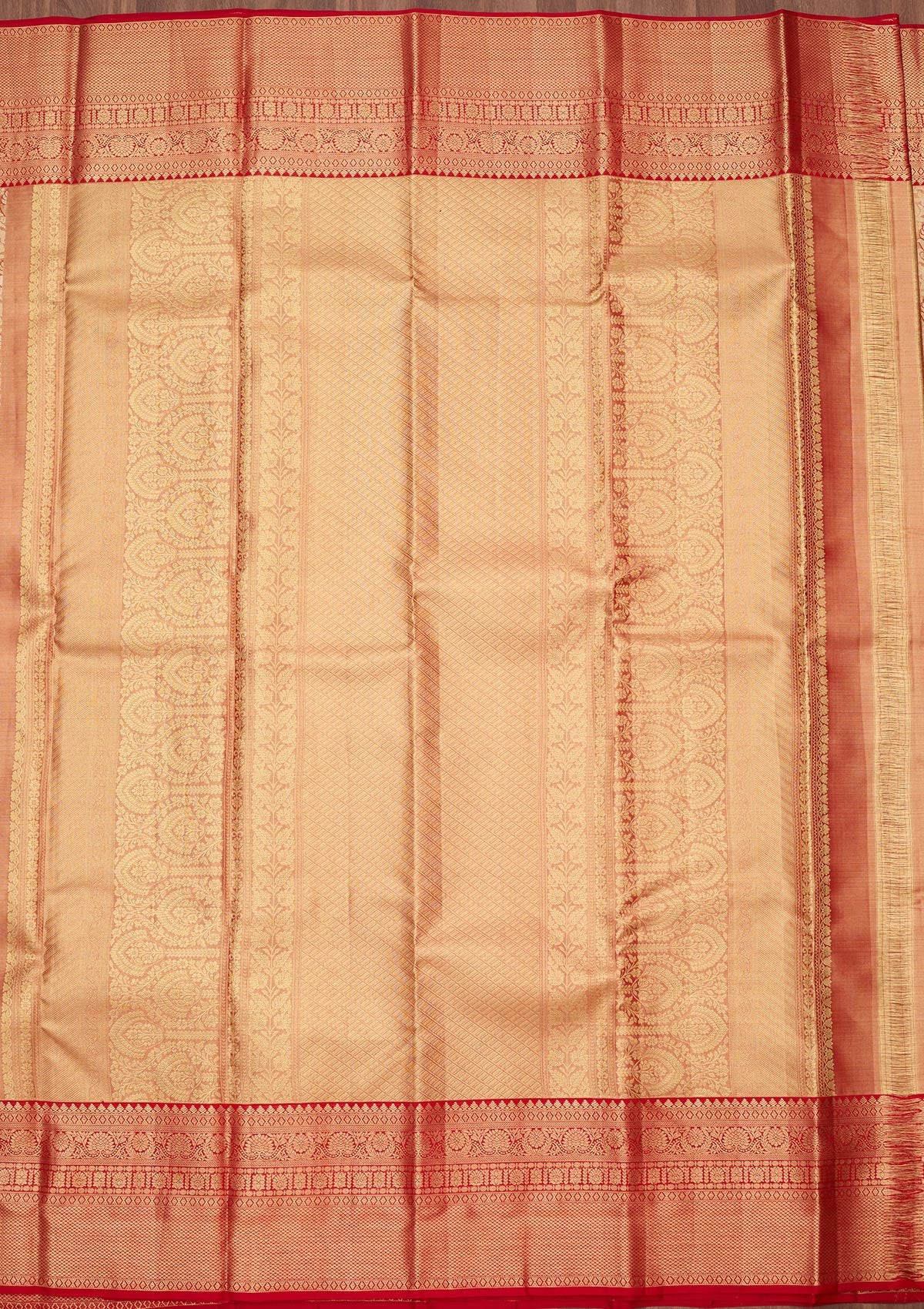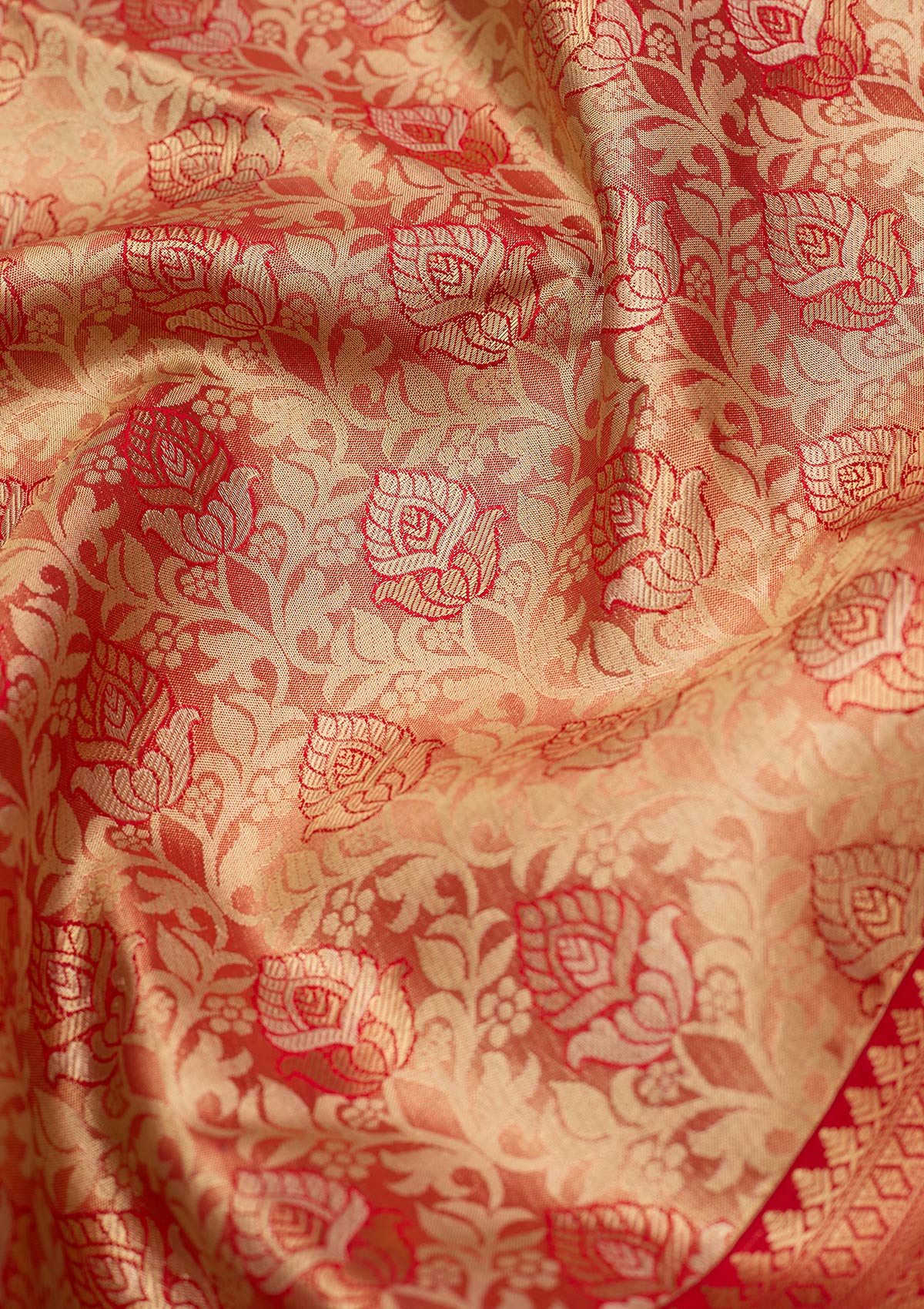 Red Silk_Saree in Silk fabric. The Silk_Saree is elevated with Zariwork (Gold) embroidery. It comes with an Unstitched blouse. Comes with the Koskii promise of premium quality.