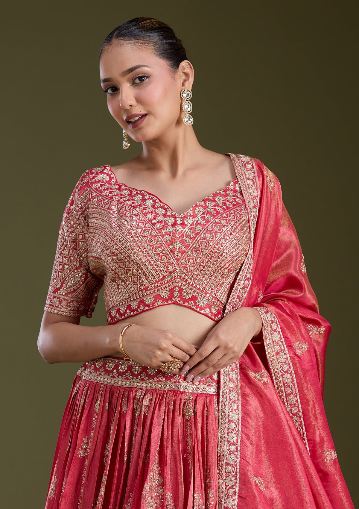 Red Readymade Lehenga in Tissue fabric. The Lehenga is embellished with Zariwork (Gold) embroidery. Accompanied with an Readymade blouse and dupatta. Comes with the Koskii promise of premium quality.