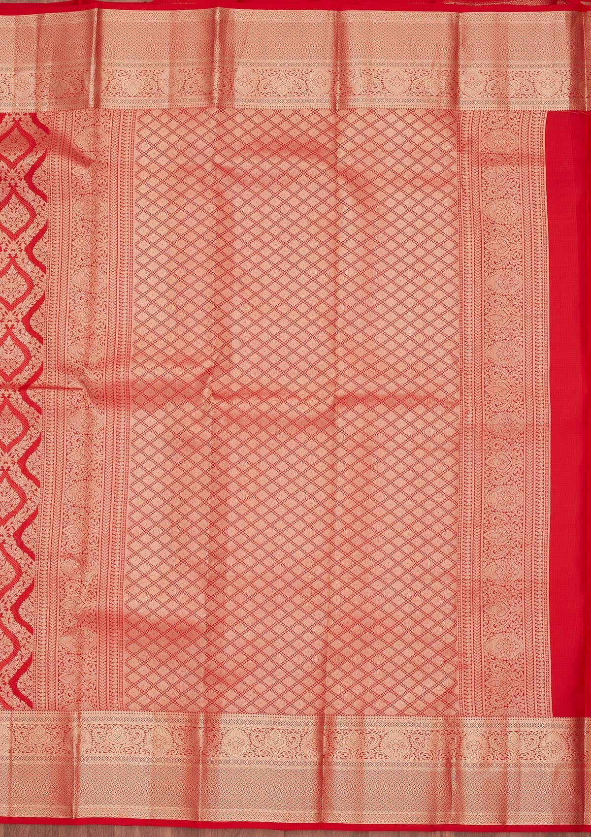 Red Silk Saree in Pure Silk fabric. The Silk Saree is elevated with Zariwork embroidery. It comes with an Unstitched blouse. Comes with the Koskii promise of premium quality.