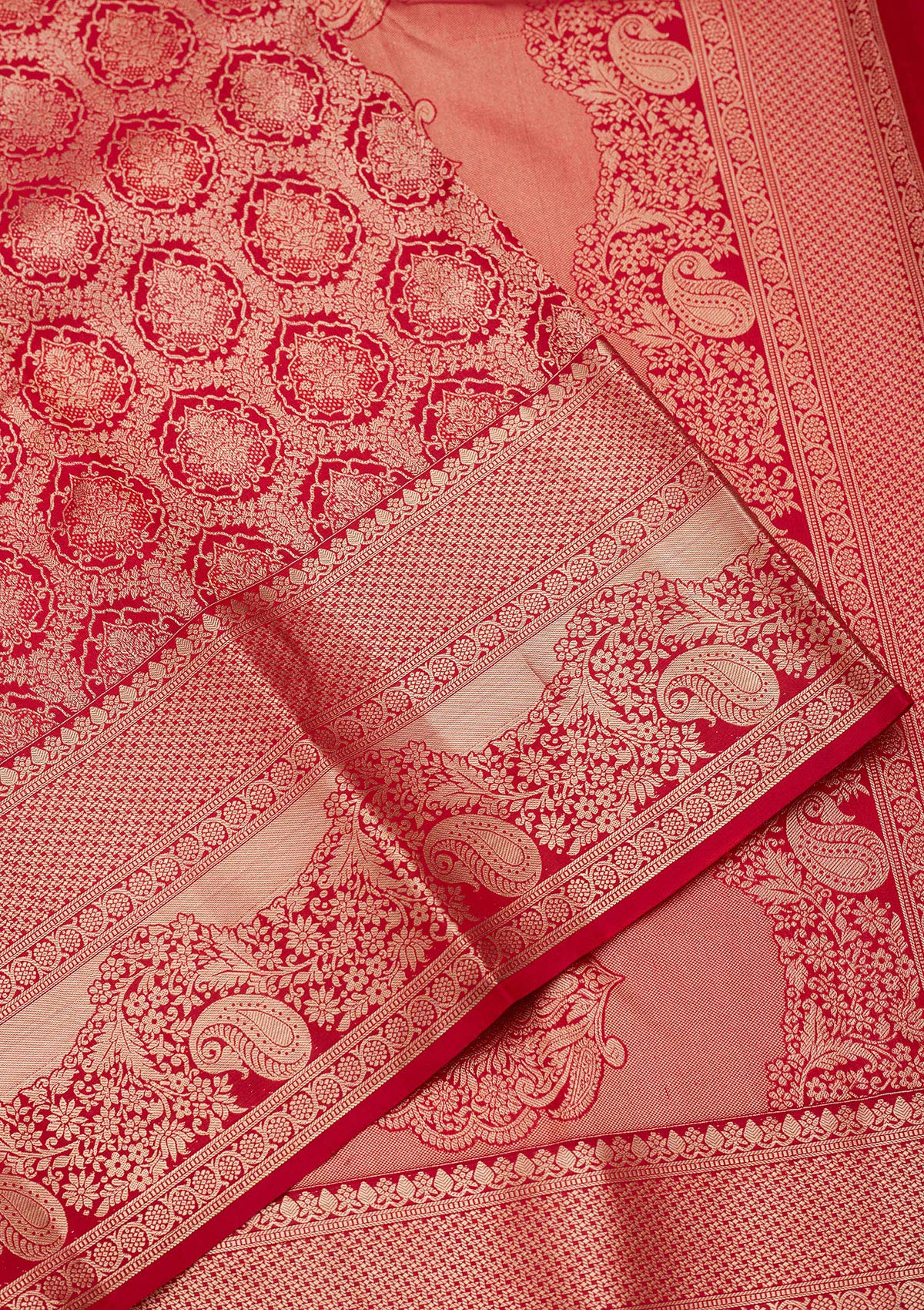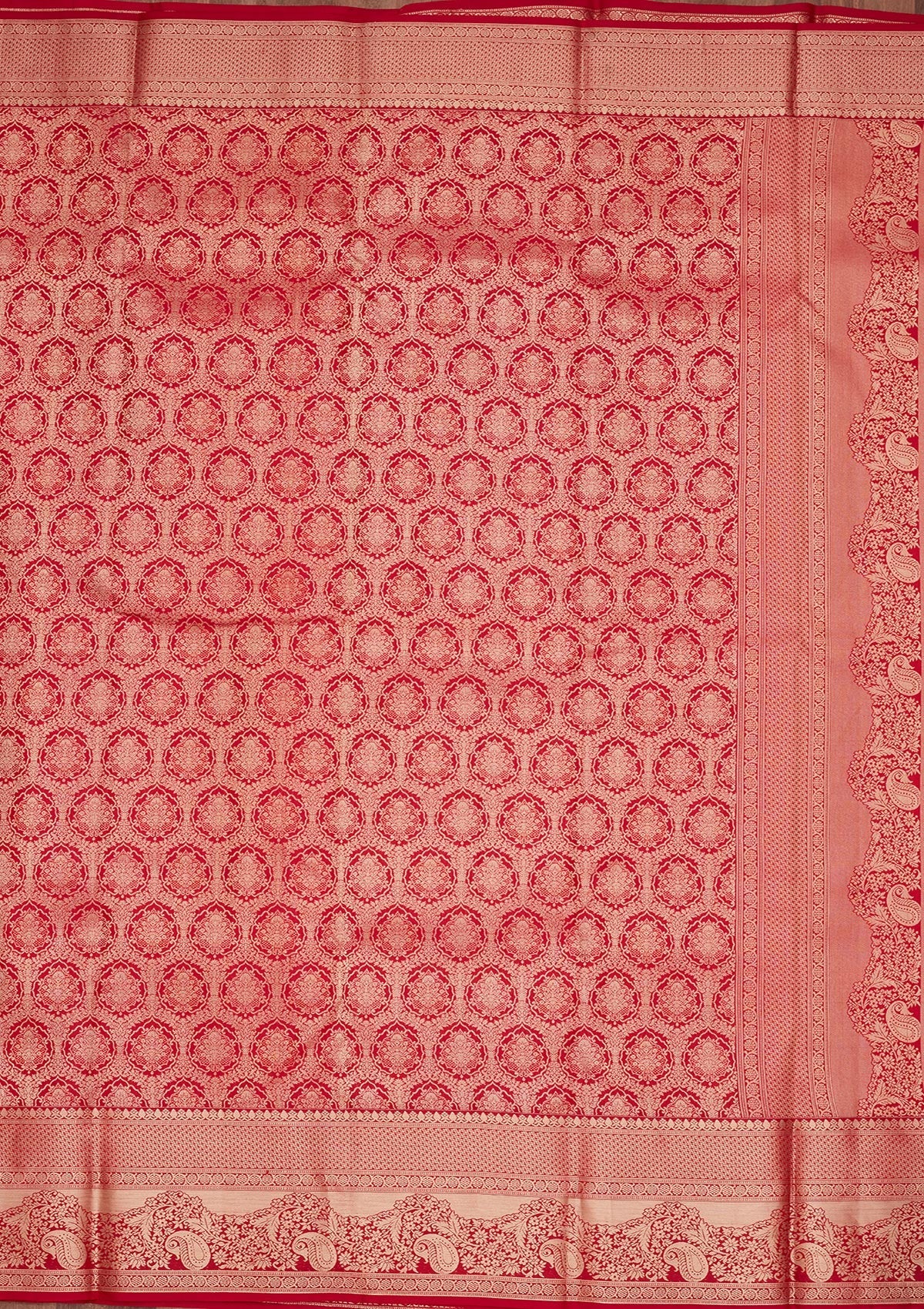 Red Silk Saree in Pure Silk fabric The Silk Saree is elevated with Zariwork embroidery It comes with an Unstitched blouse Comes with the Koskii promise of premium quality.