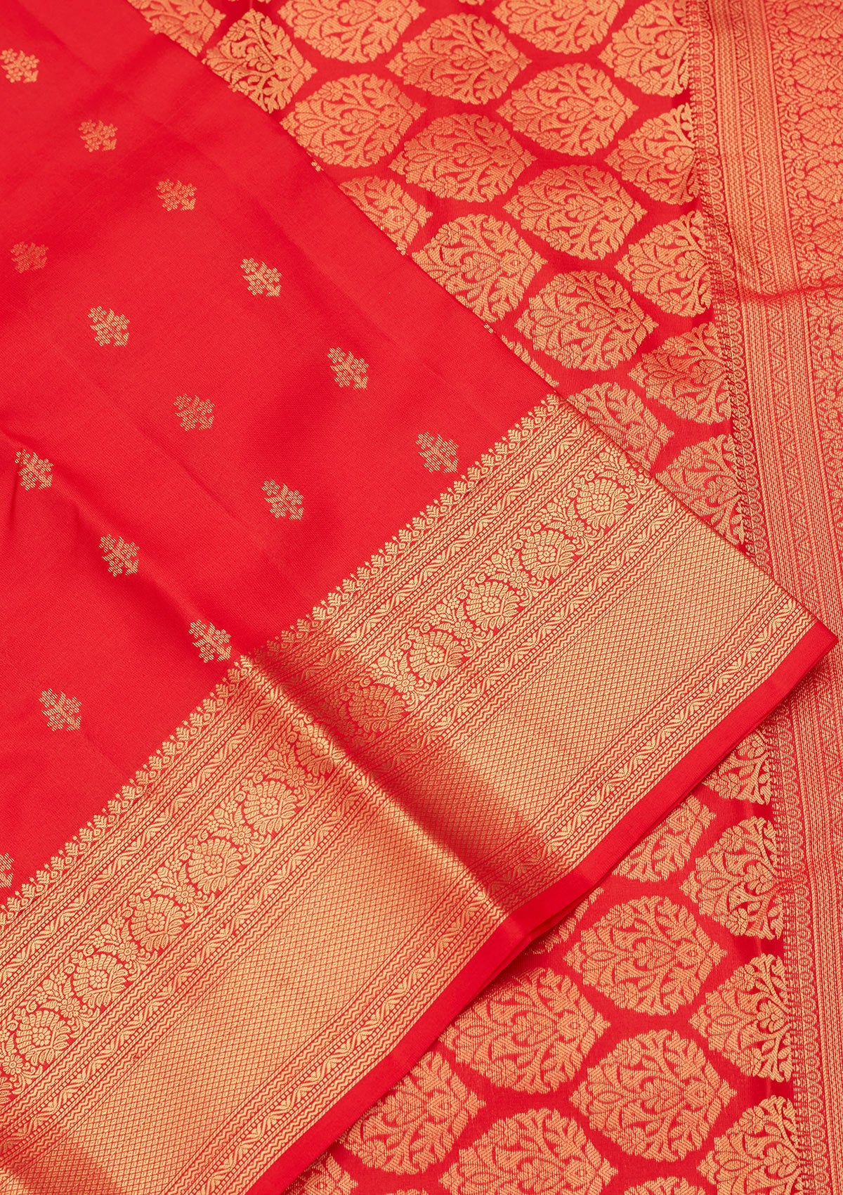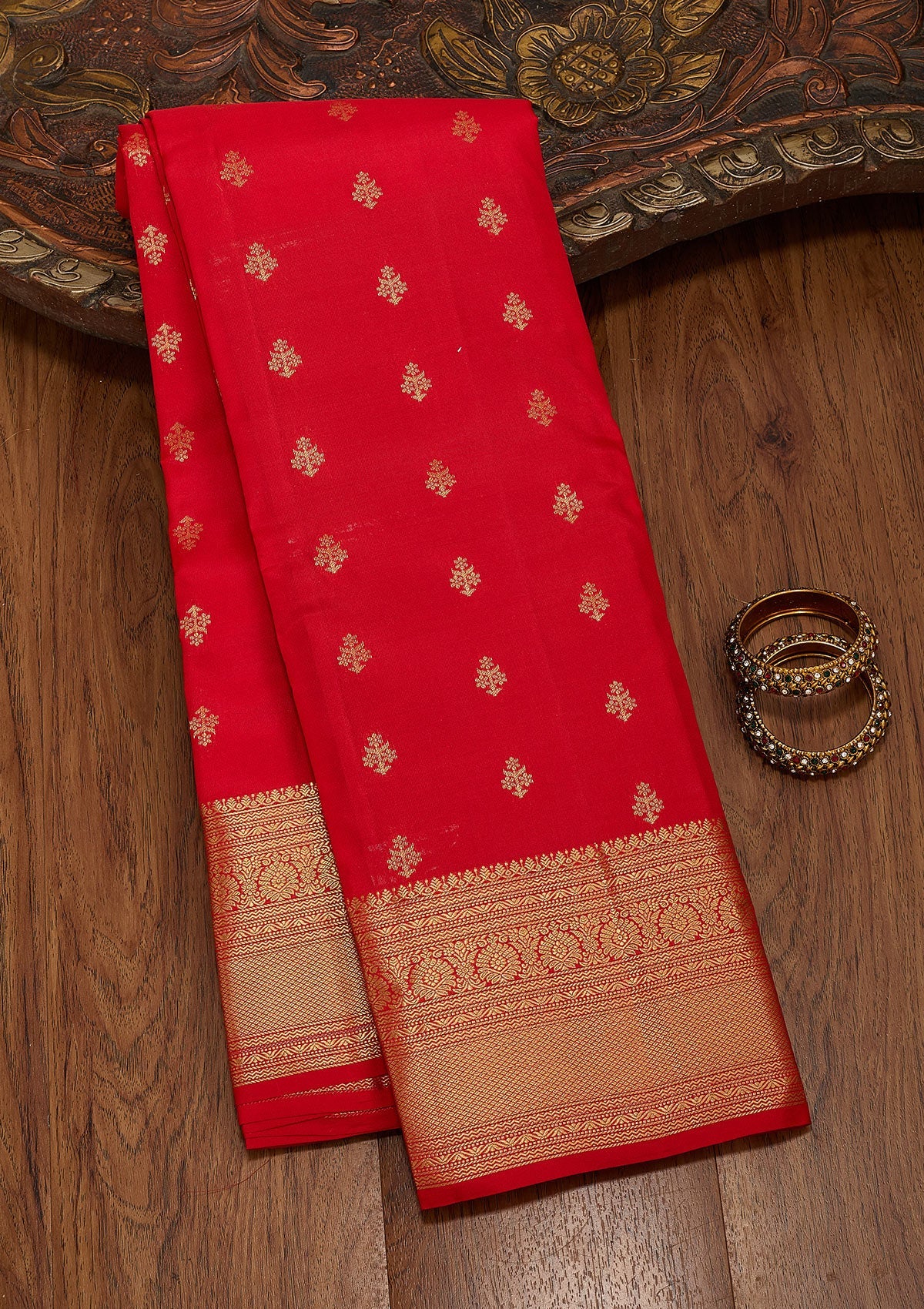 Red Silk Saree in Pure Silk fabric The Silk Saree is elevated with Zariwork embroidery It comes with an Unstitched blouse Comes with the Koskii promise of premium quality.