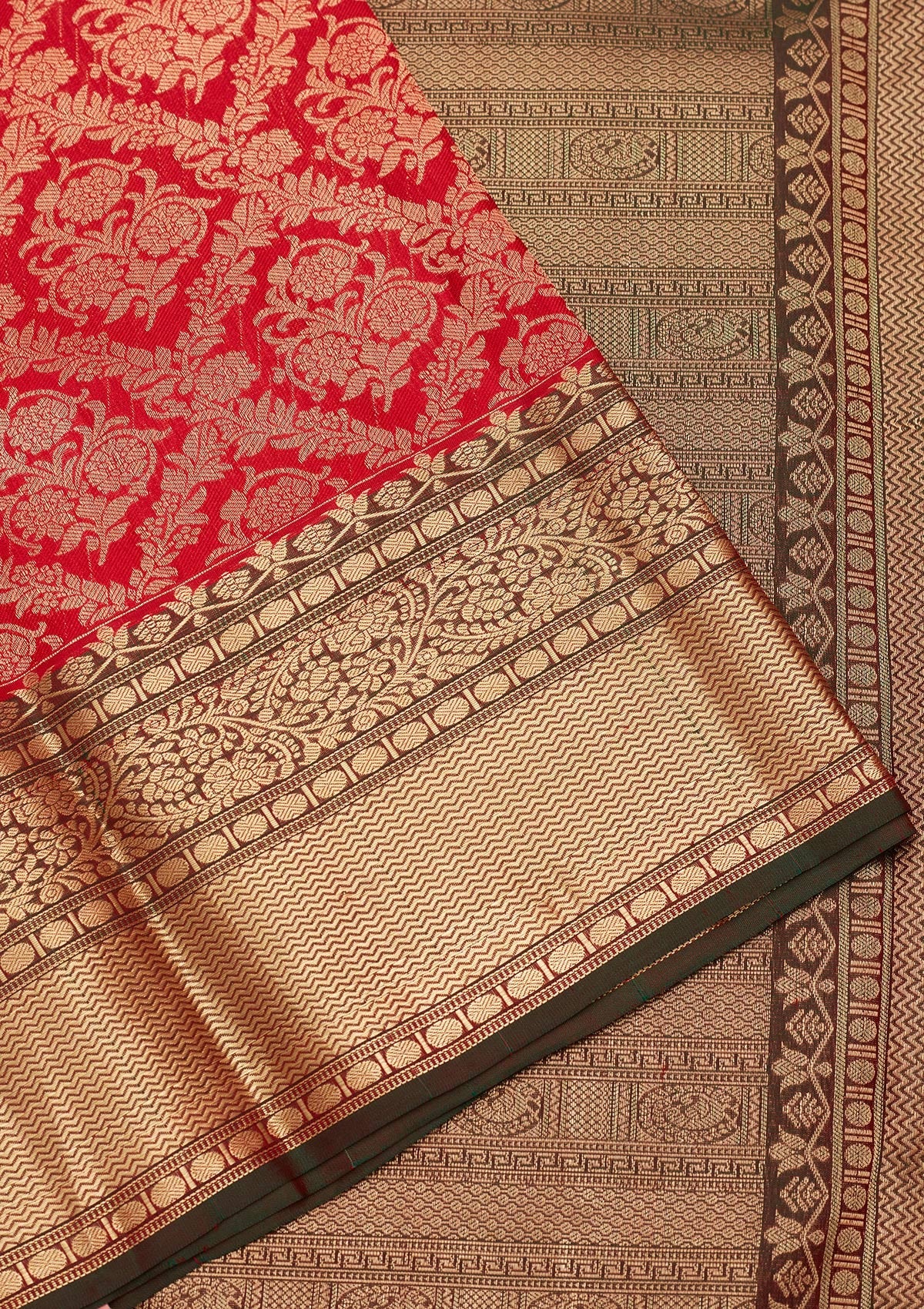 Red Silk Saree in Pure Silk fabric. The Silk Saree is elevated with Zariwork embroidery. It comes with an Unstitched blouse. Comes with the Koskii promise of premium quality.