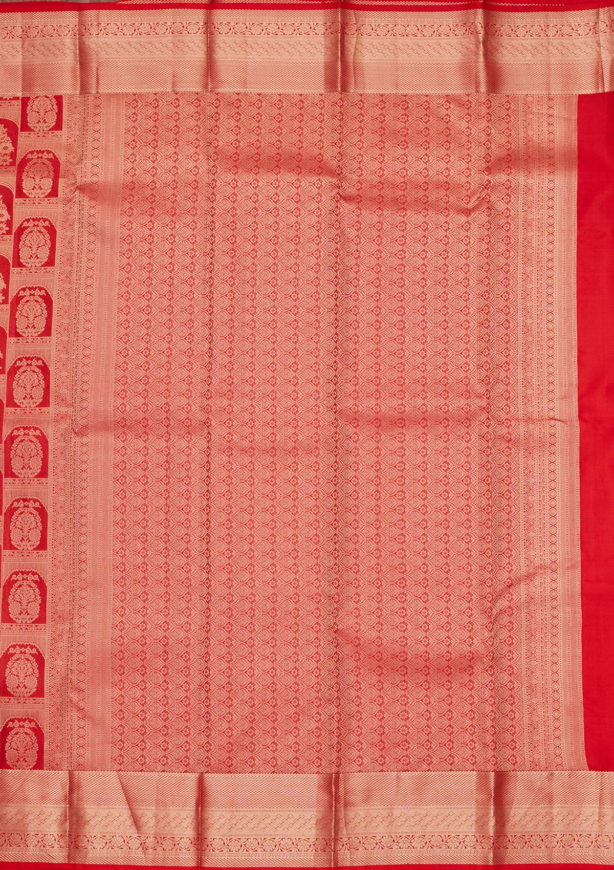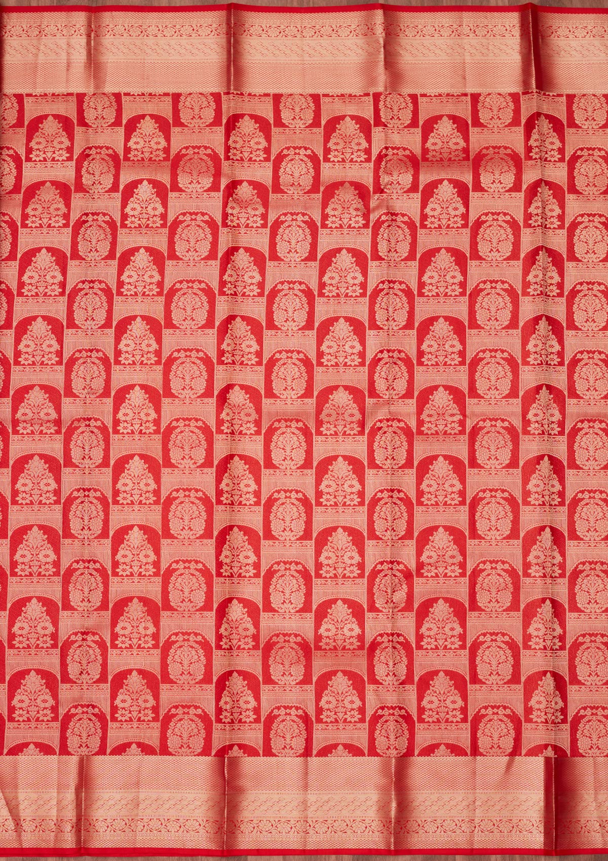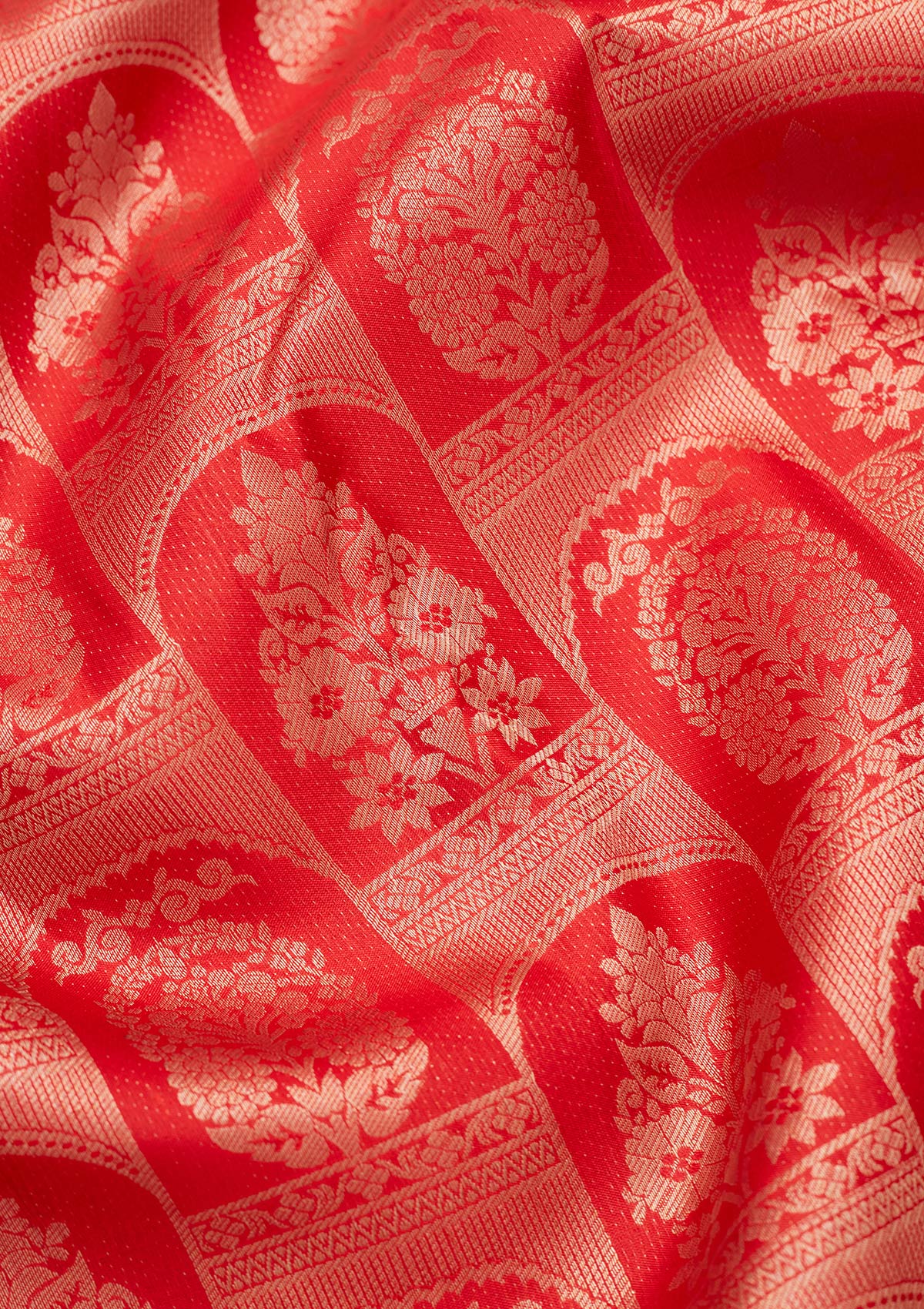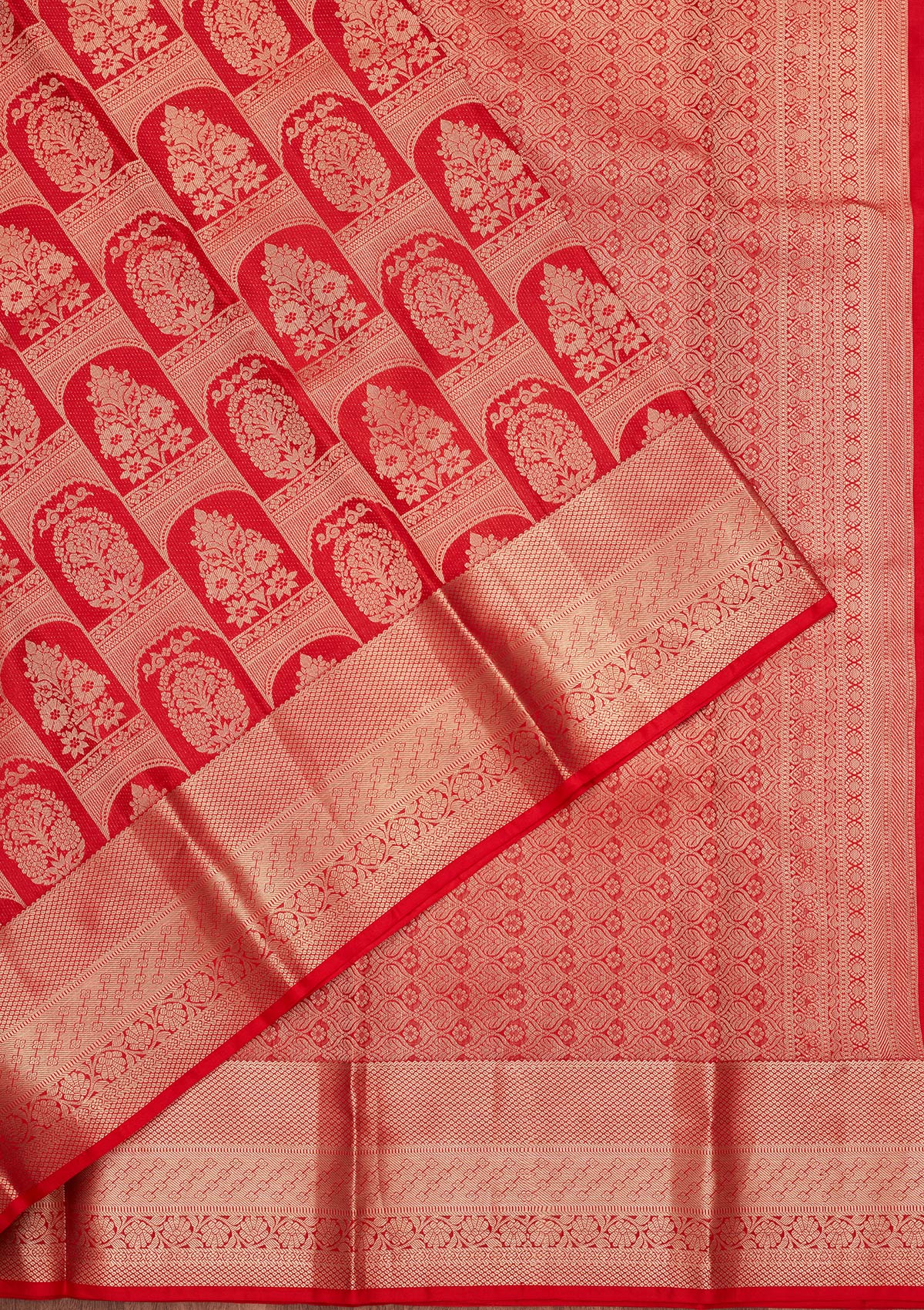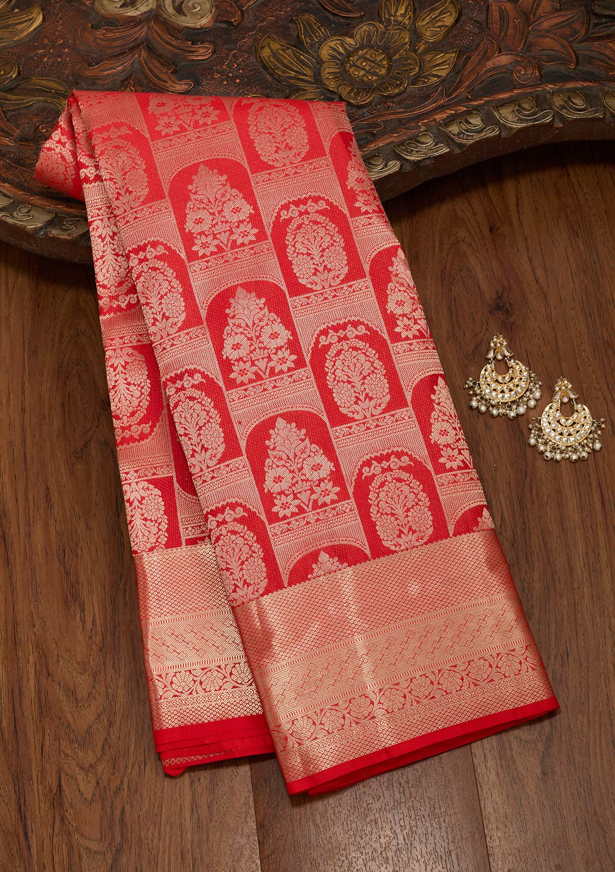 Red Silk Saree in Pure Silk fabric. The Silk Saree is elevated with Zariwork embroidery. It comes with an Unstitched blouse. Comes with the Koskii promise of premium quality.