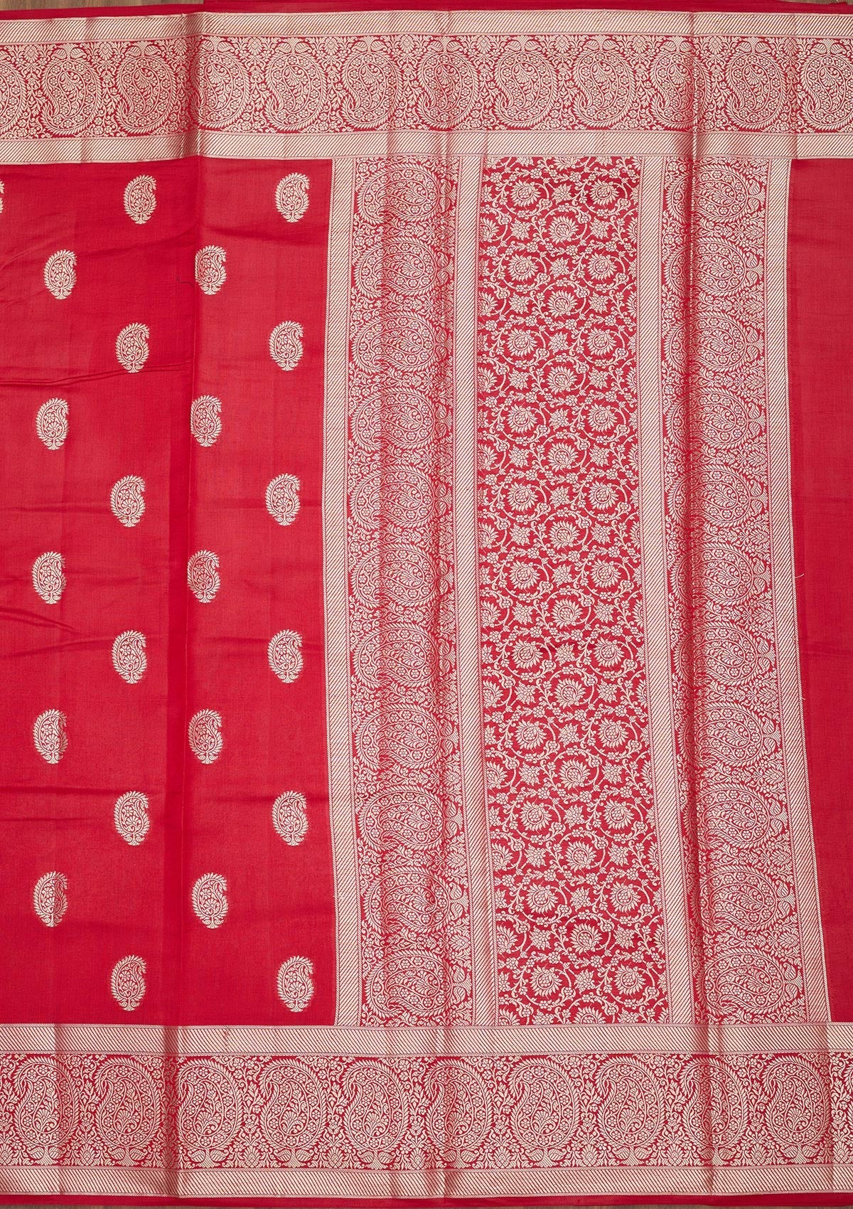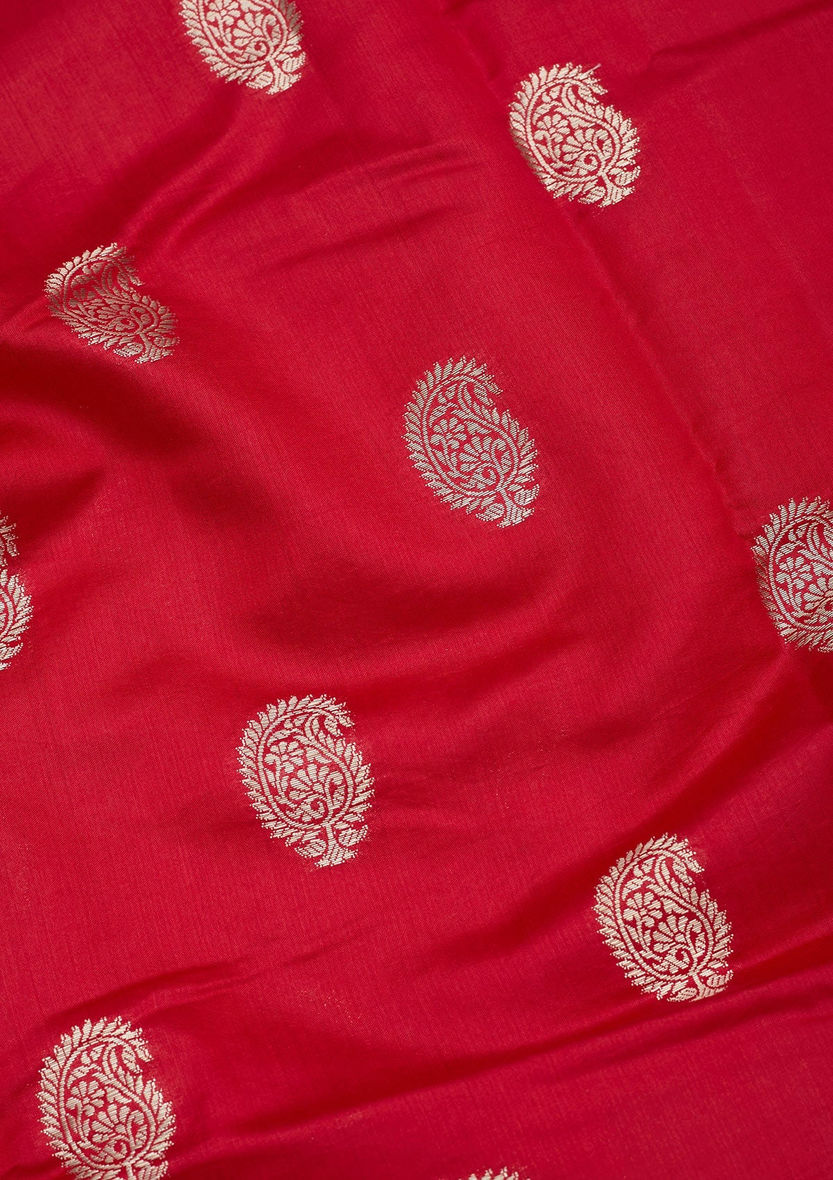 Red Silk_Saree in Pure Silk fabric. The Silk_Saree is elevated with Zariwork embroidery. It comes with an Unstitched blouse. Comes with the Koskii promise of premium quality.