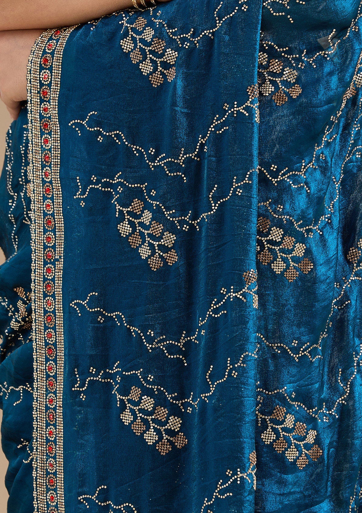 Royal Blue Saree in Tissue fabric. The Saree is elevated with Stonework (Gold) embroidery. It comes with an Unstitched blouse. Comes with the Koskii promise of premium quality.