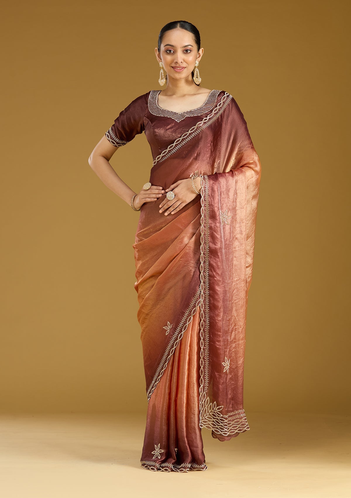 Rust Saree in Tissue fabric. The Saree is elevated with Stonework (Gold) embroidery. It comes with an Unstitched blouse. Comes with the Koskii promise of premium quality.