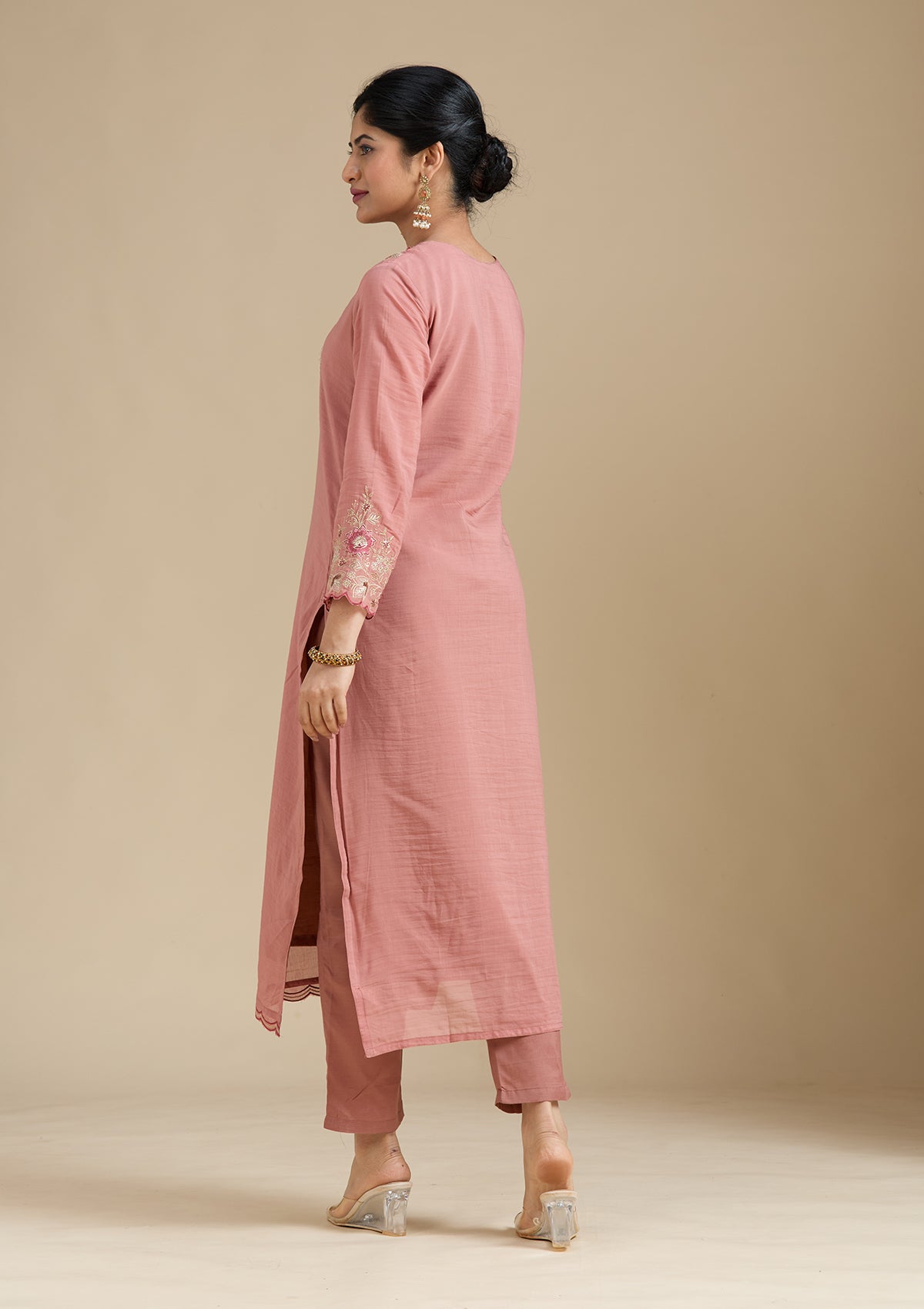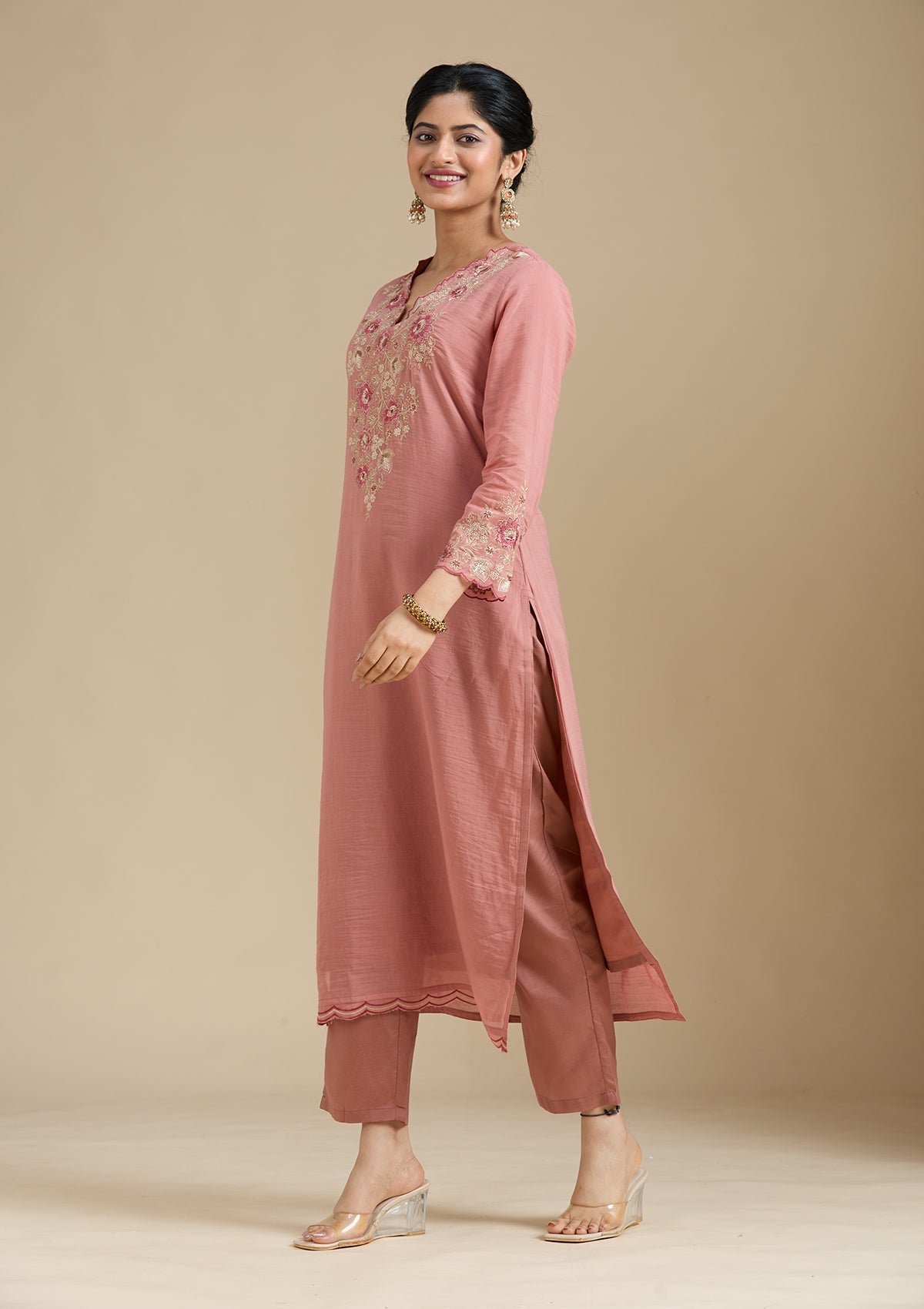 Rust Salwar Suit in Chanderi fabric. The Salwar Suit is embellished with Threadwork embroidery. Accompanied with a bottom and dupatta. Comes with the Koskii promise of premium quality.