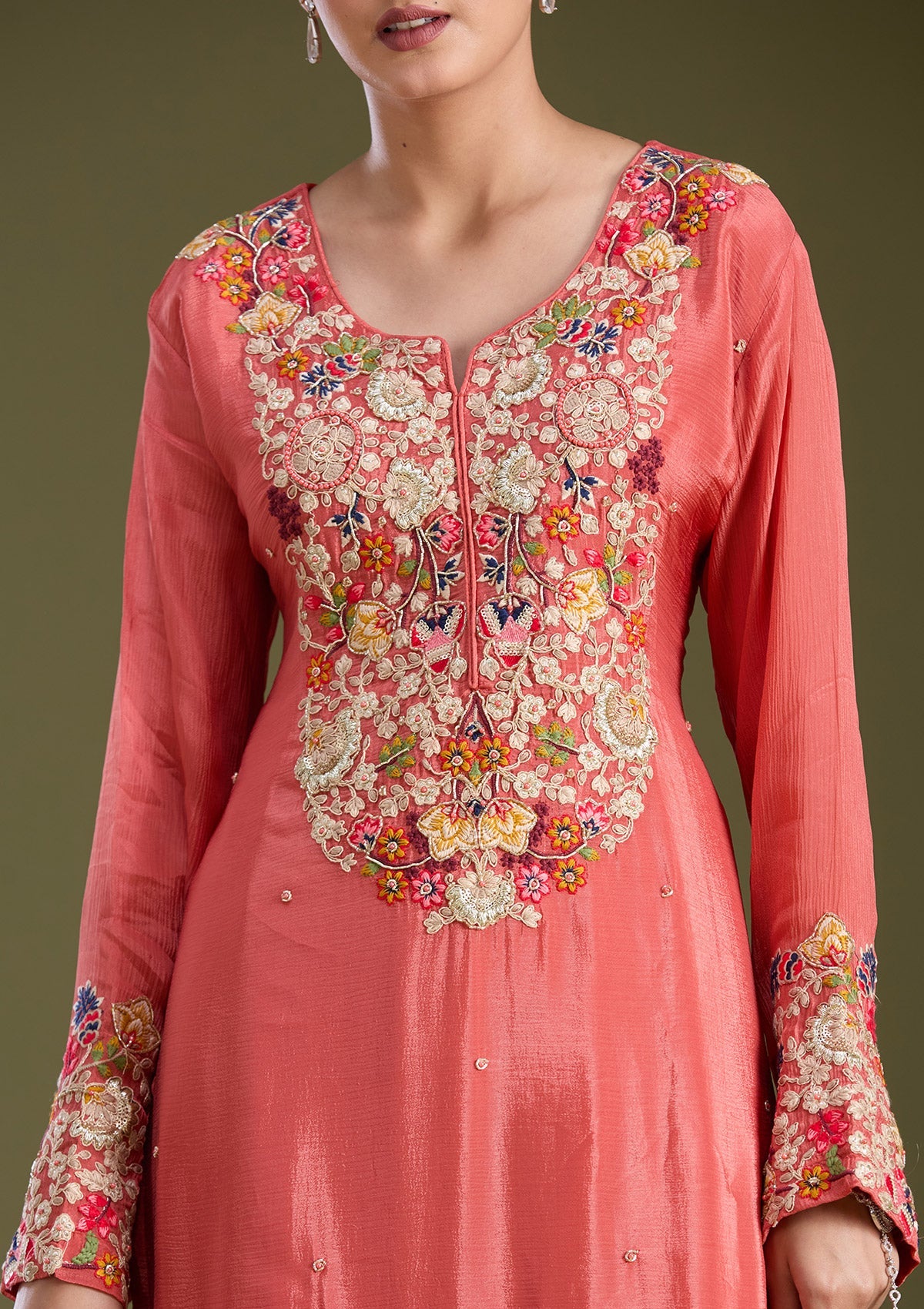 Rust Salwar_RM in Crepe fabric. The Salwar_RM is embellished with Threadwork embroidery. Accompanied with a bottom and dupatta. Comes with the Koskii promise of premium quality.