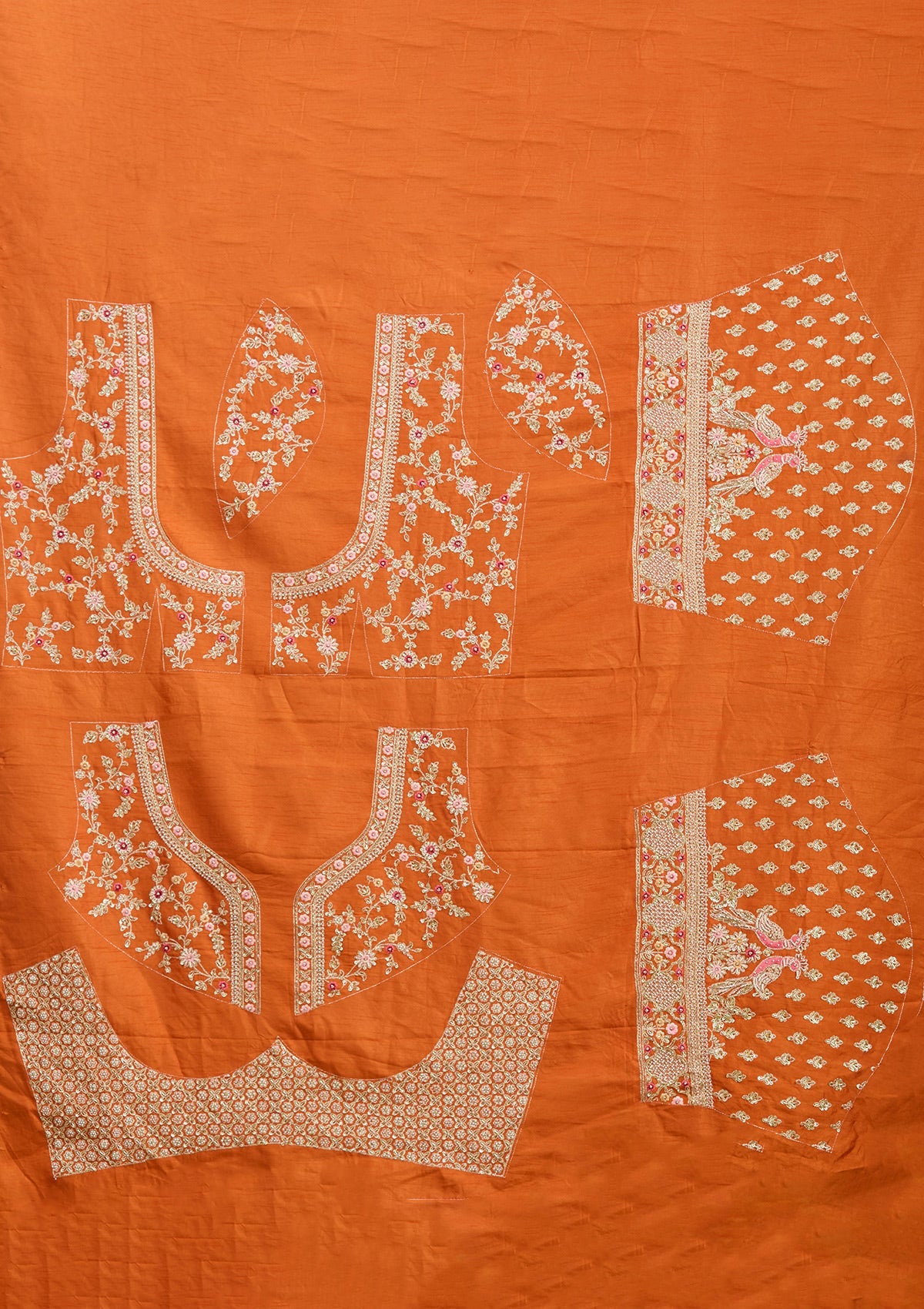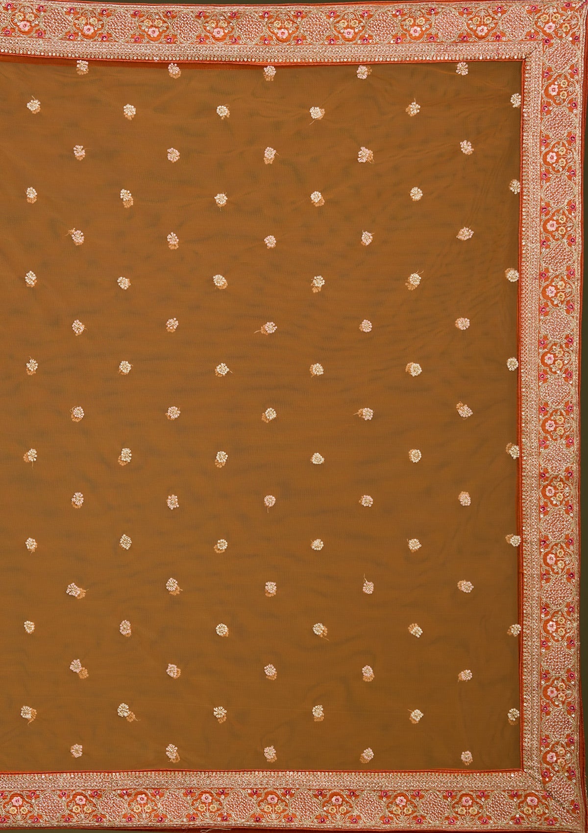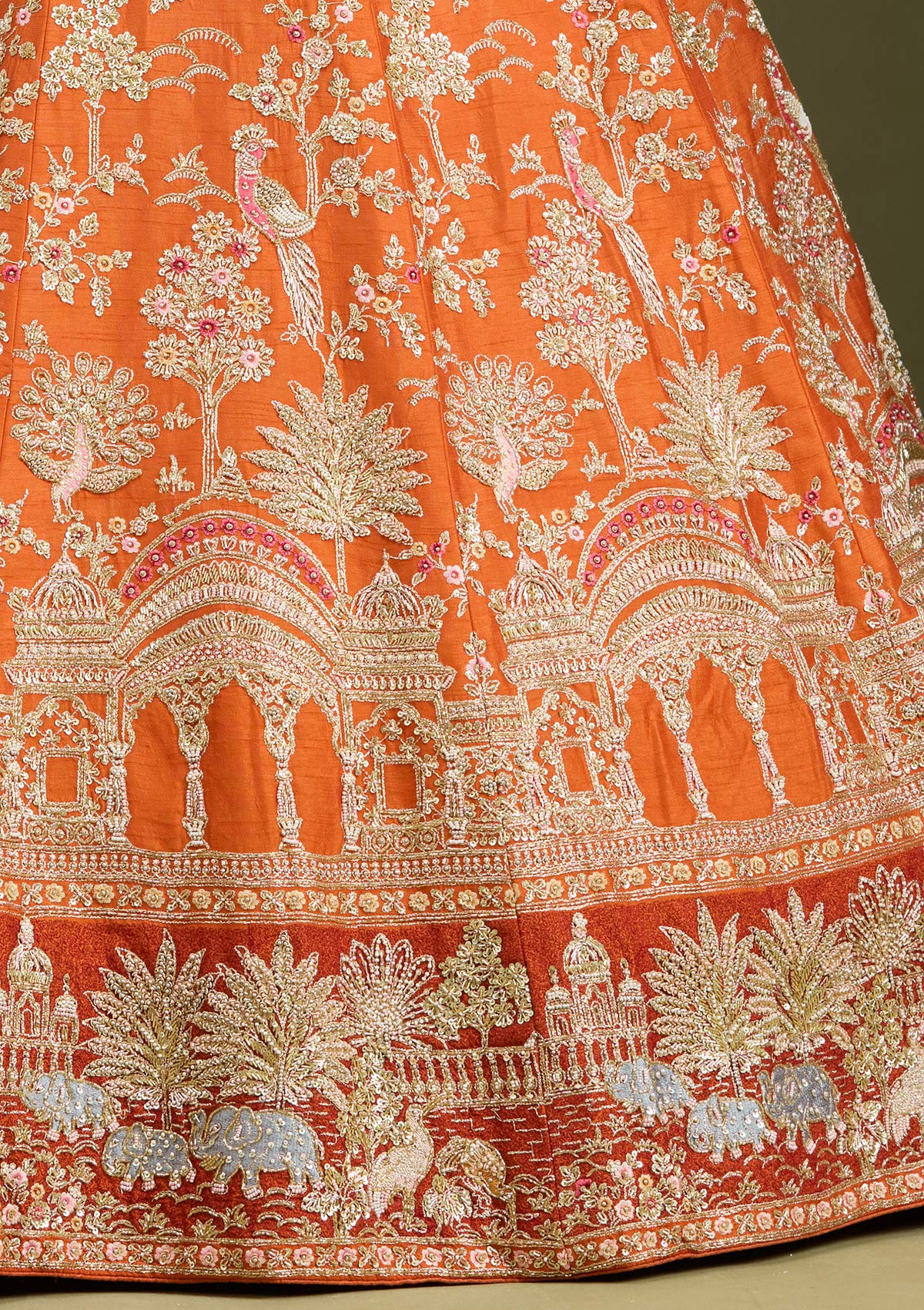 Rust Readymade Lehenga in Raw Silk fabric. The Lehenga is embellished with Zardozi (Gold) embroidery. Accompanied with an Readymade blouse and dupatta. Comes with the Koskii promise of premium quality.