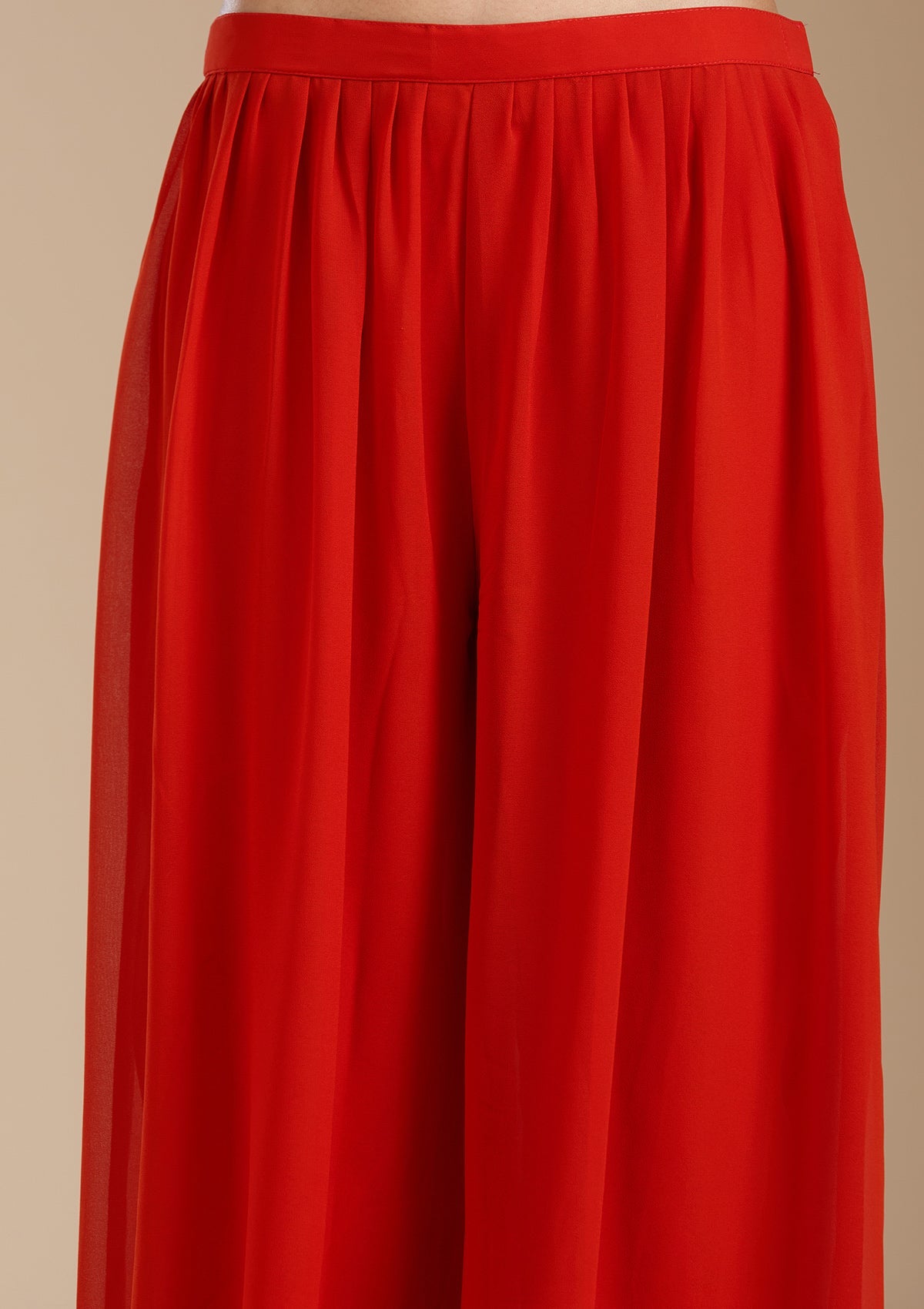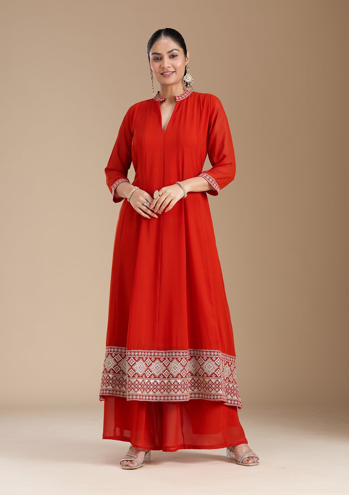 Rust Salwar Suit in Georgette fabric. The Salwar Suit is embellished with Zariwork (Gold) embroidery. Accompanied with a bottom and dupatta. Comes with the Koskii promise of premium quality.