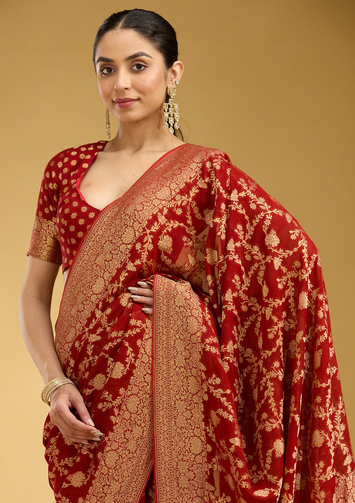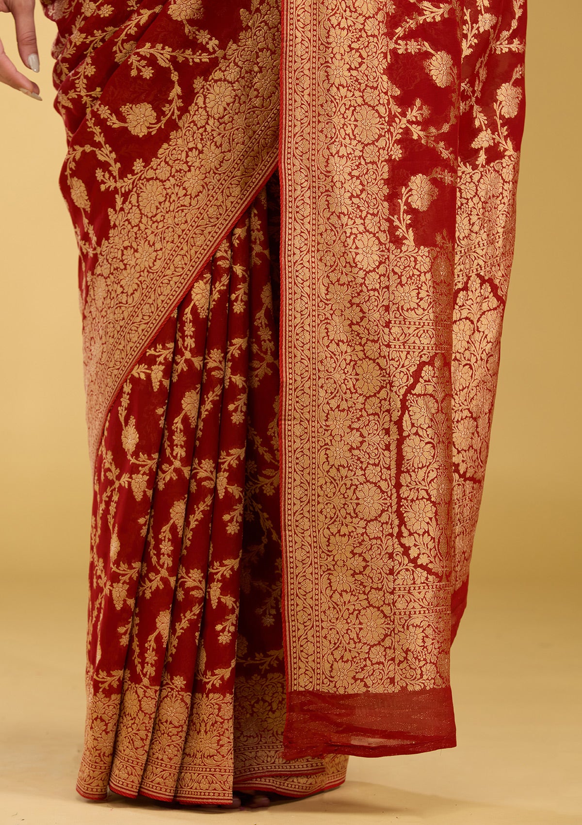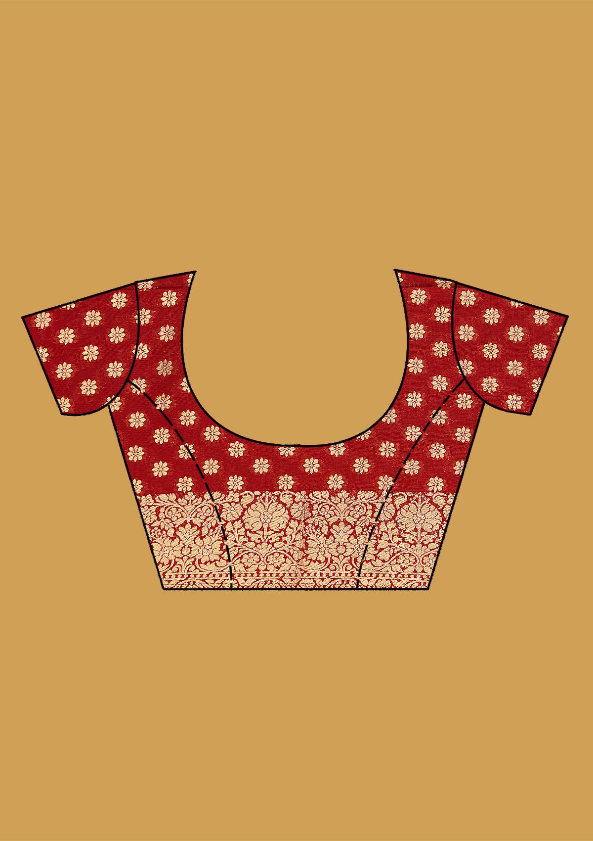 Rust Silk_Saree in Silk fabric. The Silk_Saree is elevated with Zariwork (Gold) embroidery. It comes with an Unstitched blouse. Comes with the Koskii promise of premium quality.